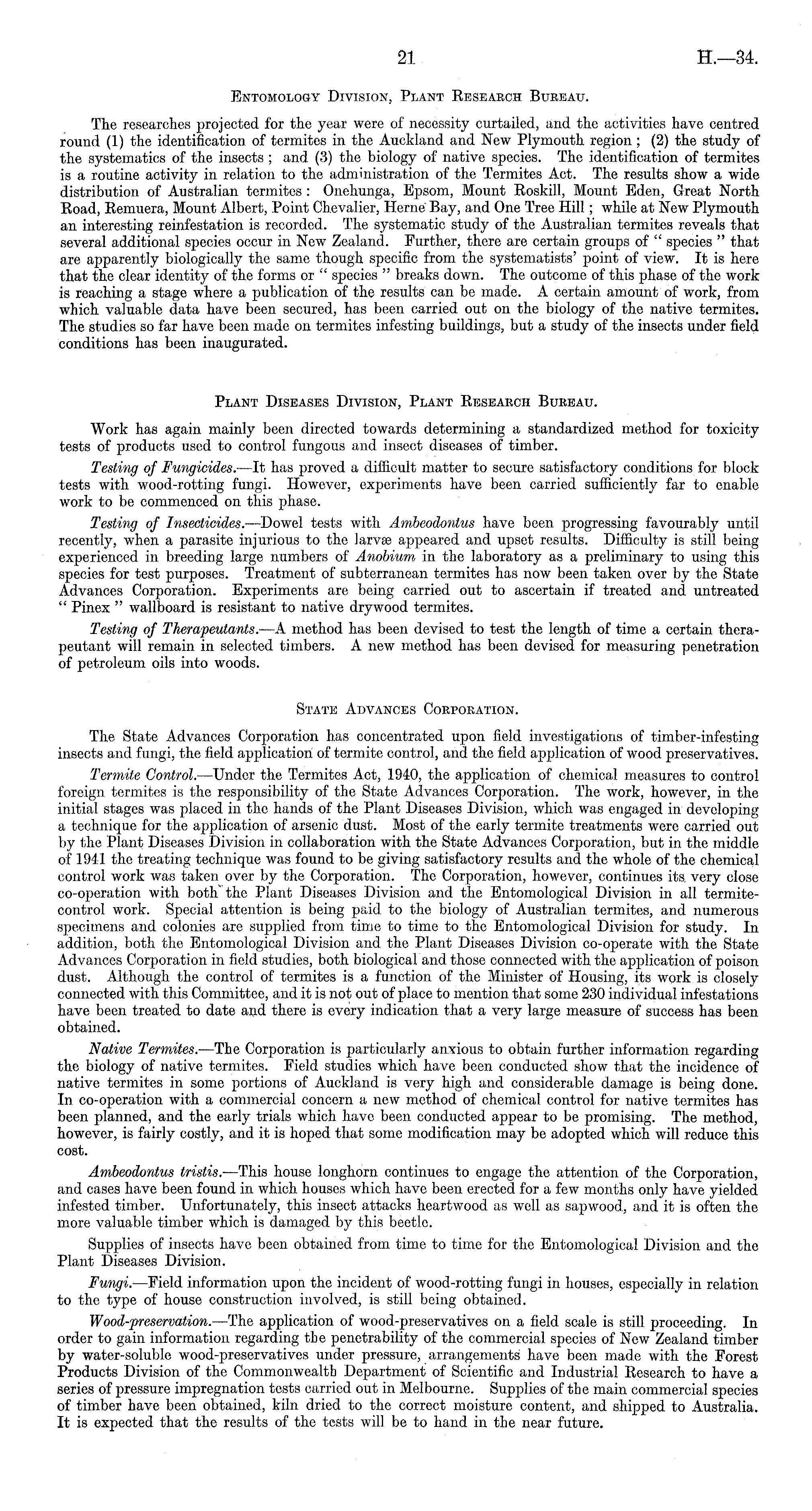 Entomology Division, Plant Research Bureau. The researches projected for the year were of necessity curtailed, and the activities have centred round (1) the identification of termites in the Auckland and New Plymouth region ; (2) the study of the systematics of the insects ; and (3) the biology of native species. The identification of termites is a routine activity in relation to the administration of the Termites Act. The results show a wide distribution of Australian termites : Onehunga, Epsom, Mount Roskill, Mount Eden, Great North Road, Remuera, Mount Albert, Point Chevalier, Heme Bay, and One Tree Hill; while at New Plymouth an interesting reinfestation is recorded. The systematic study of the Australian termites reveals that several additional species occur in New Zealand. Eurther, there are certain groups of " species " that are apparently biologically the same though specific from the systematists' point of view. It is here that the clear identity of the forms or " species " breaks down. The outcome of this phase of the work is reaching a stage where a publication of the results can be made. A certain amount of work, from which valuable data have been secured, has been carried out on the biology of the native termites. The studies so far have been made on termites infesting buildings, but a study of the insects under field conditions has been inaugurated. Plant Diseases Division, Plant Research Bureau. Work has again mainly been directed towards determining a standardized method for toxicity tests of products used to control fungous and insect diseases of timber. Testing of Fungicides. —It has proved a difficult matter to secure satisfactory conditions for block tests with wood-rotting fungi. However, experiments have been carried sufficiently far to enable work to be commenced on this phase. Testing of Insecticides. —Dowel tests with Ambeodontus have been progressing favourably until recently, when a parasite injurious to the larvae appeared and upset results. Difficulty is still being experienced in breeding large numbers of Anobium in the laboratory as a preliminary to using this species for test purposes. Treatment of subterranean termites has now been taken over by the State Advances Corporation. Experiments are being carried out to ascertain if treated and untreated " Pinex " wallboard is resistant to native drywood termites. Testing of Therapeutants. —A method has been devised to test the length of time a certain therapeutant will remain in selected timbers. A new method has been devised for measuring penetration of petroleum oils into woods. State Advances Corporation. The State Advances Corporation has concentrated upon field investigations of timber-infesting insects and fungi, the field application of termite control, and the field application of wood preservatives. Termite Control. —Under the Termites Act, 1940, the application of chemical measures to control foreign termites is the responsibility of the State Advances Corporation. The work, however, in the initial stages was placed in the hands of the Plant Diseases Division, which was engaged in developing a technique for the application of arsenic dust. Most of the early termite treatments were carried out by the Plant Diseases Division in collaboration with the State Advances Corporation, but in the middle of 1941 the treating technique was found to be giving satisfactory results and the whole of the chemical control work was taken over by the Corporation. The Corporation, however, continues its very close co-operation with both the Plant Diseases Division and the Entomological Division in all termitecontrol work. Special attention is being paid to the biology of Australian termites, and numerous specimens and colonies are supplied from time to time to the Entomological Division for study. In addition, both the Entomological Division and the Plant Diseases Division co-operate with the State Advances Corporation in field studies, both biological and those connected with the application of poison dust. Although the control of termites is a function of the Minister of Housing, its work is closely connected with this Committee, and it is not out of place to mention that some 230 individual infestations have been treated to date and there is every indication that a very large measure of success has been obtained. Native Termites. —The Corporation is particularly anxious to obtain further information regarding the biology of native termites. Field studies which have been conducted show that the incidence of native termites in some portions of Auckland is very high and considerable damage is being done. In co-operation with a commercial concern a new method of chemical control for native termites has been planned, and the early trials which have been conducted appear to be promising. The method, however, is fairly costly, and it is hoped that some modification may be adopted which will reduce this cost. Ambeodontus tristis. —This house longhorn continues to engage the attention of the Corporation, and cases have been found in which houses which have been erected for a few months only have yielded infested timber. Unfortunately, this insect attacks heartwood as well as sapwood., and it is often the more valuable timber which is damaged by this beetle. Supplies of insects have been obtained from time to time for the Entomological Division and the Plant Diseases Division. Fungi.—meld information upon the incident of wood-rotting fungi in houses, especially in relation to the type of house construction involved, is still being obtained. Wood-preservation.—The application of wood-preservatives on a field scale is still proceeding. In order to gain information regarding the penetrability of the commercial species of New Zealand timber by water-soluble wood-preservatives under pressure, arrangements have been made with the Forest Products Division of the Commonwealth Department of Scientific and Industrial Resea