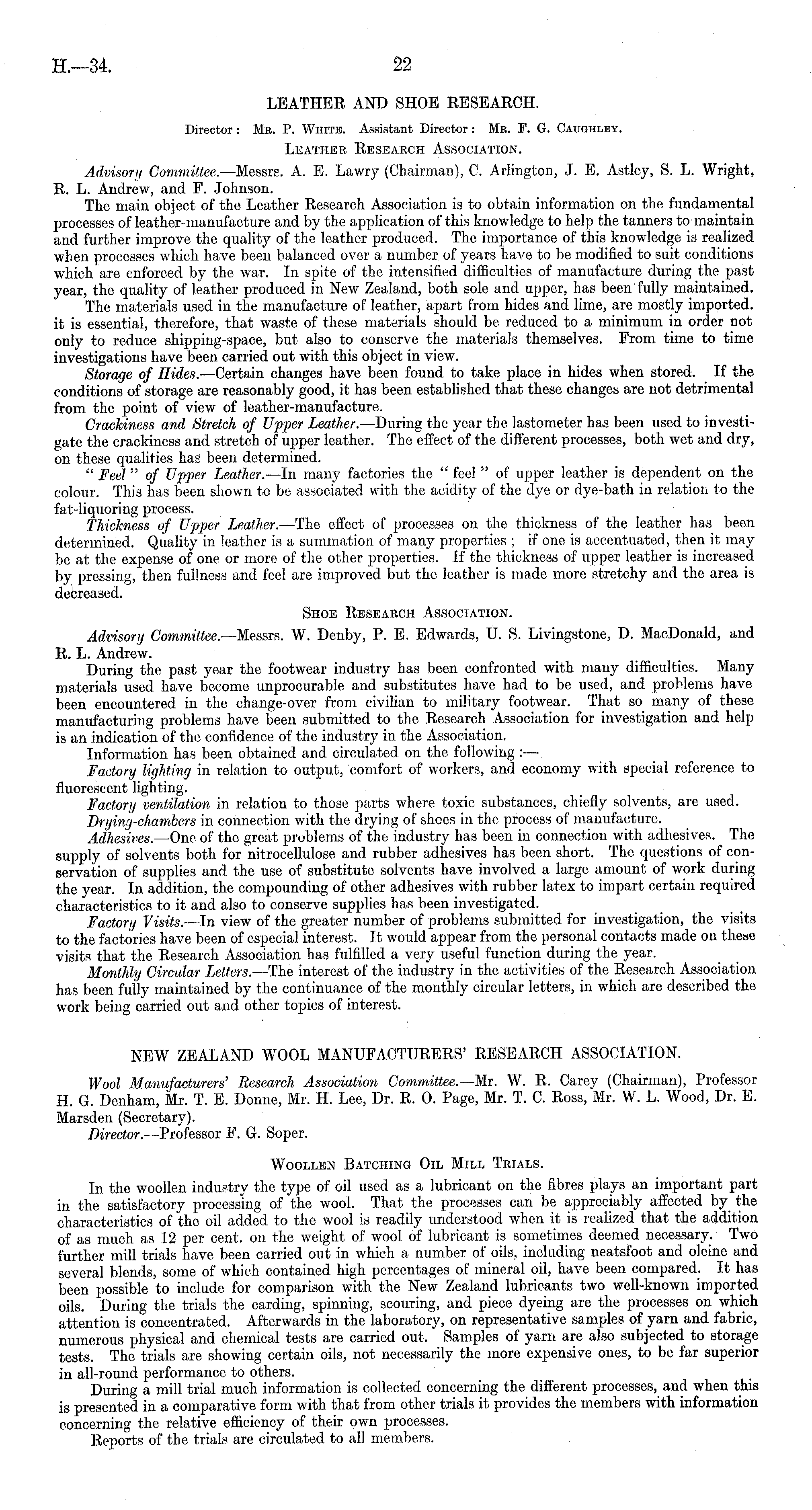 LEATHER AND SHOE RESEARCH. Director: Mb. I'. White. Assistant Director: Mb. F. G. Caughley. Leather Research Association. Advisory Committee. —Messrs. A. E. Lawry (Chairman), C. Arlington, J. E. Astley, S. L. Wright, R. L. Andrew, and F. Johnson. The main object of the Leather Research Association is to obtain information on the fundamental processes of leather-manufacture and by the application of this knowledge to help the tanners to maintain and further improve the quality of the leather produced. The importance of this knowledge is realized when processes which have been balanced over a number of years have to be modified to suit conditions which are enforced by the war. In spite of the intensified difficulties of manufacture during the past year, the quality of leather produced in New Zealand, both sole and upper, has been fully maintained. The materials used in the manufacture of leather, apart from hides and lime, are mostly imported, it is essential, therefore, that waste of these materials should be reduced to a minimum in order not only to reduce shipping-space, but also to conserve the materials themselves. From time to time investigations have been carried out with this object in view. Storage of Hides. —Certain changes have been found to take place in hides when stored. If the conditions of storage are reasonably good, it has been established that these changes are not detrimental from the point of view of leather-manufacture. Craclciness and Stretch of Upper Leather. —During the year the lastometer has been used to investigate the crackiness and stretch of upper leather. The effect of the different processes, both wet and dry, on these qualities has been determined. " Feel" of Upper Leather.—ln many factories the " feel "of upper leather is dependent on the colour. This has been shown to be associated with the acidity of the dye or dye-bath in relation to the fat-liquoring process. Thickness of Upper Leather.—The effect of processes on the thickness of the leather has been determined. Quality in leather is a summation of many properties ; if one is accentuated, then it may be at the expense of one or more of the other properties. If the thickness of upper leather is increased by pressing, then fullness and feel are improved but the leather is made more stretchy and the area is decreased. Shoe Research Association. Advisory Committee. —Messrs. W. Denby, P. E. Edwards, U. S. Livingstone, D. Mac Donald, and R. L. Andrew. During the past year the footwear industry has been confronted with many difficulties. Many materials used have become unprocurable and substitutes have had to be used, and problems have been encountered in the change-over from civilian to military footwear. That so many of these manufacturing problems have been submitted to the Research Association for investigation and help is an indication of the confidence of the industry in the Association. Information has been obtained and circulated on the following : — Factory lighting in relation to output, comfort of workers, and economy with special reference to fluorescent lighting. Factory ventilation in relation to those parts where toxic substances, chiefly solvents, arc used. Drying-chambers in connection with the drying of shoes in the process of manufacture. Adhesives.—One of the great problems of the industry has been in connection with adhesives. The supply of solvents both for nitrocellulose and rubber adhesives has been short. The questions of conservation of supplies and the use of substitute solvents have involved a large amount of work during the year. In addition, the compounding of other adhesives with rubber latex to impart certain required characteristics to it and also to conserve supplies has been investigated. Factory Visits. —In view of the greater number of problems submitted for investigation, the visits to the factories have been of especial interest. It would appear from the personal contacts made on these visits that the Research Association has fulfilled a very useful function during the year. Monthly Circular Letters. —The interest of the industry in the activities of the Research Association has been fully maintained by the continuance of the monthly circular letters, in which are described the work being carried out and other topics of interest. NEW ZEALAND WOOL MANUFACTURERS' RESEARCH ASSOCIATION. Wool Manufacturers' Research Association Committee. —Mr. W. R. Carey (Chairman), Professor H. G. Denham, Mr. T. E. Donne, Mr. H. Lee, Dr. R. 0. Page, Mr. T. C. Ross, Mr. W. L. Wood, Dr. E. Marsden (Secretary). Director. —Professor F. G. Soper. Woollen Batching Oil Mill Trials. In the woollen industry the type of oil used as a lubricant on the fibres plays an important part in the satisfactory processing of the wool. That the processes can be appreciably affected by the characteristics of the oil added to the wool is readily understood when it is realized that the addition of as much as 12 per cent, on the weight of wool of lubricant is sometimes deemed necessary. Two further mill trials have been carried out in which a number of oils, including neatsfoot and oleine and several blends, some of which contained high percentages of mineral oil, have been compared. It has been possible to include for comparison with the New Zealand lubricants two well-known imported oils. During the trials the carding, spinning, scouring, and piece dyeing are the processes on which attention is concentrated. Afterwards in the laboratory, on representative samples of yarn and fabric, numerous physical and chemical tests are carried out. Samples of yarn are also subjected to storage tests. The trials are showing certain oils, not necessarily the more expensive ones, to be far superior in all-round performance to others. During a mill trial much information is collected concerning the different processes, and when this is presented in a comparative form with that from other trials it provides