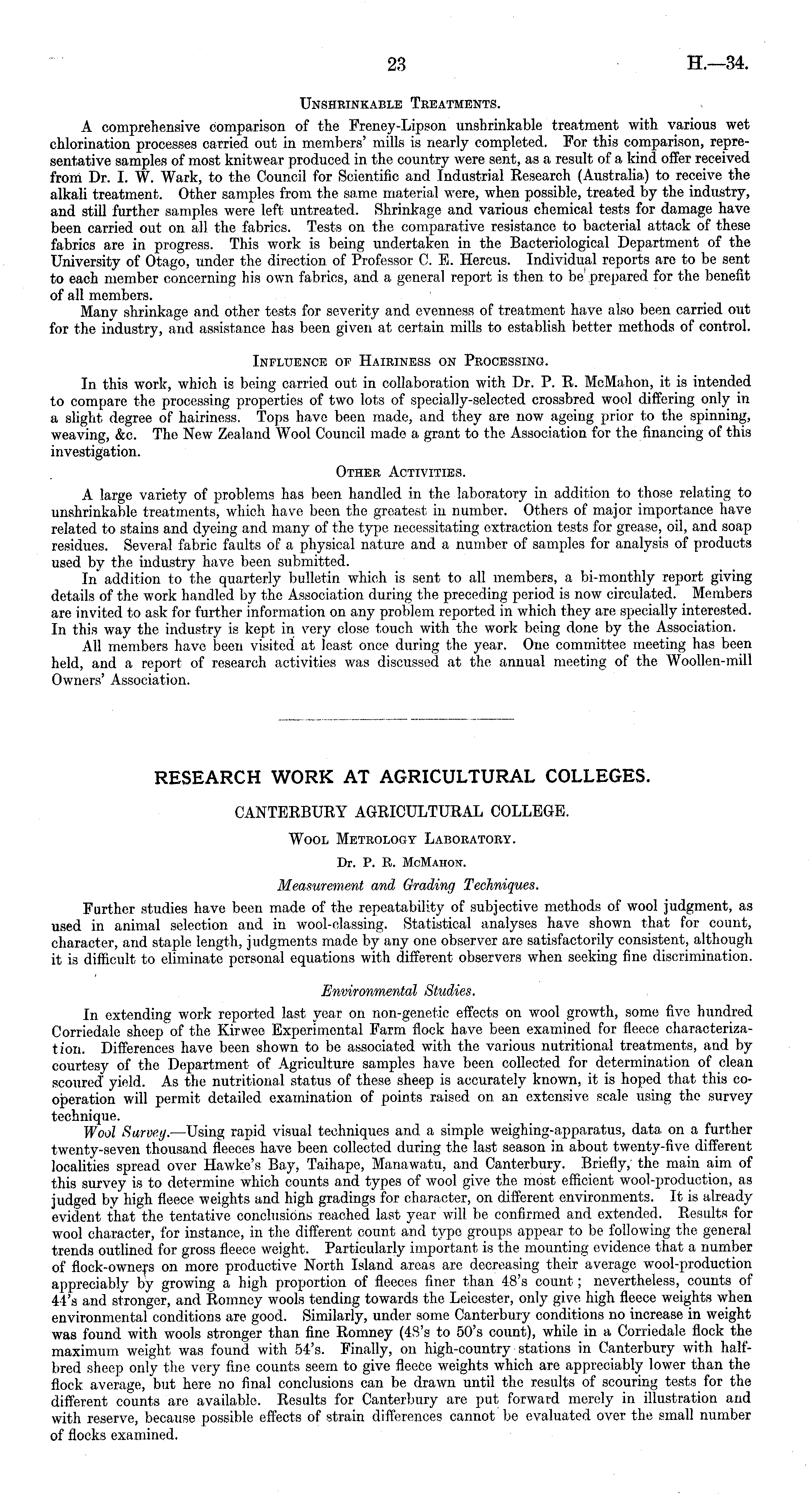 Unshrinkable Treatments. A comprehensive comparison of the Freney-Lipson unshrinkable treatment with various wet chlorination processes carried out in members' mills is nearly completed. For this comparison, representative samples of most knitwear produced in the country were sent, as a result of a kind offer received from Dr. I. W. Wark, to the Council for Scientific and Industrial Research (Australia) to receive the alkali treatment. Other samples from the same material were, when possible, treated by the industry, and still further samples were left untreated. Shrinkage and various chemical tests for damage have been carried out on all the fabrics. Tests on the comparative resistance to bacterial attack of these fabrics are in progress. This work is being undertaken in the Bacteriological Department of the University of Otago, under the direction of Professor C. E. Herons. Individual reports are to be sent to each member concerning his own fabrics, and a general report is then to be'prepared for the benefit of all members. Many shrinkage and other tests for severity and evenness of treatment have also been carried out for the industry, and assistance has been given at certain mills to establish better methods of control. Influence op Hairiness on Processing. In this work, which is being carried out in collaboration with Dr. P. It. McMahon, it is intended to compare the processing properties of two lots of specially-selected crossbred wool differing only in a slight degree of hairiness. Tops have been made, and they are now ageing prior to the spinning, weaving, &c. The New Zealand Wool Council made a grant to the Association for the financing of this investigation. Other Activities. A large variety of problems has been handled in the laboratory in addition to those relating to unshrinkable treatments, which have been the greatest in number. Others of major importance have related to stains and dyeing and many of the type necessitating extraction tests for grease, oil, and soap residues. Several fabric faults of a physical nature and a number of samples for analysis of products used by the industry have been submitted. In" addition to the quarterly bulletin which is sent to all members, a bi-monthly report giving details of the work handled by the Association during the preceding period is now circulated. Members are invited to ask for further information on any problem reported in which they are specially interested. In this way the industry is kept in very close touch with the work being done by the Association. All members have been visited at least once during the year. One committee meeting has been held, and a report of research activities was discussed at the annual meeting of the Woollen-mill Owners' Association. RESEARCH WORK AT AGRICULTURAL COLLEGES. CANTERBURY AGRICULTURAL COLLEGE. Wool Metrology Laboratory. Dr. P. R. McMahon. Measurement and Grading Techniques. Further studies have been made of the repeatability of subjective methods of wool judgment, as used in animal selection and in wool-olassing. Statistical analyses have shown that for count, character, and staple length, judgments made by any one observer are satisfactorily consistent, although it is difficult to eliminate personal equations with different observers when seeking fine discrimination. Environmental Studies. In extending work reported last year on non-genetic effects on wool growth, some five hundred Corriedale sheep of the Kirwee Experimental Farm flock have been examined for fleece characterization. Differences have been shown to be associated with the various nutritional treatments, and by courtesy of the Department of Agriculture samples have been collected for determination of clean scoured' yield. As the nutritional status of these sheep is accurately known, it is hoped that this cooperation will permit detailed, examination of points raised on an extensive scale using the survey technique. Wool Survey. —Using rapid visual techniques and a simple weighing-apparatus, data, on a further twenty-seven thousand fleeces have been collected during the last season in about twenty-five different localities spread over Hawke's Bay, Taihape, Manawatu, and Canterbury. Briefly, the main aim of this survey is to determine which counts and types of wool give the most efficient wool-production, as judged by high fleece weights and high gradings for character, on different environments. It is already evident that the tentative conclusions reached last year will be confirmed and extended. Results for wool character, for instance, in the different count and type groups appear to be following the general trends outlined for gross fleece weight. Particularly important is the mounting evidence that a number of flock-owners on more productive North Island areas are decreasing their average wool-production appreciably by growing a high proportion of fleeces finer than 48's count; nevertheless, counts of 44's and stronger, and Romney wools tending towards the Leicester, only give high fleece weights when environmental conditions are good. Similarly, under some Canterbury conditions no increase in weight was found with wools stronger than fine Romney (48's to 50's count), while in a Corriedale flock the maximum weight was found with 54's. Finally, 011 high-country stations in Canterbury with halfbred sheep only the very fine counts seem to give fleece weights which are appreciably lower than the flock average, but here no final conclusions can be drawn until the results of scouring tests for the different counts are available. Results for Canterbury are put forward merely in illustration and with reserve, because possible effects of strain differences cannot be evaluated over the small number of flocks examined.