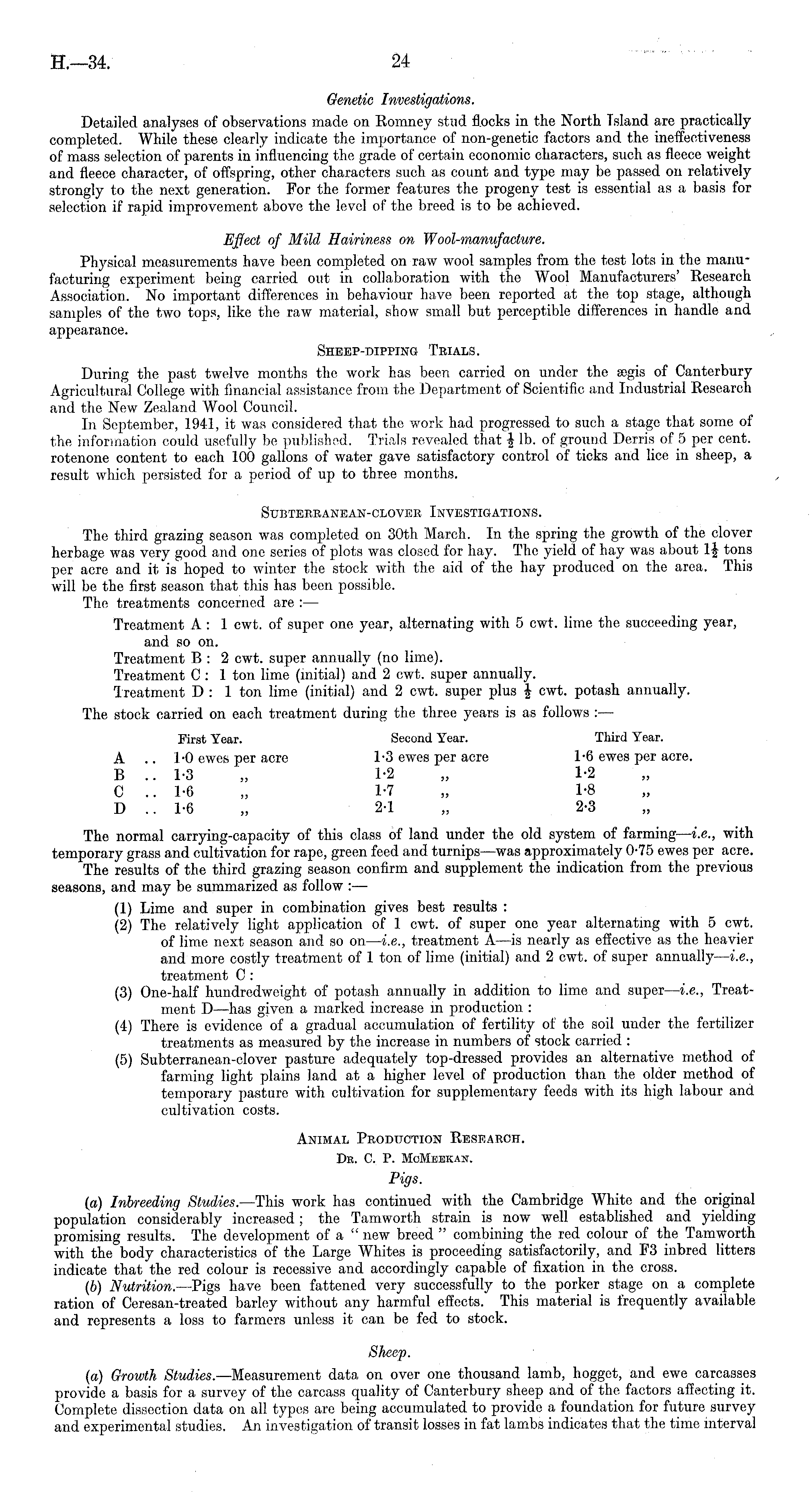 Genetic Investigations. Detailed analyses of observations made on Romney stud flocks in the North Island are practically completed. While these clearly indicate the importance of non-genetic factors and the ineffectiveness of mass selection of parents in influencing the grade of certain economic characters, such as fleece weight and fleece character, of offspring, other characters such as count and type may be passed on relatively strongly to the next generation. For the former features the progeny test is essential as a basis for selection if rapid improvement above the level of the breed is to be achieved. Effect of Mild Hairiness on Wool-manufacture. Physical measurements have been completed on raw wool samples from the test lots in the manufacturing experiment being carried out in collaboration with the Wool Manufacturers' Research Association. No important differences in behaviour have been reported at the top stage, although samples of the two tops, like the raw material, show small but perceptible differences in handle and appearance. Sheep-dipping Trials. During the past twelve months the work has been carried on under the a)gis of Canterbury Agricultural College with financial assistance from the Department of Scientific and Industrial Research and the New Zealand Wool Council. In September, 1941, it was considered that the work had progressed to such a stage that some of the information could usefully be published. Trials revealed that | lb. of ground Derris of 5 per cent, rotenone content to each 100 gallons of water gave satisfactory control of ticks and lice in sheep, a result which persisted for a period of up to three months. Subterranean-clover Investigations. The third grazing season was completed on 30th March. In the spring the growth of the clover herbage was very good and one series of plots was closed for hay. The yield of hay was about 1 \ tons per acre and it is hoped to winter the stock with the aid of the hay produced on the area. This will be the first season that this has been possible. The treatments concerned are Treatment A : 1 cwt. of super one year, alternating with 5 cwt. lime the succeeding year, and so on. Treatment B : 2 cwt. super annually (no lime). Treatment C : 1 ton lime (initial) and 2 cwt. super annually. Treatment D : 1 ton lime (initial) and 2 cwt. super plus £ cwt. potash annually. The stock carried on each treatment during the three years is as follows : — First Year. Second Year. Third Year. A .. 1-0 ewes per acre 1-3 ewes per acre 1-6 ewes per acre. B .. 1-3 „ 1-2 „ 1-2 C ..1-6 „ 1-7 „ 1-8 D .. 1-6 „ 2-1 „ 2-3 The normal carrying-capacity of this class of land under the old system of farming—i.e., with temporary grass and cultivation for rape, green feed and turnips —was approximately 0-75 ewes per acre. The results of the third grazing season confirm and supplement the indication from the previous seasons, and may be summarized as follow : — (1) Lime and super in combination gives best results : (2) The relatively light application of 1 cwt. of super one year alternating with 5 cwt. of lime next season and so on —i.e., treatment A—is nearly as effective as the heavier and more costly treatment of 1 ton of lime (initial) and 2 cwt. of super annually—i.e., treatment C : (3) One-half hundredweight of potash annually in addition to lime and super—-i.e., Treatment D —has given a marked increase in production : (4) There is evidence of a gradual accumulation of fertility of the soil under the fertilizer treatments as measured by the increase in numbers of stock carried : (5) Subterranean-clover pasture adequately top-dressed provides an alternative method of farming light plains land at a higher level of production than the older method of temporary pasture with cultivation for supplementary feeds with its high labour and cultivation costs. Animal Production Research. Dr. C. P. MoMeekan. Pigs. (a) Inbreeding Studies.—This work has continued with the Cambridge White and the original population considerably increased; the Tamworth strain is now well established and yielding promising results. The development of a " new breed " combining the red colour of the Tamworth with the body characteristics of the Large Whites is proceeding satisfactorily, and F3 inbred litters indicate that the red colour is recessive and accordingly capable of fixation in the cross. (b) Nutrition. —Pigs have been fattened very successfully to the porker stage on a complete ration of Ceresan-treated barley without any harmful effects. This material is frequently available and represents a loss to farmers unless it can be fed to stock. Sheep. (a) Growth Studies. —Measurement data on over one thousand lamb, hogget, and ewe carcasses provide a basis for a survey of the carcass quality of Canterbury sheep and of the factors affecting it. Complete dissection data on all types are being accumulated to provide a foundation for future survey and experimental studies. An investigation of transit losses in fat lambs indicates that the time interval