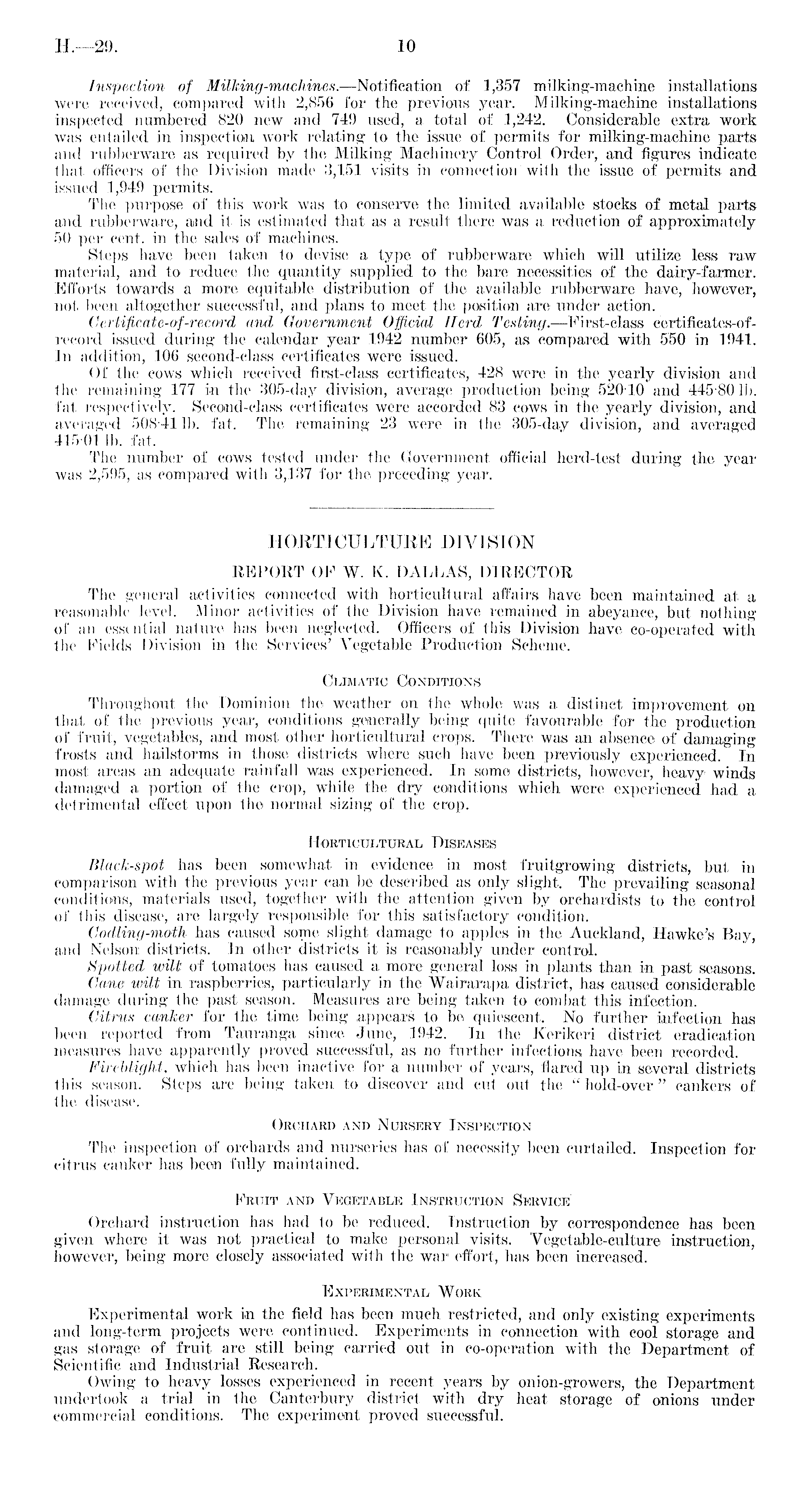 Inspection of Milking-machines.-—Notification of 1,357 milking-machine installations were received, compared with 2,856 for the previous year. Milking-machine installations inspected numbered 820 new and 749 used, a total of 1,242. Considerable extra work was entailed in inspection work relating to the issue of permits for milking-machine parts and rubberware as required by the Milking Machinery Control Order, and figures indicate that officers of the Division made 3,151 visits in connection with the issue of permits and issued 1,949 permits. The purpose of this work was to conserve the limited available stocks of metal parts and rubberware, and it is estimated that as a result there was a reduction of approximately 50 per cent, in the sales of machines. Steps have been taken to devise a type of rubberware which will utilize less raw material, and to reduce the quantity supplied to the bare necessities of the dairy-farmer. Efforts towards a more equitable distribution of the available rubberware have, however, not been altogether successful, and plans to meet the position are under action. Certificate-of-record and Government Official Herd Testing.—First-class certificates-of-record issued during the calendar year 1942 number 605, as compared with 550 in 1941. In addition, 106 second-class certificates were issued. Of the cows which received first-class certificates, 428 were in the yearly division and the remaining 177 in the 305-day division, average production being 52010 and 445 801b. fat respectively. Second-class certificates were accorded 83 cows in the yearly division, and averaged 50841 lb. fat. The remaining 23 were in the 305-day division, and averaged 415 011b. fat. The number of cows tested under the Government official herd-test during the year was 2,595, as compared with 3,137 for the preceding year.