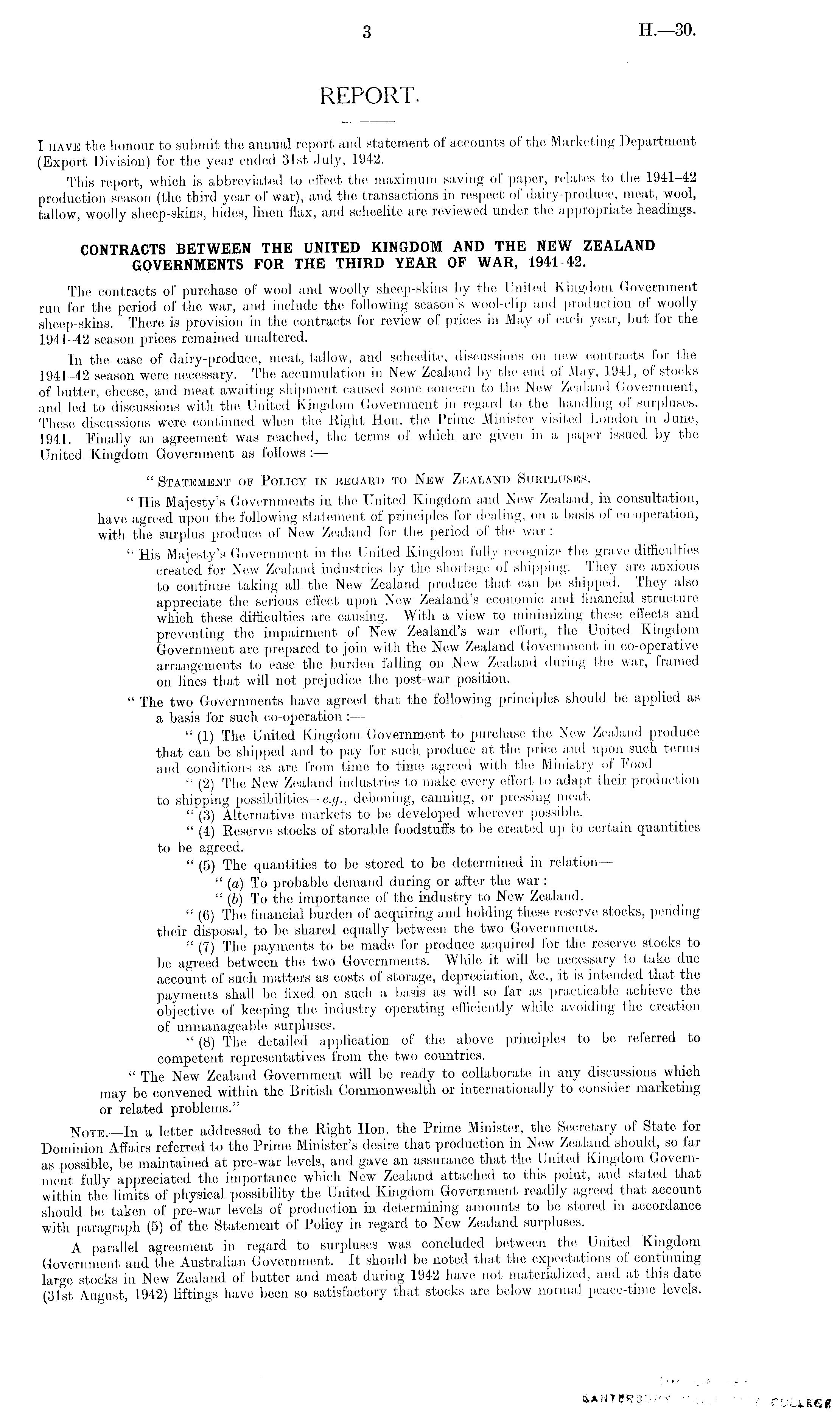 I have the honour to submit the annual report and statement of accounts of the Marketing Department (Export Division) for the year ended 31st July, 1942. This report, which is abbreviated to effect the maximum saving of paper, relates to the 1941-42 production season (the third year of war), and the transactions in respect of dairy-produce, meat, wool, tallow, woolly sheep-skins, hides, linen flax, and scheelite are reviewed under the appropriate headings. CONTRACTS BETWEEN THE UNITED KINGDOM AND THE NEW ZEALAND GOVERNMENTS FOR THE THIRD YEAR OF WAR, 1941-42. The contracts of purchase of wool and woolly sheep-skins by the United Kingdom Government run for the period of the war, and include the following season's wool-clip and production of woolly sheep-skins. There is provision in the contracts for review of prices in May of each year, but for the 1941-42 season prices remained unaltered. In the case of dairy-produce, meat, tallow, and scheelite, discussions on new contracts for the 1941-42 season were necessary. The accumulation in New Zealand by the end of May, 1941, of stocks of butter, cheese, and meat awaiting shipment caused some concern to the New Zealand Government, and led to discussions with the United Kingdom Government in regard to the handling of surpluses. These discussions were continued when the Right Hon. the Prime Minister visited London in June, 1941. Finally an agreement was reached, the terms of which are given in a paper issued by the United Kingdom Government as follows: — " Statement of Policy in kegabd to New Zealand Surpluses. " His Majesty's Governments in the United Kingdom and New Zealand, in consultation, have agreed upon the following statement of principles for dealing, on a basis of co-operation, with the surplus produce of New Zealand for the period of the war " His Majesty's Government in the United Kingdom fully recognize the grave difficulties created for New Zealand industries by the shortage of shipping. They are anxious to continue taking all the New Zealand produce that can be shipped. They also appreciate the serious effect upon New Zealand's economic and financial structure which these difficulties are causing. With a view to minimizing these effects and preventing the impairment of New Zealand's war effort, the United Kingdom Government are prepared to join with the New Zealand Government in co-operative arrangements to ease the burden falling on New Zealand during the war, framed on lines that will not prejudice the post-war position. " The two Governments have agreed that the following principles should be applied as a basis for such co-operation:— " (1) The United Kingdom Government to purchase the New Zealand produce that can be shipped and to pay for such produce at the price and upon such terms and conditions as are from time to time agreed with the Ministry of Food " (2) The New Zealand industries to make every effort to adapt their production to shipping possibilities—e.g., deboning, canning, or pressing meat. " (3) Alternative markets to be developed wherever possible. " (4) Reserve stocks of storable foodstuffs to be created up to certain quantities to be agreed. " (5) The quantities to be stored to be determined in relation — " (a) To probable demand during or after the war : " (&) To the importance of the industry to New Zealand. " (6) The financial burden of acquiring and holding these reserve stocks, pending their disposal, to be shared equally between the two Governments. " (7) The payments to be made for produce acquired, for the reserve stocks to be agreed between the two Governments. While it will be necessary to take due account of such matters as costs of storage, depreciation, &c., it is intended that the payments shall be fixed on such a basis as will so far as practicable achieve the objective of keeping the industry operating efficiently while avoiding the- creation of unmanageable surpluses. " (8) The detailed application of the above principles to be referred to competent representatives from the two countries. " The New Zealand Government will be ready to collaborate in any discussions which may be convened within the British Commonwealth or internationally to consider marketing or related problems." Note.—ln a letter addressed to the Right Hon. the Prime Minister, the Secretary of State for Dominion Affairs referred to the Prime Minister's desire that production in New Zealand should, so far as possible, be maintained at pre-war levels, and gave an assurance that the United Kingdom Government fully appreciated the importance which New Zealand attached to this point, and stated that within the limits of physical possibility the United Kingdom Government readily agreed that account should be taken of pre-war levels of production in determining amounts to be stored m accordance with paragraph (5) of the Statement of Policy in regard to New Zealand surpluses. A parallel agreement in regard to surpluses was concluded between the United Kingdom Government and the Australian Government. It should be. noted that the expectations of continuing large stocks in New Zealand of butter and meat during 1942 have not materialized, and at this date (31st August, 1942) liftings have been so satisfactory that stocks are below normal peace-time levels.