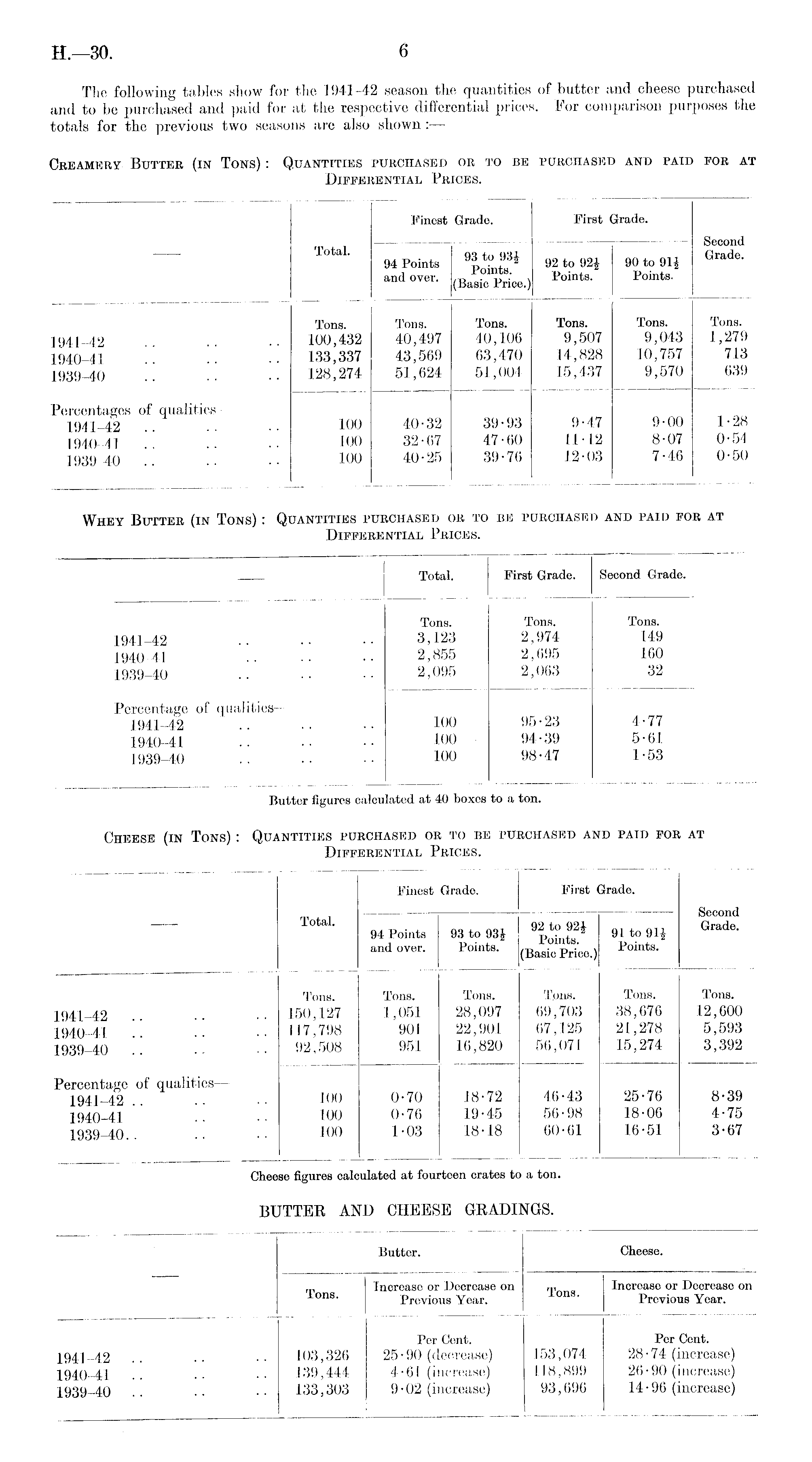 The following tables show for the 1941-42 season the quantities of butter and cheese purchased and to be purchased and paid for at the respective differential prices. For comparison purposes the totals for the previous two seasons are also shown : —