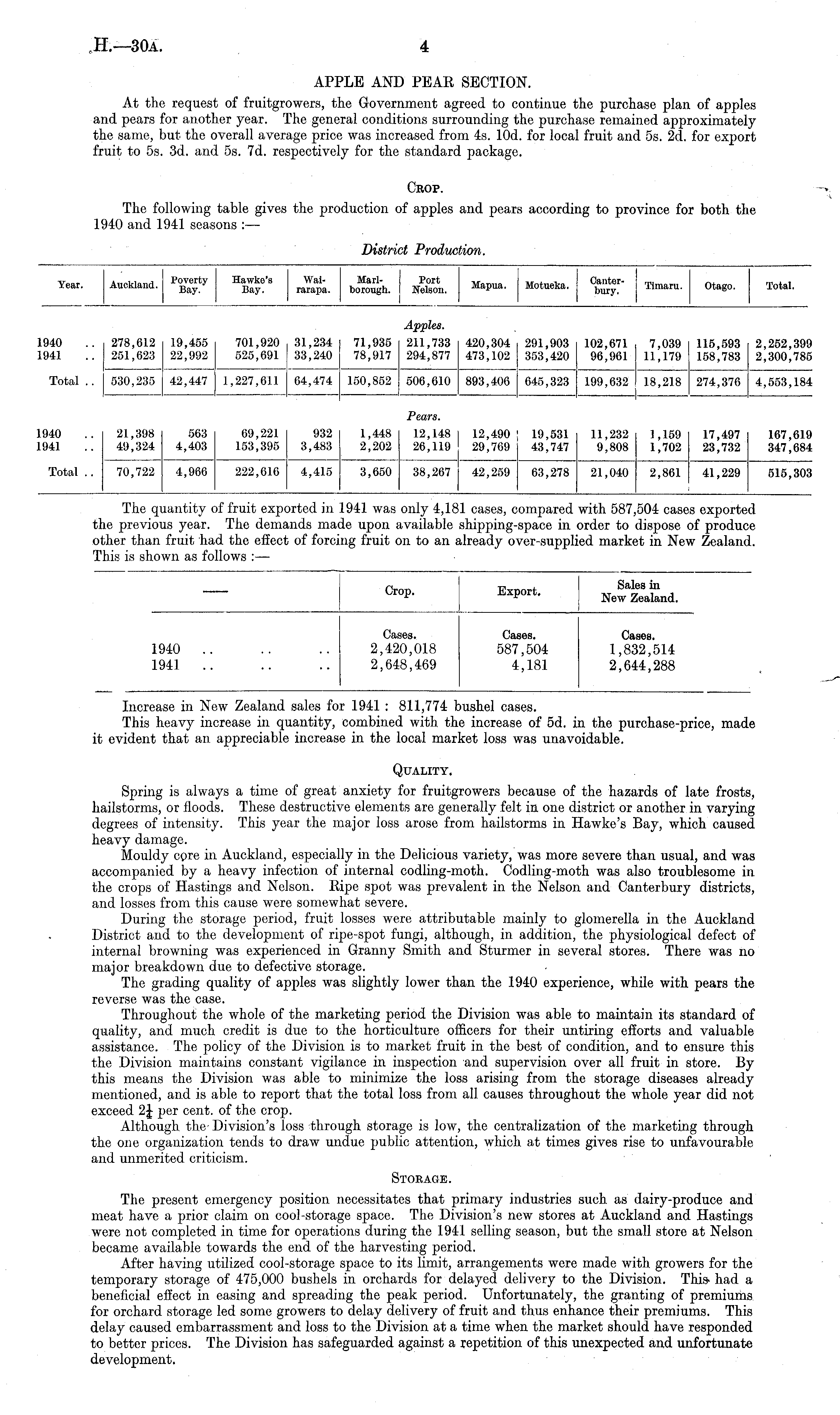 APPLE AND PEAR SECTION. At the request of fruitgrowers, the Government agreed to continue the purchase plan of apples and pears for another year. The general conditions surrounding the purchase remained approximately the same, but the overall average price was increased from 4s. lOd. for local fruit and ss. 2d. for export fruit to ss. 3d. and ss. 7d. respectively for the standard package. Crop. The following table gives the production of apples and pears according to province for both the 1940 and 1941 seasons :—