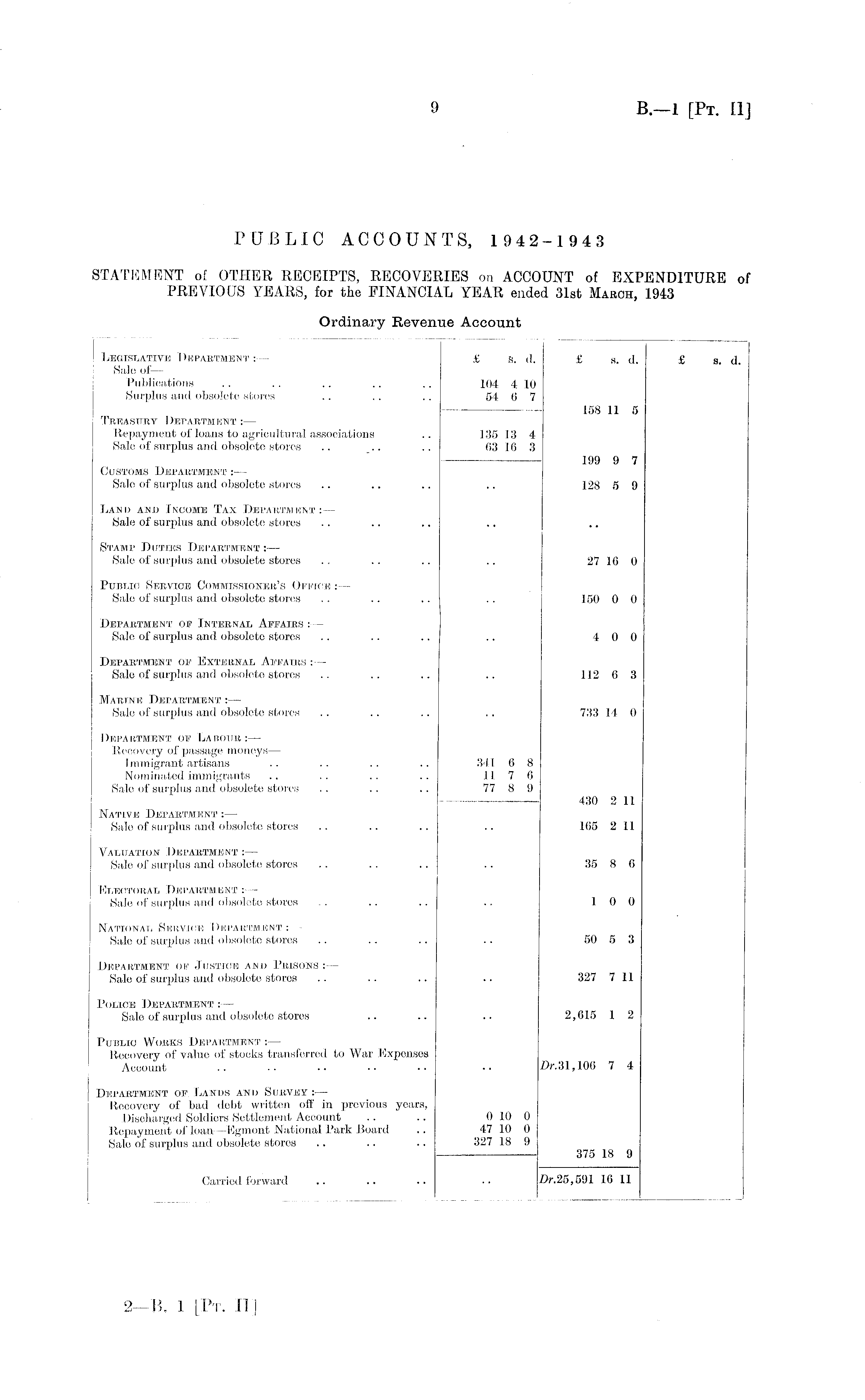 Legislative Department :— £ s. d. £ a. d. £ s. d. Sale of—• Publications .. .... .. .. 104 4 10 Surplus and obsolete stores .. .. .. 54 6 7 158 11 5 Treasury Department :— Repayment of loans to agricultural associations .. 135 13 4 Sale of surplus and obsolete stores .. .. .. 63 16 3 199 9 7 Customs Department : — Sale of surplus and obsolete stores .. .. .. .. 128 5 9 Land and Income Tax Department Sale of surplus and obsolete stores Stamp Duties Department :— Sale of surplus and obsolete stores .. . . .. .. 27 16 0 Public Service Commissioner's Office Sale of surplus and obsolete stores .. .. .. .. 150 0 0 Department of Internal Affairs :— Sale of surplus and obsolete stores .. .. .. .. 4 0 0 Department of External Affairs :— Sale of surplus and obsolete stores .. .. .. .. 11263 Marine Department :— Sale of surplus and obsolete stores .. .. .. .. 733 14 0 Department of Labour Recovery of passage moneys — Immigrant artisans .. .. .. .. 341 6 8 Nominated immigrants .. .. .. .. 11 7 6 Sale of surplus and obsolete stores . . .. .. 77 8 9 430 2 11 Native Department :— Sale of surplus and obsolete stores .. .. .. .. 165 2 11 Valuation Department :— Sale of surplus and obsolete stores .. .. .. .. 35 8 6 Electoral Department :— Sale of surplus and obsolete stores .. .. .. .. 10 0 National Service Department : — / Sale of surplus and obsolete stores .. .. .. .. 50 5 3 Department of Justice and Prisons : — Sale of surplus and obsolete stores .. .. .. .. 327 7 11 Police Department : — Sale of surplus and obsolete stores .. .. .. 2,615 1 2 Public Works Department :— Recovery of value of stocks transferred to War Expenses Account .. .. •• •• •• •• Dj-,31,106 7 4 Department of. Lands and Survey :— Recovery of bad debt written off in previous years, Discharged Soldiers Settlement Account .. .. 0 10 0 Repayment of loan —Egmont National Park Board .. 47 10 0 Sale of surplus and obsolete stores .. .. .. 327 18 9 375 18 9 Carried forward .. .. .. .. /Jr.25,591 16 11