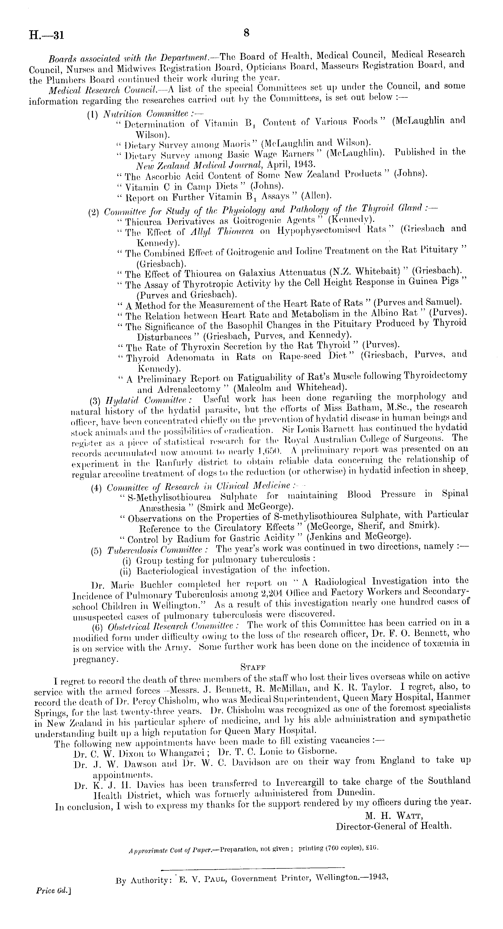 Boards associated with the Department—The Board of Health, Medical Council, Medical Research Council, Nurses and Midwives Registration Board, Opticians Board, Masseurs Registration Board, and the Plumbers Board continued their work during the year. Medical Research Council—A list of the special Committees set up under the Council, and some information regarding the researches carried out by the Committees, is set out below . (1) Nutrition Committee: — ' _ „ , „ ,„ T , " Determination of Vitamin Bj Content of Various Foods (McLaughlin and Wilson). " Dietary Survey among Maoris " (McLaughlin and Wilson). _ " Dietary Survey among Basic Wage Earners " (McLaughlin). Published in the New Zealand Medical Journal, April, 1943. " The Ascorbic Acid Content of Some New Zealand Products " (Johns). "Vitamin C in Camp Diets" (Johns). " Report on Further Vitamin B t Assays " (Allen). (2) Committee for Study of the Physiology and Pathology of the Thyroid Gland :— " Thiourea Derivatives as Goitrogenic Agents " (Kennedy). " The Effect of Allyl Thiourea on Hypophysectomised Rats " (Griesbach and Kennedy). ' 1V . ~ " The Combined Effect of Goitrogenic and lodine Treatment on the Rat I lt.uitary (Griesbach). . . " The Effect of Thiourea on Galaxius Attenuatus (N..Z. Whitebait) " The Assay of Thyrotropic Activity by the Cell Height Response in Guinea Pigs " (Purves and Griesbach). " A Method for the Measurement of the Heart Rate of Rats (Purves and bamuei). " The Relation between Heart Rate and Metabolism in the Albino Rat " (Purves). " The Significance of the Basophil Changes in the Pituitary Produced by Thyroid Disturbances " (Griesbach, Purves, and Kennedy). " The Rate of Thyroxin Secretion by the Rat Thyroid " (Purves). " Thyroid Adenomata in Rats on Rape-seed Diet (Griesbach, 1 urves, and " A PreHmmary Report on Fatiguability of Rat's Muscle following Thyroidectomy and Adrenalectomy " (Malcolm anil Whitehead). (3) Hydatid Committee: Useful work has been done regarding the morphology and natural history of the hydatid parasite, but the efforts of Miss Batham, M.Sc., the research officer, have been concentrated chiefly on the prevention of hydatid disease in human bemgs and stock animals and the possibilities of eradication. Sir Louis Barnett has continued the hydati register as a piece of statistical research for the Royal Australian College of Surgeons. Ihe records accumulated now amount to nearly 1,650. A preliminary report was presented on an experiment in the Ranfurly district to obtain reliable data concerning the relationship of regular arecoline treatment of dogs to the reduction (or otherwise) in hydatid infection m sheep. (4) Committee of Research in Clinical Medicine : — a . . " S-Methylisothiourea Sulphate for maintaining Blood Pressure in bpmal Anaesthesia " (Smirk and McGeorge). " Observations on the Properties of S-methylisothiourea Sulphate, with Particular Reference to the Circulatory Effects (McGeorge, feherif, and Smirk). " Control by Radium for Gastric Acidity " (Jenkins and McGeorge). (5) Tuberculosis Committee : The year's work was continued in two directions, namely (i) Group testing for pulmonary tuberculosis : (ii) Bacteriological investigation of the infection. Dr Marie Buchler completed her report on "A Radiological Investigation into the Incidence of Pulmonary Tuberculosis among 2,204 Office and Factory Workers and Secondaryschool Children in Wellington." As a result of this investigation nearly one hundred cases of unsuspected cases of pulmonary tuberculosis were discovered. (6) Obstetrical Research Committee : The work of this Committee has been carried on m a modified form under difficulty owing to the loss of the research officer, Dr. F. 0. Bennett, who is on service with the Army. Some further work has been done on the incidence of toxajnna m pregnancy. Staff I resret to record the death of three members of the staff who lost their lives overseas while on active service with the armed forces-Messrs. J. Bennett, R. McMillan, and K R. Taylor. I regret, also, to record the death of Dr. Percy Chisholm, who was Medical Superintendent, Queen Mary Hospital, Hanmer Springs for the last twenty-three years. Dr. Chisholm was recognized as one of the foremost specialists in New' Zealand in his particular sphere of medicine, and by his able administration and sympathetic understanding built up a high reputation for Queen Mary Hospital. The following new appointments have been made to fill existing vacancies : Dr. C. W. Dixon to Whangarei; Dr. T. C. Louie to Gisborne. Dr. J. W. Dawson and Dr. W. C. Davidson are on their way from England to take up Dr. K.' j. H. Davies lias been transferred to Invercargill to take charge of the Southland Health District, which was formerly administered from Dunedin. In conclusion, I wish to express my thanks for the support rendered by my officers during the year. M. H. Watt, Director-General of Health. Approximate Cost of Paper.—Preparation, not given; printing (760 copies), £18.