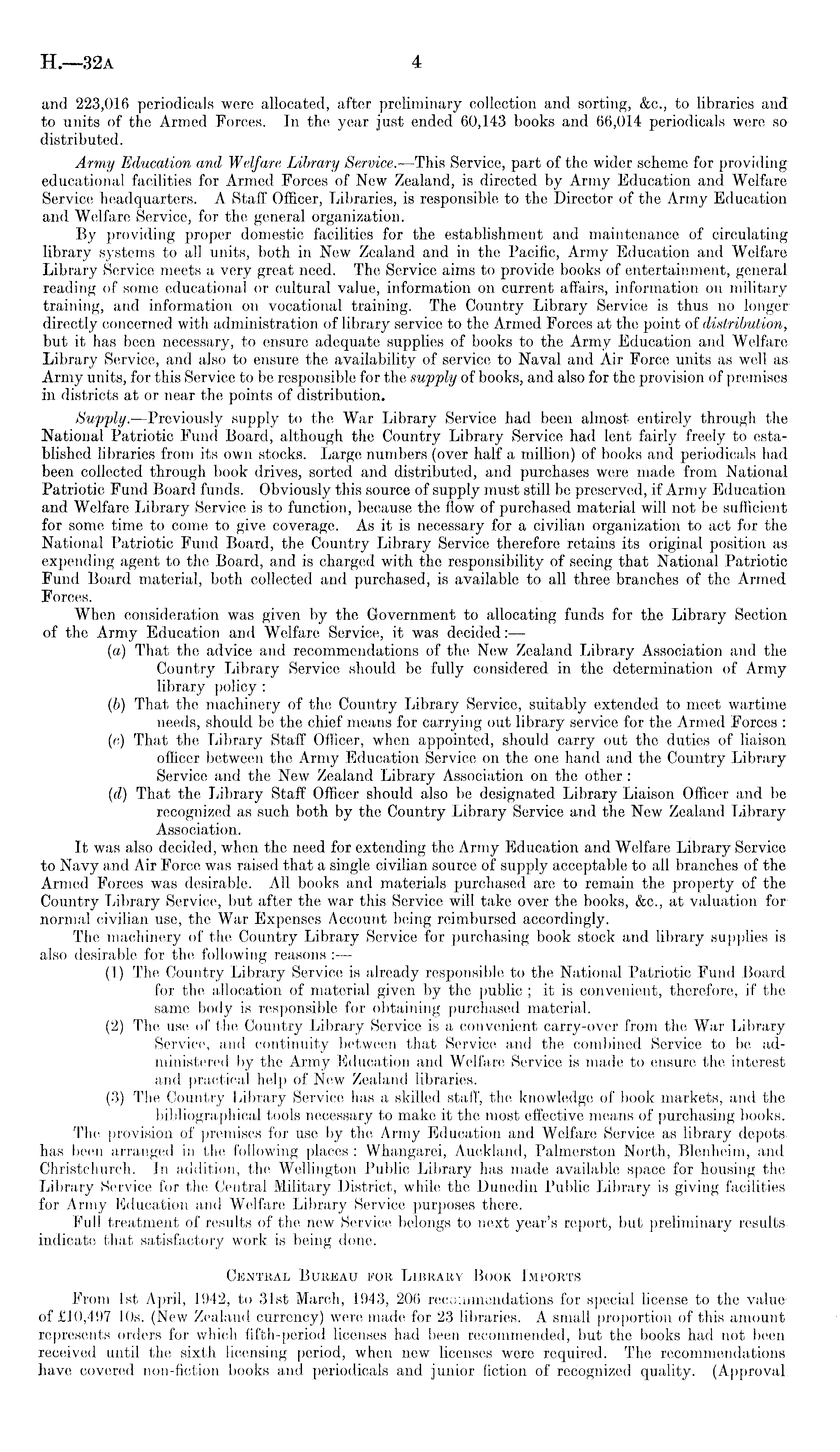 and 223,016 periodicals were allocated, after preliminary collection and sorting, &c., to libraries and to units of the Armed Forces. In the year just ended 60,143 books and 66,014 periodicals were so distributed. Army Education and Welfare Library Service.—This Service, part of the wider scheme for providing educational facilities for Armed Forces of New Zealand, is directed by Army Education and Welfare Service headquarters. A Staff Officer, Libraries, is responsible to the Director of the Army Education and Welfare Service, for the general organization. By providing proper domestic facilities for the establishment and maintenance of circulating library systems to all units, both in New Zealand and in the Pacific, Army Education and Welfare Library Service meets a very great need. The Service aims to provide books of entertainment, general reading of some educational or cultural value, information on current affairs, information on military training, and information on vocational training. The Country Library Service is thus no longer directly concerned with administration of library service to the Armed Forces at the point of distribution, but it has been necessary, to ensure adequate supplies of books to the Army Education and Welfare Library Service, and also to ensure the availability of service to Naval and Air Force units as well as Army units, for this Service to be responsible for the supply of books, and also for the provision of premises in districts at or near the points of distribution. Sup-ply. —Previously supply to the War Library Service had been almost entirely through the National Patriotic Fund Board, although the Country Library Service had lent fairly freely to established libraries from its own stocks. Large numbers (over half a million) of books and periodicals had been collected through book drives, sorted and distributed, and purchases were made from National Patriotic Fund Board funds. Obviously this source of supply must still be preserved, if Army Education and Welfare Library Service is to function, because the flow of purchased material will not be sufficient for some time to come to give coverage. As it is necessary for a civilian organization to act for the National Patriotic Fund Board, the Country Library Service therefore retains its original position as expending agent to the Board, and is charged with the responsibility of seeing that National Patriotic Fund Board material, both collected and purchased, is available to all three branches of the Armed Forces. When consideration was given by the Government to allocating funds for the Library Section of the Army Education and Welfare Service, it was decided:— (a) That the advice and recommendations of the New Zealand Library Association and the Country Library Service should be fully considered in the determination of Army library policy : (b) That the machinery of the Country Library Service, suitably extended to meet wartime needs, should be the chief means for carrying out library service for the Armed Forces r (c) That the Library Staff Officer, when appointed, should carry out the duties of liaison officer between the Army Education Service on the one hand and the Country Library Service and the New Zealand Library Association on the other: (d) That the Library Staff Officer should also be designated Library Liaison Officer and be recognized as such both by the Country Library Service and the New Zealand Library Association. It was also decided, when the need for extending the Army Education and Welfare Library Service to Navy and Air Force was raised that a single civilian source of supply acceptable to all branches of the Armed Forces was desirable. All books and materials purchased are to remain the property of the Country Library Service, but after the war this Service will take over the books, &c., at valuation for normal civilian use, the War Expenses Account being reimbursed accordingly. The machinery of the Country Library Service for purchasing book stock and library supplies is also desirable for the following reasons : — (1) The Country Library Service is already responsible to the National Patriotic Fund Board for the allocation of material given by the public ; it is convenient, therefore, if the same body is responsible for obtaining purchased material. (2) The use of the Country Library Service is a convenient carry-over from the War Library Service, and continuity between that Service and the combined Service to be administered by the Army Education and Welfare Service is made to ensure the interest and practical help of New Zealand libraries. (3) The Country Library Service has a skilled staff, the knowledge of book markets, and the bibliographical tools necessary to make it the most effective means of purchasing books. The provision of premises for use by the Army Education and Welfare Service as library depots has been arranged in the following places : Whangarei, Auckland, Palmerston North, Blenheim, and Christchurch. In addition, the Wellington Public Library has made available space for housing the Library Service for the Central Military District, while the Dunedin Public Library is giving facilities for Army Education and Welfare Library Service purposes there. Full treatment of results of the new Service belongs to next year's report, but preliminary results, indicate that satisfactory work is being done. Central Bureau for Library Book Imports From Ist April, 1942, to 31st March, 1943, 206 recommendations for special license to the valueof £10,497 10s. (New Zealand currency) were made for 23 libraries. A small proportion of this amount represents orders for which fifth-period licenses had been recommended, but the books had not been received until the sixth licensing period, when new licenses were required. The recommendations have covered non-fiction books and periodicals and junior fiction of recognized quality. (Approval