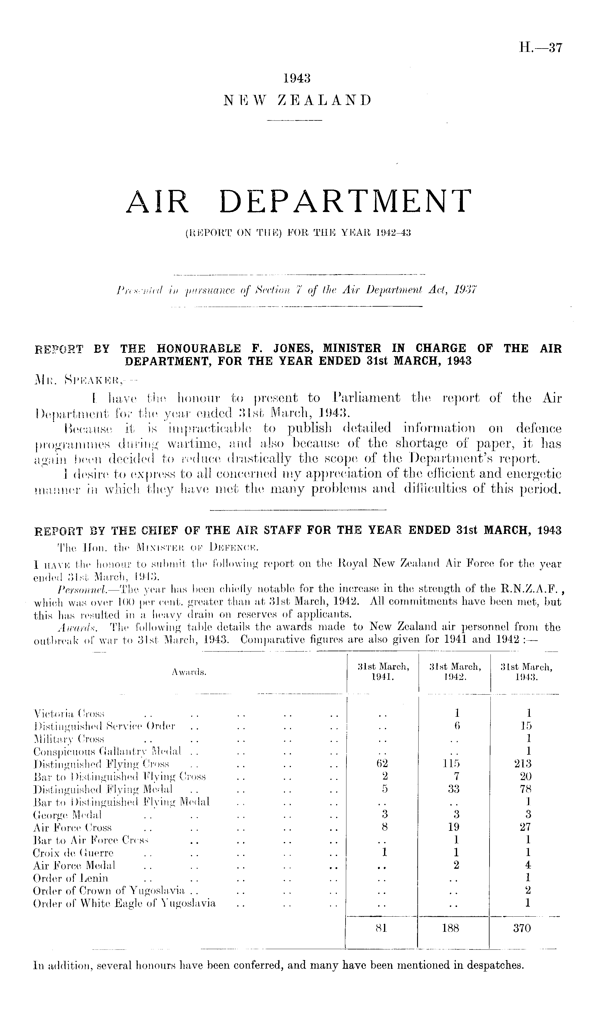 REPORT BY THE CHIEF OF THE AIR STAFF FOR THE YEAR ENDED 31st MARCH, 1943 The Hon. the Minister of Defence. I have the honour to submit the following report on the Royal New Zealand Air Force for the year ended 31st March, 1943. Personnel. —The year has been chiefly notable for the increase in the strength of the R.N.Z.A.F. , which was over 1.00 per cent, greater than at 31st March, 1942. All commitments have been met, but this has resulted in a heavy drain on reserves of applicants. Awards. —The following table details the awards made to New Zealand air personnel from the outbreak of war to 31st March, 1943. Comparative figures are also given for 1941 and 1942 :—