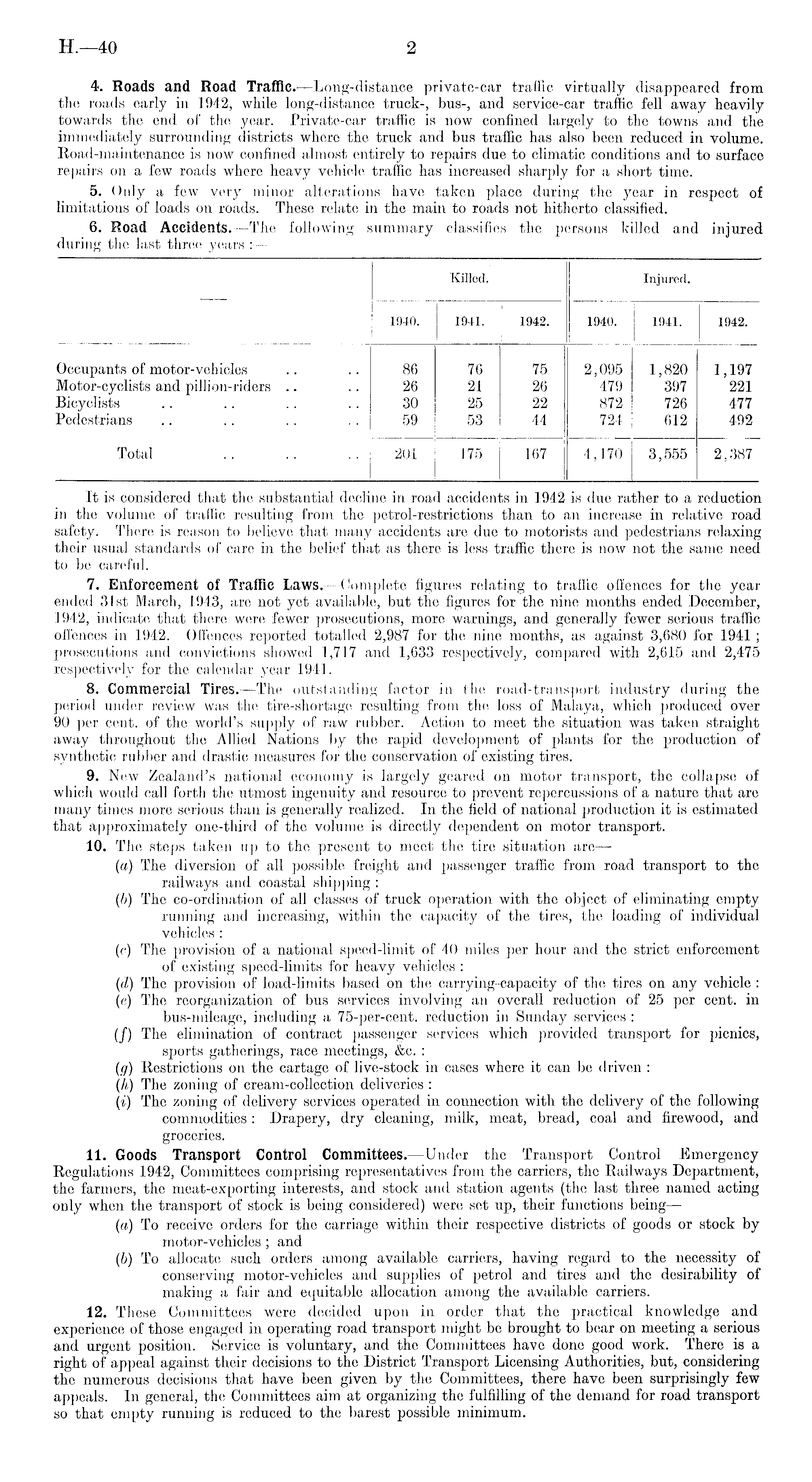 4. Roads and Road Traffic. —Long-distance private-car traffic virtually disappeared from the roads early in 1942, while long-distance truck-, bus-, and service-car traffic fell away heavily towards the end of the year. Private-car traffic is now confined largely to the towns and the immediately surrounding districts where the truck and bus traffic has also been reduced in volume. Road-maintenance is now confined almost entirely to repairs due to climatic conditions and to surface repairs on a few roads where heavy vehicle traffic has increased sharply for a short time. 5. Only a few very minor alterations have taken place during the year in respect of limitations of loads on roads. These relate in the main to roads not hitherto classified. 6. Road Accidents. —The following summary classifies the persons killed and injured during the last three years :—