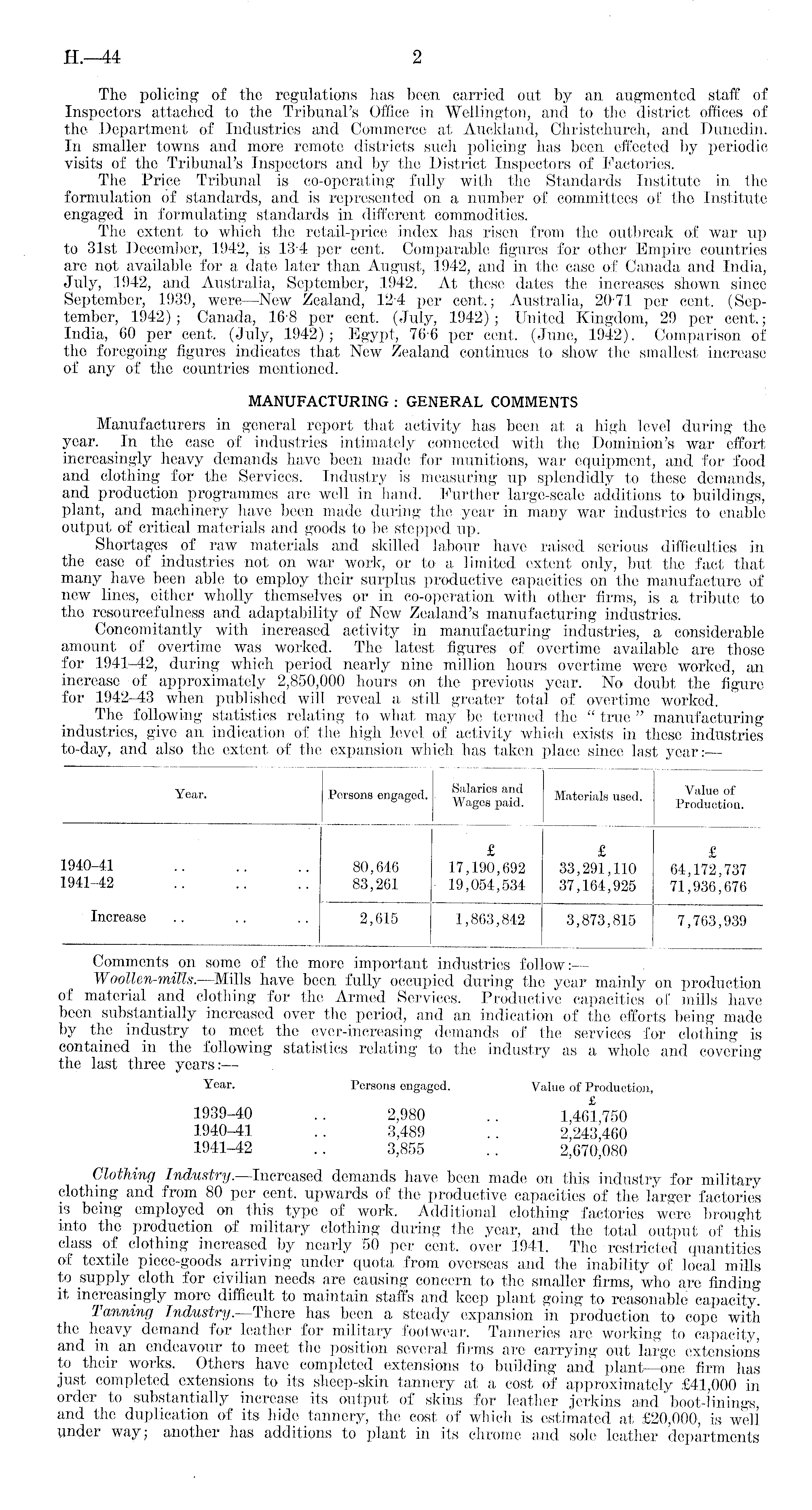 The policing of the regulations has been, carried out by an augmented staff of Inspectors attached to the Tribunal's Office in Wellington, and to the district offices of the Department of Industries and Commerce at Auckland, Christchurch, and Dunedin. In smaller towns and more remote districts such policing has been effected by periodic visits of the Tribunal's Inspectors and by the District Inspectors of Factories. The Price Tribunal is co-operating fully with the Standards Institute in the formulation of standards, and is represented on a number of committees of the Institute engaged in formulating standards in different commodities. The extent to which the retail-price index has risen from the outbreak of war up to 31st December, 1942, is 134 per cent. Comparable figures for other Empire countries are not available for a date later than August, 1942, and in the case of Canada and India, July, 1942, and Australia, September, 1942. At these dates the increases shown since September, 1939, were —New Zealand, 124 per cent.; Australia, 20-71 per cent. (September, 1942) ; Canada, 16-8 per cent. (July, 1942) ; United Kingdom, 29 per cent.; India, 60 per cent. (July, 1942); Egypt, 76-6 per cent. (June, 1942). Comparison of the foregoing figures indicates that New Zealand continues to show the smallest increase of any of the countries mentioned. MANUFACTURING : GENERAL COMMENTS Manufacturers in general report that activity has been at a high level during the year. In the case of industries intimately connected with the Dominion's war effort, increasingly heavy demands have been made for munitions, war equipment, and for food and clothing for the Services. Industry is measuring up splendidly to these demands, and production programmes are well in hand. Further large-scale additions to buildings, plant, and machineiy have been made during the year in many war industries to enable output of critical materials and goods to be stepped up. Shortages of raw materials and skilled labour have raised serious difficulties in the case of industries not on war work, or to a limited extent only, but the fact that many have been able to employ their surplus productive capacities on the manufacture of new lines, either wholly themselves or in co-operation with other firms, is a tribute to the resourcefulness and adaptability of New Zealand's manufacturing industries. Concomitantly with increased activity in manufacturing industries, a considerable amount of overtime was worked. The latest figures of overtime available are those for 1941-42, during which period nearly nine million hours overtime were worked, an increase of approximately 2,850,000 hours on the previous year. No doubt the figure for 1942-43 when published will reveal a still greater total of overtime worked. The following statistics relating to what may be termed the " true " manufacturing industries, give an indication of the high level of activity which exists in these industries to-day, and also the extent of the expansion which has taken place since last year:—