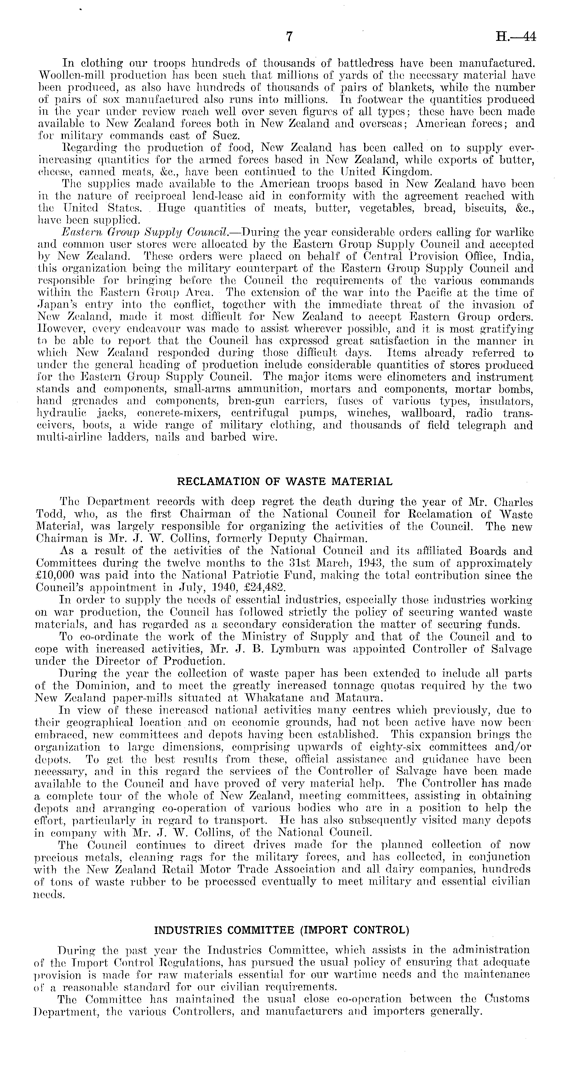 In clothing our troops hundreds of thousands of battledress have been manufactured. Woollen-mill production has been such that millions of yards of the necessary material have been produced, as also have hundreds of thousands of pairs of blankets, while the number of pairs of sox manufactured also runs into millions. In footwear the quantities produced in the year under review reach well over seven figures of all types; these have been made available to New Zealand forces both in New Zealand and overseas; American forces; and for military commands east of Suez. Regarding the production of food, New Zealand has been called on to supply everincreasing quantities for the armed forces based in New Zealand, while exports of butter, cheese, canned meats, &c., have been continued to the United Kingdom. The supplies made available to the American troops based in New Zealand have been in the nature of reciprocal lend-lease aid in conformity with the agreement reached with the United States. . Huge quantities of meats, butter, vegetables, bread, biscuits, &c., have been supplied. Eastern Group Supply Council.—During the year considerable orders calling for warlike and common user stores were allocated by the Eastern Group Supply Council and accepted by New Zealand. These orders were placed on behalf of Central Provision Office, India, this organization being the military counterpart of the Eastern Group Supply Council and responsible for bringing before the Council the requirements of the various commands within the Eastern Group Area. The extension of the war into the Pacific at the time of Japan's entry into the conflict, together with the immediate threat of the invasion of New Zealand, made it most difficult for New Zealand to accept Eastern Group orders. However, every endeavour was made to assist wherever possible, and it is most gratifying to be able to report that the Council has expressed great satisfaction in the manner in which New Zealand responded during those difficult days. Items already referred to under the general heading of production include considerable quantities of stores produced for the Eastern Group Supply Council. The major items were clinometers and instrument stands and components, small-arms ammunition, mortars and components, mortar bombs, hand grenades and components, bren-gun carriers, fuses of various types, insulators, hydraulic jacks, concrete-mixers, centrifugal pumps, winches, wallboard, radio transceivers, boots, a wide range of military clothing, and thousands of field telegraph and multi-airline ladders, nails and barbed wire. RECLAMATION OF WASTE MATERIAL The Department records with deep regret the death during the year of Mr. Charles Todd, who, as the first Chairman of the National Council for Reclamation of Waste Material, was largely responsible for organizing the activities of the Council. The new Chairman is Mr. J. W. Collins, formerly Deputy Chairman. As a result of the activities of the Natioiial Council and its affiliated Boards and Committees during the twelve months to the 31st March, 1943, the sum of approximately £10,000 was paid into the National Patriotic Fund, making the total contribution since the Council's appointment in July, 1940, £24,482. In order to supply the needs of essential industries, especially those industries working on war production, the Council has followed strictly the policy of securing wanted waste materials, and has regarded as a secondary consideration the matter of securing funds. To co-ordinate the work of the Ministry of Supply and that of the Council and to cope with increased activities, Mr. J. B. Lymburn was appointed Controller of Salvage under the Director of Production. During the year the collection of waste paper has been extended to include all parts of the Dominion, and to meet the greatly increased tonnage quotas required by the two New Zealand paper-mills situated at Whakatane and Mataura. In view of these increased national activities many centres which previously, due to their geographical location and on economic grounds, had not been active have now been embraced, new committees and depots having been established. This expansion brings the organization to large dimensions, comprising upwards of eighty-six committees and/or depots. To get the best results from these, official assistance and guidance have been necessary, and in this regard the services of the Controller of Salvage have been made available to the Council and have proved of very material help. The Controller has made a complete tour of the whole of New Zealand, meeting committees, assisting in obtaining depots and arranging co-operation of various bodies who are in a position to help the effort, particularly in regard to transport. He has also subsequently visited many depots in company with Mr. J. W. Collins, of the National Council. The Council continues to direct drives made for the planned collection of now precious metals, cleaning rags for the military forces, and has collected, in conjunction with the New Zealand Retail Motor Trade Association and all dairy companies, hundreds of tons of waste rubber to be processed eventually to meet military and essential civilian needs. INDUSTRIES COMMITTEE (IMPORT CONTROL) During the past year the Industries Committee, which assists in the administration of the Import Control Regulations, has pursued the usual policy of ensuring that adequate provision is made for raw materials essential for- our wartime needs and the maintenance of a reasonable standard for our civilian requirements. The Committee has maintained the usual close co-operation between the Customs Department, the various Controllers, and manufacturers and importers generally.