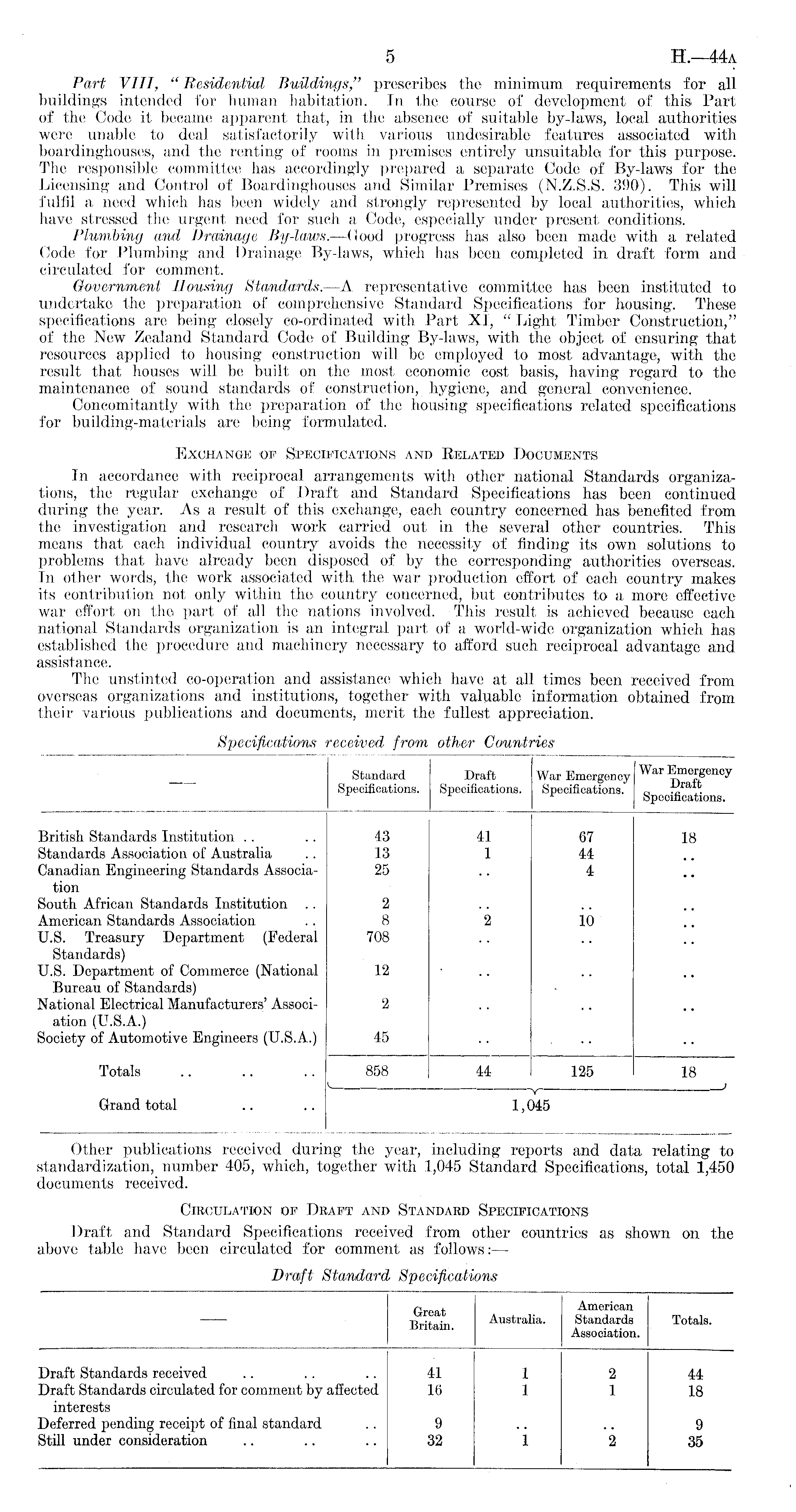 Part VIII, " Residential Buildings-," prescribes the minimum requirements for all buildings intended for human habitation. In the course of development of this Part of the Code it became apparent that, in the absence of suitable by-laws, local authorities were unable to deal satisfactorily with various undesirable features associated with boardinghouses, and the renting of rooms in premises entirely unsuitable* for this purpose. The responsible committee has accordingly prepared a separate Code of By-laws for the Licensing and Control of Boardinghouses and Similar Premises (N.Z.S.S. 390). This will, fulfil a need which has been widely and strongly represented, by local authorities, which have stressed the urgent need for such a Code, especially under present conditions. Plumbing and Drainage By-laws.—Good progress has also been made with a related Code for Plumbing and Drainage By-laws, which has been completed in draft form and circulated for comment. Government Housing Standards.—A representative committee has been instituted to undertake the preparation of comprehensive Standard Specifications for housing. These specifications are being closely co-ordinated with Part XI, " Light Timber Construction," of the New Zealand Standard Code of Building By-laws, with the object of ensuring that resources applied to housing construction will, be employed to most advantage, with the result that houses "will be built on the most economic cost basis, having regard to the maintenance of sound standards of construction, hygiene, and general convenience. Concomitantly with the preparation of the housing specifications related specifications for building-materials are being formulated. Exchange of Specifications and Related Documents In accordance with reciprocal arrangements with, other national Standards organizations, the regular exchange of Draft and Standard Specifications has been continued during the year. As a result of this exchange, each country concerned has benefited from the investigation and research work carried out in the several other countries. This means that each individual country avoids the necessity of finding its own solutions to problems that have already been disposed of by the corresponding authorities overseas. In other words, the work associated with the war production effort of each country makes its contribution not only within the country concerned, but contributes to a more effective war effort on the part of all. the nations involved. This result is achieved because each national Standards organization is an integral part of a world-wide organization which has established the procedure and machinery necessary to afford such reciprocal advantage and assistance. The unstinted co-operation and assistance which have at all times been received from overseas organizations and institutions, together with valuable information obtained from their various publications and documents, merit the fullest appreciation.