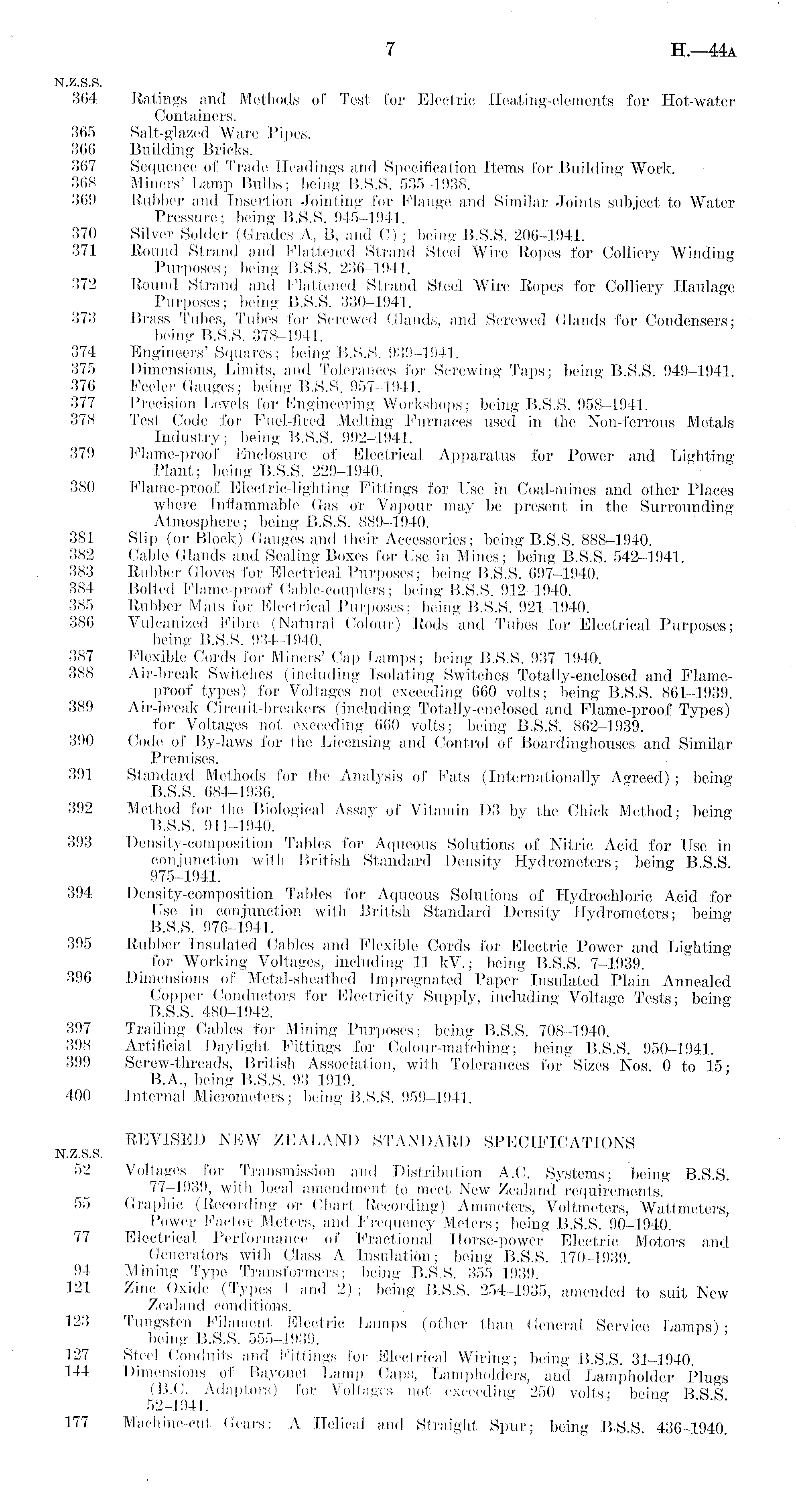 N.Z.S.S. 364 Ratings and Methods of Test for Electric Heating-elements for Hot-water Containers. 365 Salt-glazed Ware Pipes. 366 Building Bricks, 367 Sequence of Trade Headings and Specification Items for Building "Work. 368 Miners' Lamp Bulbs; being B.S.S. 535-1938. 369 Rubber and Insertion Jointing for Flange and Similar Joints subject to Water Pressure ; being B.S.S. 945-1941. 370 Silver Solder (Grades A, B, and C) ; being B.S.S. 206-1941. 371 Round Strand and Flattened Strand Steel Wire Ropes for Colliery Winding Purposes; being B.S.S. 236-1941. 372 Round Strand and Flattened Strand Steel Wire Ropes for Colliery Haulage Purposes; being B.S.S. 330-1941. 373 Brass Tubes, Tubes for Screwed Glands, and Screwed Glands for Condensers; being B.S.S. 378-1941. 374 Engineers' Squares; being B.S.S. 939-1941. 375 Dimensions, Limits, and Tolerances for Screwing Taps; being B.S.S. 949-1941. 376 Feeler Gauges; being B.S.S. 957-1941. 377 Precision Levels for Engineering Workshops; being B.S.S. 958-1941. 378 Test Code for Fuel-fired Melting Furnaces used in the Non-ferrous Metals Industry; being B.S.S. 992-1941. 379 Flame-proof Enclosure of Electrical Apparatus for Power and Lighting Plant; being B.S.S. 229-1940. 380 Flame-proof Electric-lighting Fittings for Use in Coal-mines and other Places where Inflammable Gas or Vapour may be present in the Surrounding Atmosphere; being B.S.S. 889-1940. 381 Slip (or Block) Gauges and their Accessories; being B.S.S. 888-1940. 382 Cable Glands and Sealing Boxes for Use in Mines; being B.S.S. 542-1941. 383 Rubber Gloves for Electrical Purposes; being B.S.S. 697-1940. 384 Bolted Flame-proof Cable-couplers; being B.S.S. 912-1940. 385 Rubber Mats for Electrical Purposes; being B.S.S. 921-1940. 386 Vulcanized Fibre (Natural Colour) Rods and Tubes for Electrical Purposes; being B.S.S. 934-1940. 387 Flexible Cords for Miners' Cap Lamps; being B.S.S. 937-1940. 388 Air-break Switches (including Isolating Switches Totally-enclosed and Flameproof types) for Voltages not exceeding 660 volts; being B.S.S. 861-1939. 389 Air-break Circuit-breakers (including Totally-enclosed and Flame-proof Types) for Voltages not exceeding 660 volts; being B.S.S. 862-1939. 390 Code of By-laws for the Licensing and Control of Boardinghouses and Similar Premises, 391 Standard Methods for the Analysis of Fats (Internationally Agreed) ; being B.S.S. 684-1936. 392 Method for the Biological Assay of Vitamin 133 by the Chick Method; being B.S.S. 911-1940. 393 Density-composition Tables for Aqueous Solutions of Nitric Acid for Use in conjunction with British Standard Density Hydrometers; being B.S.S. 975-1941. 394 Density-composition Tables for Aqueous Solutions of Hydrochloric Acid for Use in conjunction with British Standard Density Hydrometers; being B.S.S. 976-1941. 395 Rubber Insulated Cables and Flexible Cords for Electric Power and Lighting for Working Voltages, including 11 kV.; being B.S.S. 7-1939. 396 Dimensions of Metal-sheathed Impregnated Paper Insulated Plain Annealed Copper Conductors for Electricity Supply, including Voltage Tests; being B.S.S. 480-1942. 397 Trailing Cables for Mining Purposes; being B.S.S. 708-1940. 398 Artificial Daylight Fittings for Colour-matching; being B.S.S. 950-1941. 399 Screw-threads, British Association, with Tolerances for Sizes Nos 0 to 158.A., being B.S.S. 93-1919. 400 Internal Micrometers; being B.S.S. 959-1941. REVISED NEW ZEALAND STANDARD SPECIFICATIONS N.Z.S.S. 52 Voltages for Transmission and Distribution A.C. Systems; being B.S.S. 77—1939, with local amendment to meet New Zealand requirements, 55 Graphic (Recording or Chart Recording) Ammeters, Voltmeters, Wattmeters, Power Factor Meters, and Frequency Meters; being B.S.S. 90-1940. 77 Electrical Performance of Fractional Horse-power Electric Motors and Generators with Class A Insulation; being B.S.S. 170-1939. 94 Mining Type Transformers; being B.S.S. 355-1939. 121 Zinc Oxide (Types 1 and 2); being B.S.S. 254-1935, amended to suit New Zealand conditions, 123 Tungsten Filament Electric Lamps (other than General Service Lamps') • being B.S.S. 555-1939. 127 Steel Conduits and Fittings for Electrical Wiring;' being B.S.S. 31-1940 144 Dimensions of Bayonet Lamp Caps, Lampholders, and Lampholder Plugs (B.C. Adaptors) for Voltages not exceeding 250 volts; being B.S.S. 52-1941, 177 Machine-cut Gears: A Helical and Straight Spur; being B-S.S. 436-1940.