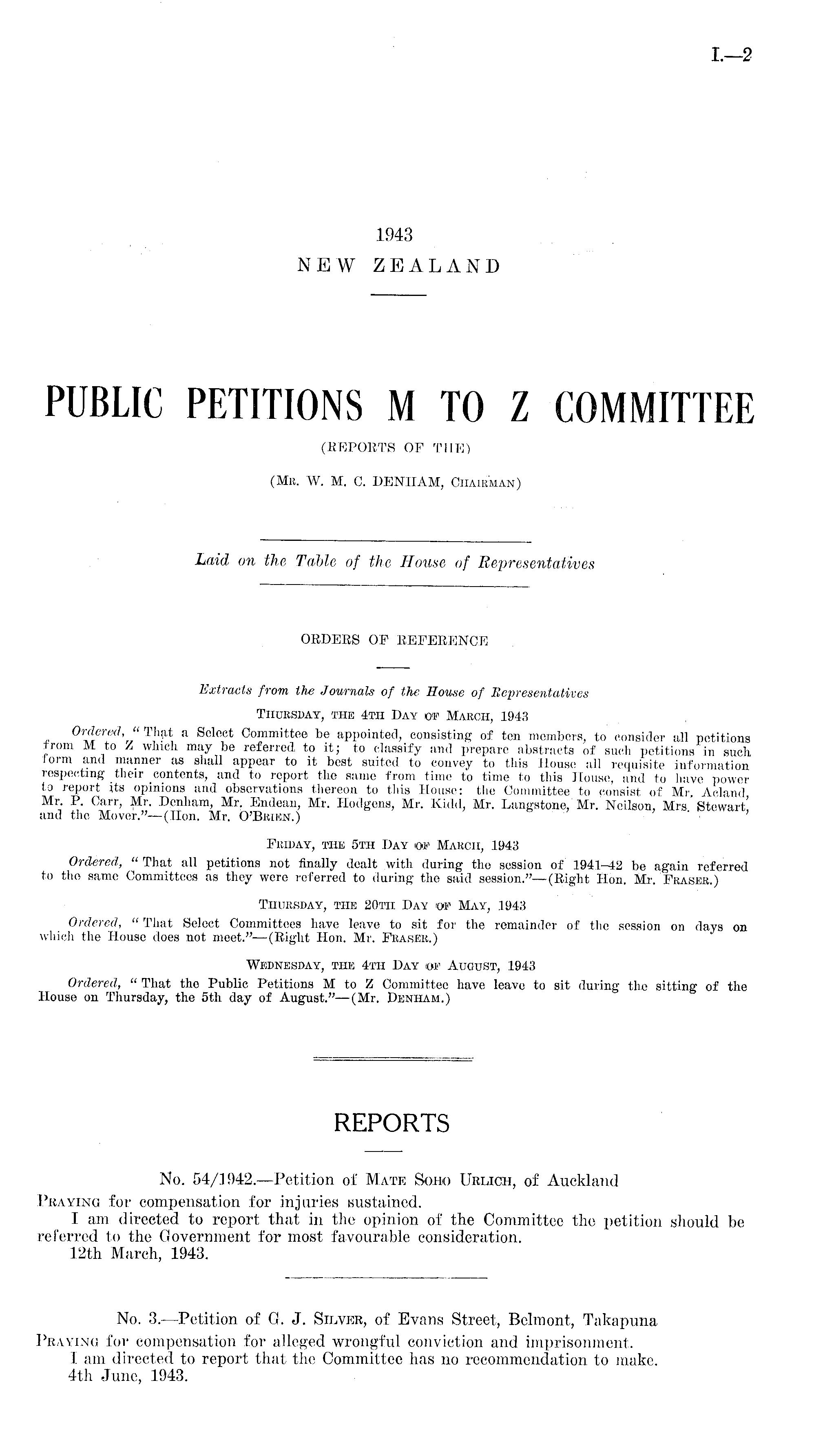 No. 54/1942. —Petition of Mate Sobo Urlich, of Auckland Praying for compensation for injuries sustained. I am directed to report that in the opinion of the Committee the petition should be referred to the Government for most favourable consideration. 12th March, 1943.