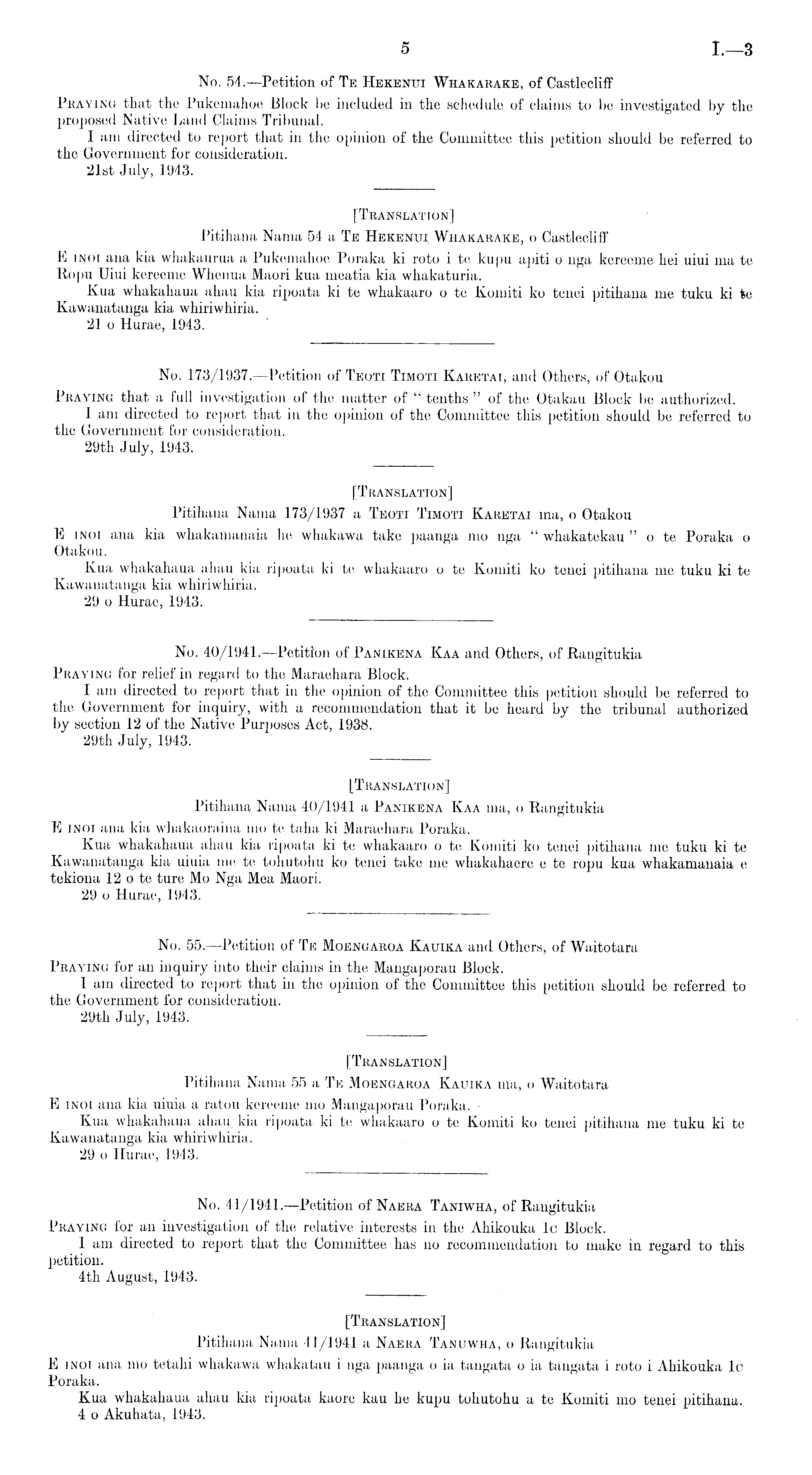 [Translation] Pitihana Nama 54 a Te Hekenui. Whakarake, o Castlecliff 15 inoi ana kia whakaurua a Pukemahoe Poraka ki roto i te kupu apiti o nga kereeme liei uiui ma te Ropu Uiui kereeme Whenua Maori kua mcatia kia whakaturia. Kua whakahaua ahau kia ripoata kite whakaaro o te Komiti ko tenei pitihana me tuku kite Kawanatanga kia whiriwhiria. 21 o Hurae, 1943.