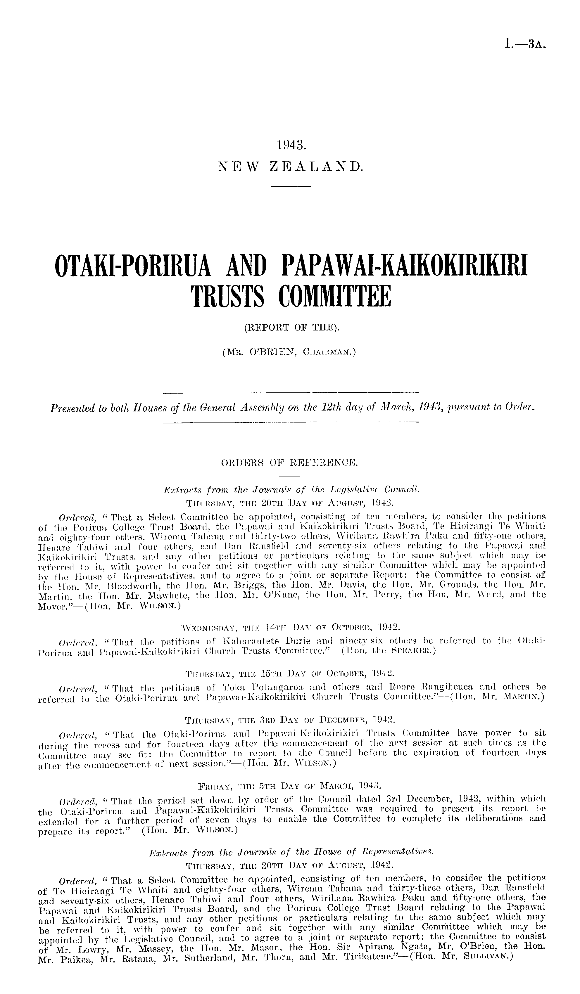ORDERS OF REFERENCE. Extracts from the' Journals of the Legislative Council. Thursday, the 20t<h Day op August, 1942. Ordered, " That a Select Committee be appointed, consisting of ten members, to consider the petitions of the Porirua College Trust Board, the Papawai and Kaikokirikiri Trusts Board, Te Hioirangi Te Whaiti and eighty-four others, Wiremu Tahana and thirty-two others, Wirihana Rawhira Paku and fifty-one others, Henare Taliiwi and four others, and Dan Ransfield and seventy-six others relating to the Papawai and Kaikokirikiri Trusts, and any other petitions or particulars relating to the same subject which may be referred to it, with power to confer and. sit together with any similar Committee which may be appointed bv the House of Representatives, and to agree to a joint or separate Report: the Committee to consist of the Hon. Mr. Bloodworth, the Hon. Mr. Briggs, the Hon. Mr. Davis, the Hon. Mr. Grounds, the Hon. Mr. Martin, the Hon. Mr. Mawhete, the Hon. Mr. O'Kane, the Hon, Mr. Perry, the Hon. Mr. Ward, and the Mover." —(Hon. Mr. Wilson.) Wednesday, the 14th Day of October, 1942. Ordered, " That the petitions of Kahurautete Durie and ninety-six others be referred to the OtakiPorirua and Papawai-Kaikokirikiri Church Trusts Committee." —(Hon. the Speaker.) Thursday, the 15th Day op October, 1942. Ordered, " That the petitions of Toka Potangaroa and others and Roore Rangiheuea and others be referred to the Otaki-Porirua and Papawai-Kaikokirikiri Church Trusts Committee." —(Hon. Mr. Martin.) Thursday, the 3rd Day of December, 1942. Ordered, " That the Otaki-Porirua and Papawai-Kaikokirikiri Trusts Committee have power to sit during the recess and for fourteen days after this commencement of the next session at such times as the Committee may see fit: the Committee to report to the Council before the expiration of fourteen. days after the commencement of next session." —(Hon. Mr. Wilson.) Friday, the sth Day of March, 1943. Ordered " That the period set down, by order of the Council dated 3rd December, 1942, within which the Otaki-Porirua and Papawai-Kaikokirikiri Trusts Committee was required to present its report be extended for a further period of seven days to enable the Committee to complete its deliberations and prepare its report."—(Hon. Mr. Wilson.) Extracts from the Journals of the House of Representatives. Thursday, the 20th Day op August, 1942. Ordered, " That a Select Committee be appointed, consisting of ten members, to consider the petitions of To Hioirangi Te Whaiti and eighty-four others, Wiremu Tahana and thirty-three others, Dan Ransfield and seventy-six others, Henare Tahiwi and four others, Wirihana Rawhira Paku and fifty-one others, the Papawai and Kaikokirikiri Trusts Board, and the Porirua College Trust Board relating to the Papawai and Kaikokirikiri Trusts, and any other petitions or particulars relating to the same subject which may be referred to it, with power to confer and sit together with any similar Committee which may be appointed by the Legislative Council, and to agree to a joint or separate report: the Committee to consist of Mr Dowry, Mr. Massey, the Hon. Mr. Mason, the Hon. Sir Apirana Ngata, Mr. O'Brien, the Hon. Mr. Paikea, Mr. Ratana, Mr. Sutherland, Mr. Thorn, and Mr. Tirikatene." —(Hon. Mr. Sullivan.)