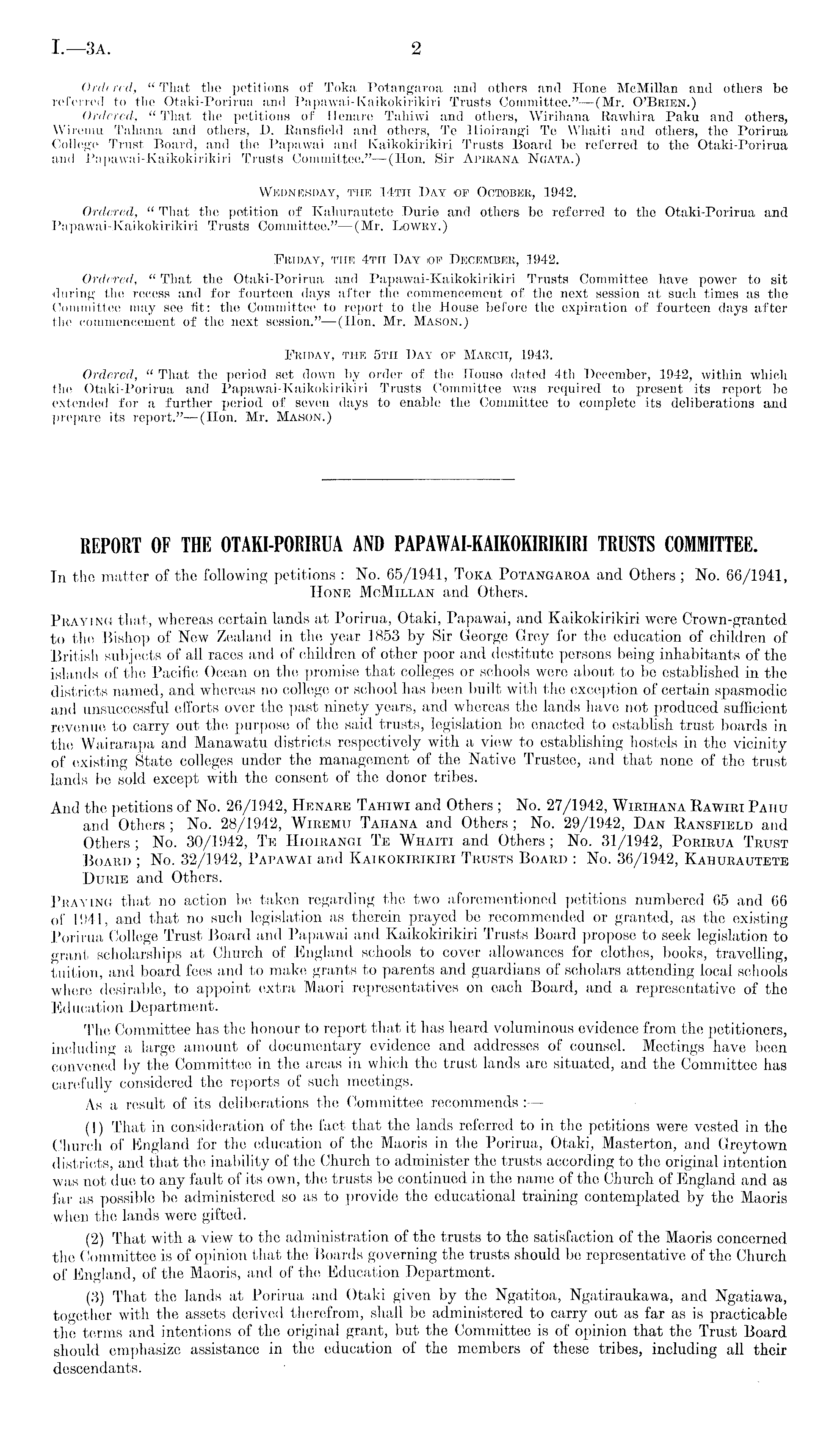 REPORT OF THE OTAKI-PORIRUA AND PAPAWAI-KAIKOKIRIKIRI TRUSTS COMMITTEE. In the matter of the following petitions : No. 65/1941, Toka Potangaroa and Others ; No. 66/1941, Hone McMillan and Others. Praying that, whereas certain lands at Porirua, Otaki, Papawai, and Kaikokirikiri were Crown-granted to the Bishop of New Zealand in the year 1853 by Sir George Grey for the education of children of British subjects of all races and of children of other poor and destitute persons being inhabitants of the islands of the Pacific Ocean on the promise that colleges or schools were about to be established in the districts named, and whereas no college or school has been built with the exception of certain spasmodic and unsuccessful efforts over the past ninety years, and whereas the lands have not produced sufficient revenue to carry out the purpose of the said trusts, legislation be enacted to establish trust boards in the Wairarapa and Manawatu districts respectively with a view to establishing hostels in the vicinity of existing State colleges under the management of the Native Trustee, and that none of the trust lands be sold except with the consent of the donor tribes. And the petitions of No. 26/1942, Henare Tahiwi and Others ; No. 27/1942, Wirihana Rawiri Paiiu and Others; No. 28/1942, Wiremu Taiiana and Others ; No. 29/1942, Dan Ransfield and Others; No. 30/1942, Te Hioirangi Te Whaiti and Others; No. 31/1942, Porirua Trust Board ; No. 32/1942, Papawai and Kaikokirikiri Trusts Board : No. 36/1942, Kahurautete Durie and Others. Praying that no action be taken regarding the two aforementioned petitions numbered 65 and 66 of 1941, and that no such legislation as therein prayed be recommended or granted, as the existing Porirua College Trust Board and Papawai and Kaikokirikiri Trusts Board propose to seek legislation to grant scholarships at Church of England schools to cover allowances for clothes, books, travelling, tuition, and board fees and to make grants to parents and guardians of scholars attending local schools where desirable, to appoint extra Maori representatives on each Board, and a representative of the Education Department. The Committee has the honour to report that it has heard voluminous evidence from the petitioners, including a large amount of documentary evidence and addresses of counsel. Meetings have been convened by the Committee in the areas in which the trust lands are situated, and the Committee has carefully considered the reports of such meetings. As a result of its deliberations the Committee recommends :— (1) That in consideration of the fact that the lands referred to in the petitions were vested in the Church of England for the education of the Maoris in the Porirua, Otaki, Masterton, and Greytown districts, and that the inability of the Church to administer the trusts according to the original intention was not due to any fault of its own, the trusts be continued in the name of the Church of England and as far as possible be administered so as to provide the educational training contemplated by the Maoris when the lands were gifted. (2) That with a view to the administration of the trusts to the satisfaction of the Maoris concerned the Committee is of opinion that the Boards governing the trusts should be representative of the Church of England, of the Maoris, and of the Education Department. (3) That the lands at Porirua and Otaki given by the Ngatitoa, Ngatiraukawa, and Ngatiawa, together with the assets derived therefrom, shall be administered to carry out as far as is practicable the terms and intentions of the original grant, but the Committee is of opinion that the Trust Board should emphasize assistance in the education of the members of these tribes, including all their descendants.