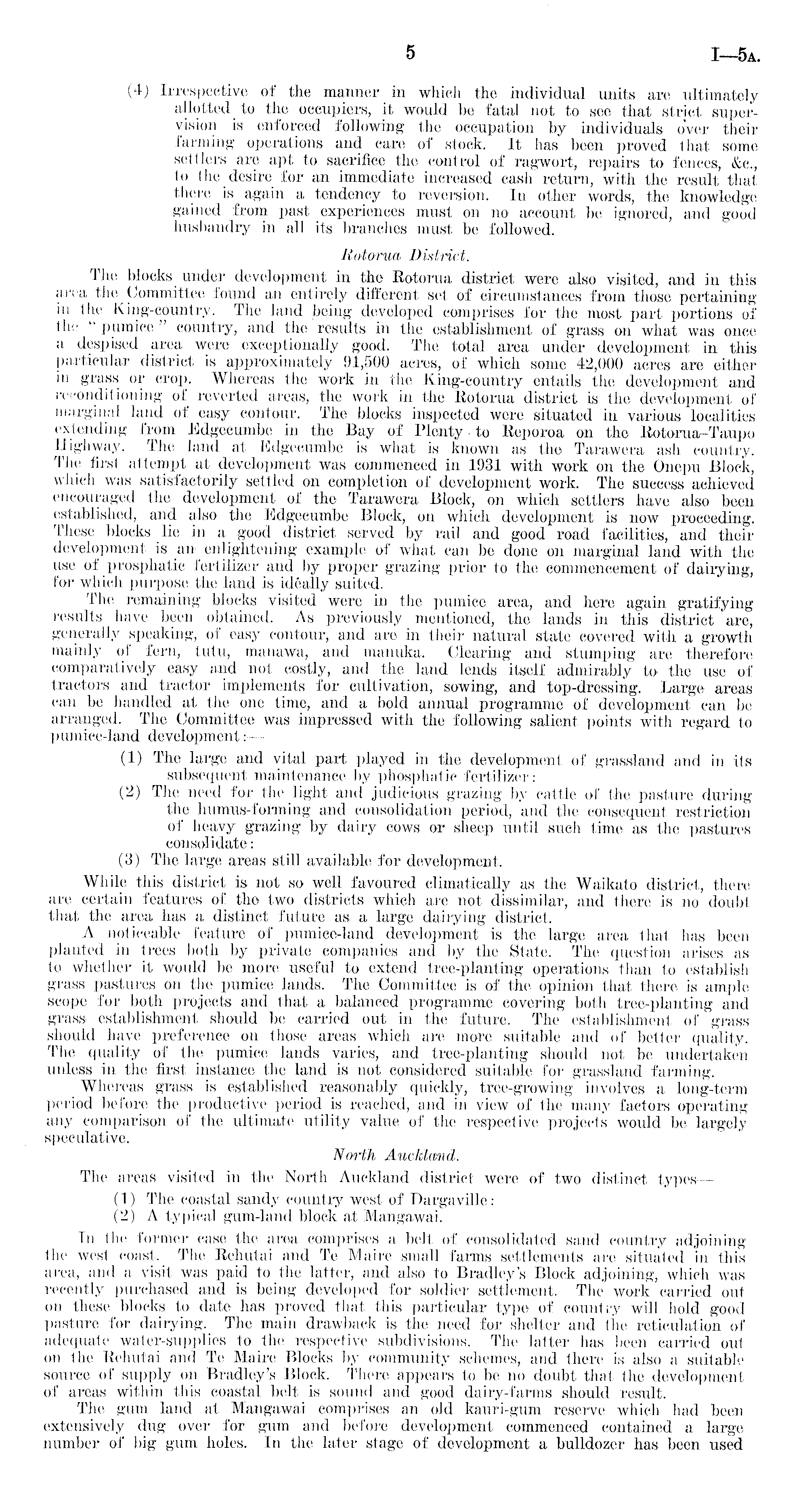 (4) Irrespective of the manner in which the individual units are ultimately allotted to the occupiers, it would be fatal not to see that strict supervision is enforced following the occupation by individuals over their farming operations and care of stock. It has been proved that some settlers are apt to sacrifice the control of ragwort, repairs to fences, &c., to the desire for an immediate increased cash return, with the result that there is again a tendency to reversion. In other words, the knowledge gained from past experiences must on no account be ignored, and good husbandry in all its branches must be followed. Rotorua District. The blocks under development in the Rotorua district were also visited, and in this area the Committee found an entirely different set of circumstances from those pertaining in the King-country. The land being developed comprises for the most part portions of the " pumice " country, and the results in the establishment of grass on what was once a despised area were exceptionally good. The total area under development in this particular district is approximately 91,500 acres, of which some 42,000 acres are either in grass or crop. Whereas the work in the King-country entails the development and reconditioning of reverted areas, the work in the Rotorua district is the, development of marginal land of easy contour. The blocks inspected were situated in various localities extending from Edgecumbe in the Bay of Plenty. to Reporoa on the Rotorua-Taupo Highway. The land at Edgecumbe is what is known as the Tarawera ash country. The first attempt at development was commenced in 1931 with work on the Onepu Block, which was satisfactorily settled on completion of development work. The success achieved encouraged the development of the Tarawera Block, on which settlers have also been established, and also the Edgecumbe Block, on which development is now proceeding. These blocks lie in a good district served by rail and good road facilities, and their development is an enlightening example of what can be done on marginal land with the use of prosphatie fertilizer and by proper grazing prior to the commencement of dairying, for which purpose the land is ideally suited. The remaining blocks visited were in the pumice area, and here again gratifying results have been obtained. As previously mentioned, the lands in this district are, generally speaking, of easy contour, and are in their natural state covered with a growth mainly of fern, tutu, manawa, and manuka. Clearing and stumping are therefore comparatively easy and not costly, and the land lends itself admirably to the use of tractors and tractor implements for cultivation, sowing, and top-dressing. Large areas can be handled at the one time, and a bold annual programme of development can be arranged. The Committee was impressed with the following salient points with regard to pumice-land development:— (1) The large and vital part played in the development of grassland and in its subsequent maintenance by phosphatic fertilizer: (2) The need for the light and judicious grazing by cattle of the pasture during the humus-forming and consolidation period, and the consequent restriction of heavy grazing by dairy cows or sheep until such time as the pastures consolidate: (3) The large areas still available for development. While this district is not so well favoured climatically as the Waikato district, there are certain features of the two districts which are not dissimilar, and there is no doubt that the area has a distinct future as a large dairying district. A noticeable feature of pumice-land development is the large area that has been planted in trees both by private companies and by the State. The question arises as to whether it would be more useful to extend tree-planting operations than to establish grass pastures on the pumice lands. The Committee is of the opinion that there is ample scope for both projects and that a balanced programme covering both tree-planting and grass establishment should be carried out in the future. The establishment of grass should have preference on those areas which are more suitable and of better quality. The quality of the pumice lands varies, and tree-planting should not be undertaken unless in the first instance the land is not considered suitable for grassland farming. Whereas grass is established reasonably quickly, tree-growing involves a long-term period before the productive period is reached, and in view of the many factors operating any comparison of the ultimate utility value of the respective .projects would be largely speculative. North Auchlamd. The areas visited in the North Auckland district were of two distinct types— (1) The coastal sandy country west of Dargaville: (2) A typical gum-land block at Manga wai. In the former case the area comprises a belt of consolidated sand country adjoining the west coast. The Rchutai and Te Maire small farms settlements are situated in this area, and a visit was paid to the latter, and also to Bradley's Block adjoining, which was recently purchased and is being developed for soldier settiement. The work carried out on these blocks to date has proved that this particular type of country will hold good pasture for dairying. The main drawback is the need for shelter and the reticulation of adequate water-supplies to the respective subdivisions. The latter has been carried out on the Rehutai and Te Maire Blocks by community schemes, and there is also a suitable source of supply on Bradley's Block. There appears to be no doubt that the development of areas within this coastal belt is sound and good dairy-farms should result. The gum land at Mangawai comprises an old kauri-gum reserve which had been extensively dug over for gum and before development commenced contained a large number of big gum holes. In the later stage of development a bulldozer has been used
