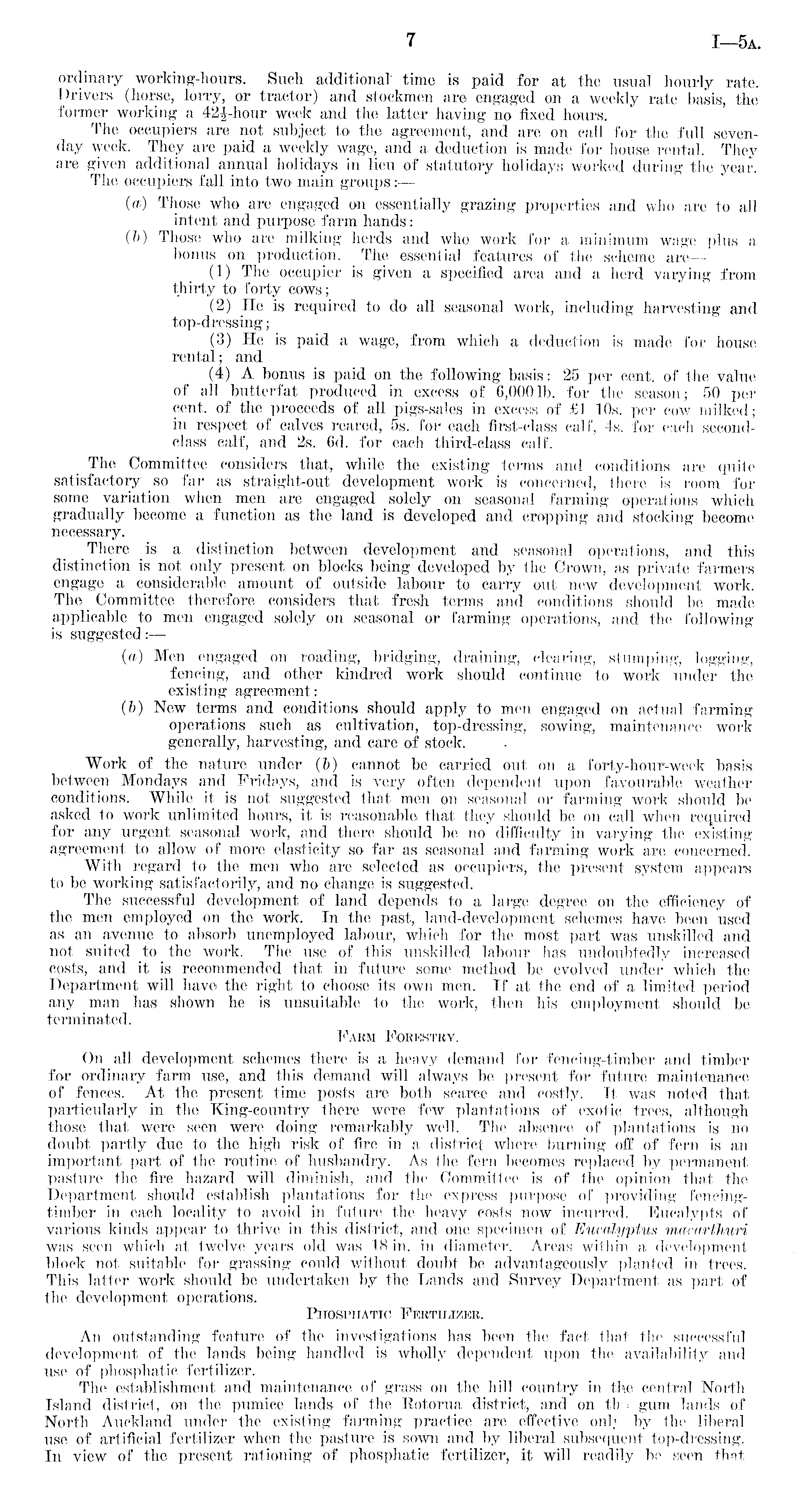 ordinary working-hours. Such additional' time is paid for at the usual hourly rate. Drivers (horse, lorry, or tractor) and stockmen are engaged on a weekly rate basis, the former working a 42i-hour week and the latter having no fixed hours. The occupiers are not subject to the agreement, and are on call for the full sevenday week. They are paid a weekly wage, and a deduction is made for house rental. They are given additional annual holidays in lieu of statutory holidays worked during the year. The occupiers fall into two main groups:— (a) Those who are engaged on essentially grazing properties and who are to all intent and purpose farm hands: (b) Those who are milking herds and who work for a minimum wage plus a bonus on production. The essential features of the scheme are— (1) The occupier is given a specified area and a herd varying from thirty to forty cows; (2) He is required to do all seasonal work, including harvesting and top-dressing; (3) He is paid a wage, from which a deduction is made for house rental; and (4) A bonus is paid on the following basis: 25 per cent, of the value of ail butterfat produced in excess of 6,0001b. for the season; 50 per cent, of the proceeds of all pigs-sales in excess of £1 10s. per cow milked; in respect of calves reared, ss. for each first-class calf, 4s. for each secondclass calf, and 2s. 6d. for each third-class calf. The Committee considers that, while the existing terms and conditions are quite satisfactory so far as straight-out development work is concerned, there is room for some variation when men are engaged solely on seasonal farming operations which gradually become a function as the land is developed and cropping and stocking become necessary. There is a distinction between development and seasonal operations, and this distinction is not only present on blocks being developed by the Crown, as private farmers engage a considerable amount of outside labour to carry out new development work. The _ Committee therefore considers that fresh terms and conditions should be made applicable to men engaged solely on seasonal or farming operations, and the following is suggested:— (a) Men engaged on reading, bridging, draining, clearing, stumping, logging, fencing, and other kindred work should continue to work under the existing agreement: (b) New terms and conditions should apply to men engaged on actual farming operations such as cultivation, top-dressing, sowing, maintenance work generally, harvesting, and care of stock. Work of the nature under (b) cannot be carried out on a forty-hour-week basis between Mondays and Fridays, and is very often dependent upon favourable weather conditions. While it is not suggested that men on seasonal or farming work should be asked to work unlimited hours, it is reasonable that they should be on call when required for any urgent seasonal work, and there should be no difficulty in varying the existing agreement to allow of more elasticity so far as seasonal and farming work are concerned. With regard to the men who are selected as occupiers, the present system appears to be working satisfactorily, and no change is suggested. The successful development of land depends to a large degree on the efficiency of the men employed on the work. In the past, land-development schemes have been used as an avenue to absorb unemployed labour, which for the most part was unskilled and not suited to the work. The use of this unskilled labour has undoubtedly increased costs, and it is recommended that in future some method be evolved under which the Department will have the right to choose its own men. If at the end of a limited period any man has shown he is unsuitable to the work, then his employment should bo terminated. Farm Forestry. On all development schemes there is a heavy demand for fencing-timber and timber for ordinary farm, use, and this demand will always be present for future maintenance of fences. At the present time posts are both scarce and costly. It was noted that particularly in the King-country there were few plantations of exotic trees, although those that were seen were doing remarkably well. The absence of plantations is no doubt partly due to the high risk of fire in a district where burning off of fern is an important part of the routine of husbandry. As the fern becomes replaced by permanent pasture the fire hazard will diminish, and the Committee is of the opinion that the Department should establish plantations for the express purpose of providing fencingtimber in each locality to avoid in future the heavy costs now incurred. Eucalypts of various kinds appear to thrive in this district, and one specimen of Eucalyptus macartJwri was seen which at twelve years old was 18 in. in diameter. Areas within a development block not suitable for grassing could without doubt be advantageously planted in trees. This latter work should be undertaken by the Lands and Survey Department as part of the development operations. Phosphatic Fertilizer. An outstanding feature of the investigations has been the fact that the successful development of the lands being handled is wholly dependent upon the availability and use of phosphatic fertilizer. The establishment and maintenance of grass on the hill country in the central North Island district, on the pumice, lands of the Rotorua district, and on tl? ; gum lands of North Auckland under the existing farming practice are effective onh by the liberal use of artificial fertilizer when the pasture is sown and by liberal subsequent top-dressing. In view of the present rationing of phosphatic fertilizer, it will readily be seen that