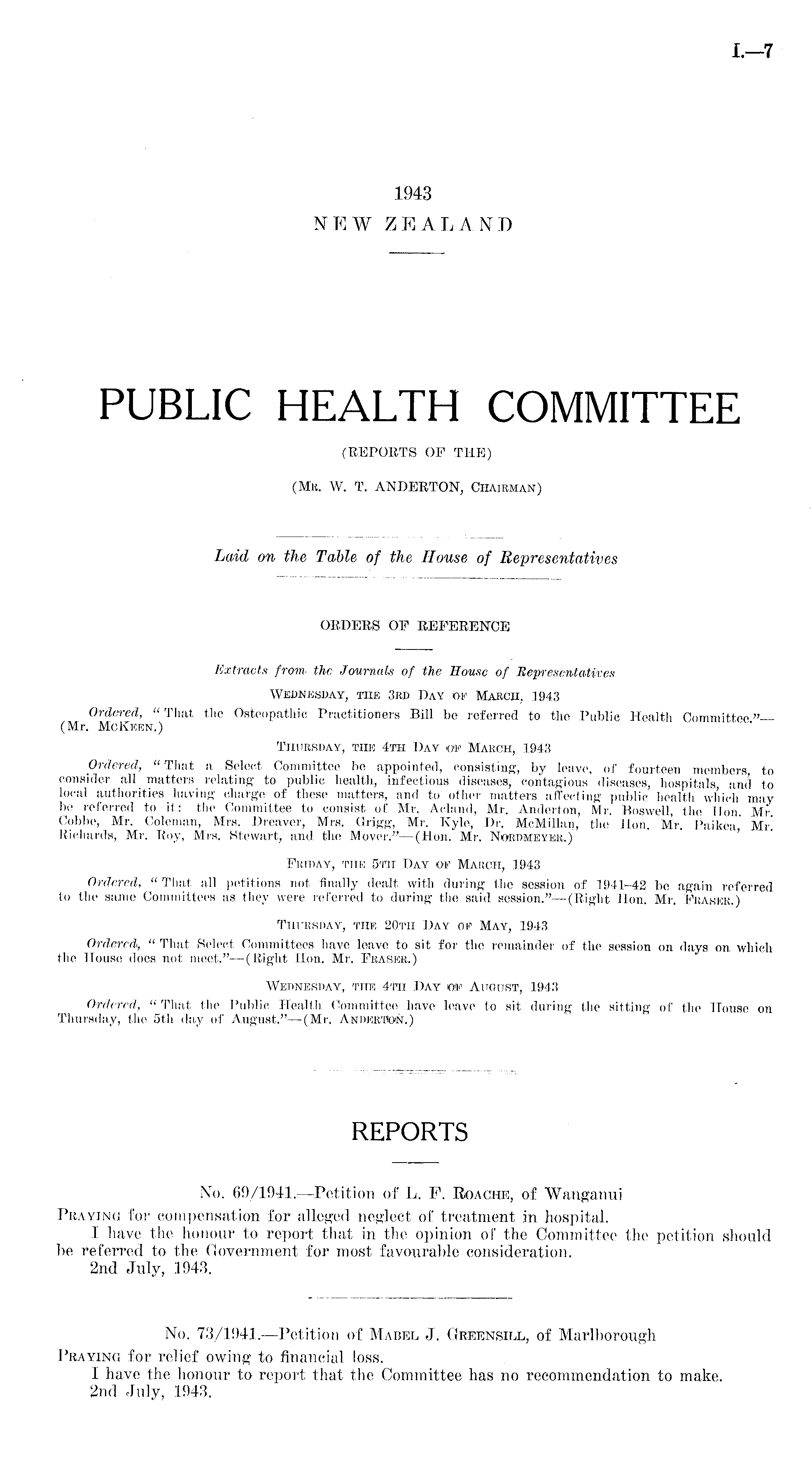 Extracts from, the Journals of the House of Representatives Wednesday, the 3rd Day of March, 1943 Ordered, "That the Osteopathic Practitioners Bill be referred to the Public Health Committee"— (Mr. McKisen.) Thursday, the 4th Day op March, 1943 Ordered, " That a Select Committee be appointed, consisting, by leave, of fourteen members to consider all matters relating to public health, infectious diseases, contagious diseases, hospitals and to local authorities having charge of these matters, and to other matters affecting public health which may be referred to it: the Committee to consist of Mr. Acland, Mr. Anderton, Mr. Boswell, the Hon. Mr. Cobbe, Mr. Coleman, Mrs. Dreaver, Mrs. Grigg, Mr. Kyle, Dr. McMillan, the Hon. Mr, Paikca Mr! Richards, Mr. Roy, Mrs. Stewart, and the Mover." —(Hon. Mr. Nordmeyer.) Friday, the sth Day of March, 1943 Ordered, "That all petitions not finally dealt with during the session of 1941-42 bo again referred to the same Committees as they were referred to during the said session." —(Right Hon. Mr. Phaser.) Thursday, the 20th Day of May, 1943 Ordered, " That Select Committees have leave to sit for the remainder of the session on days on which the House does not meet." —(Right Hon. Mr. Fraser.) Wednesday, the 4tii Day of August, 1943 Ordered, " That the Public Health Committee have leave to sit during the sitting of the House on Thursday, the sth day of August."—(Mr. Anderson.)