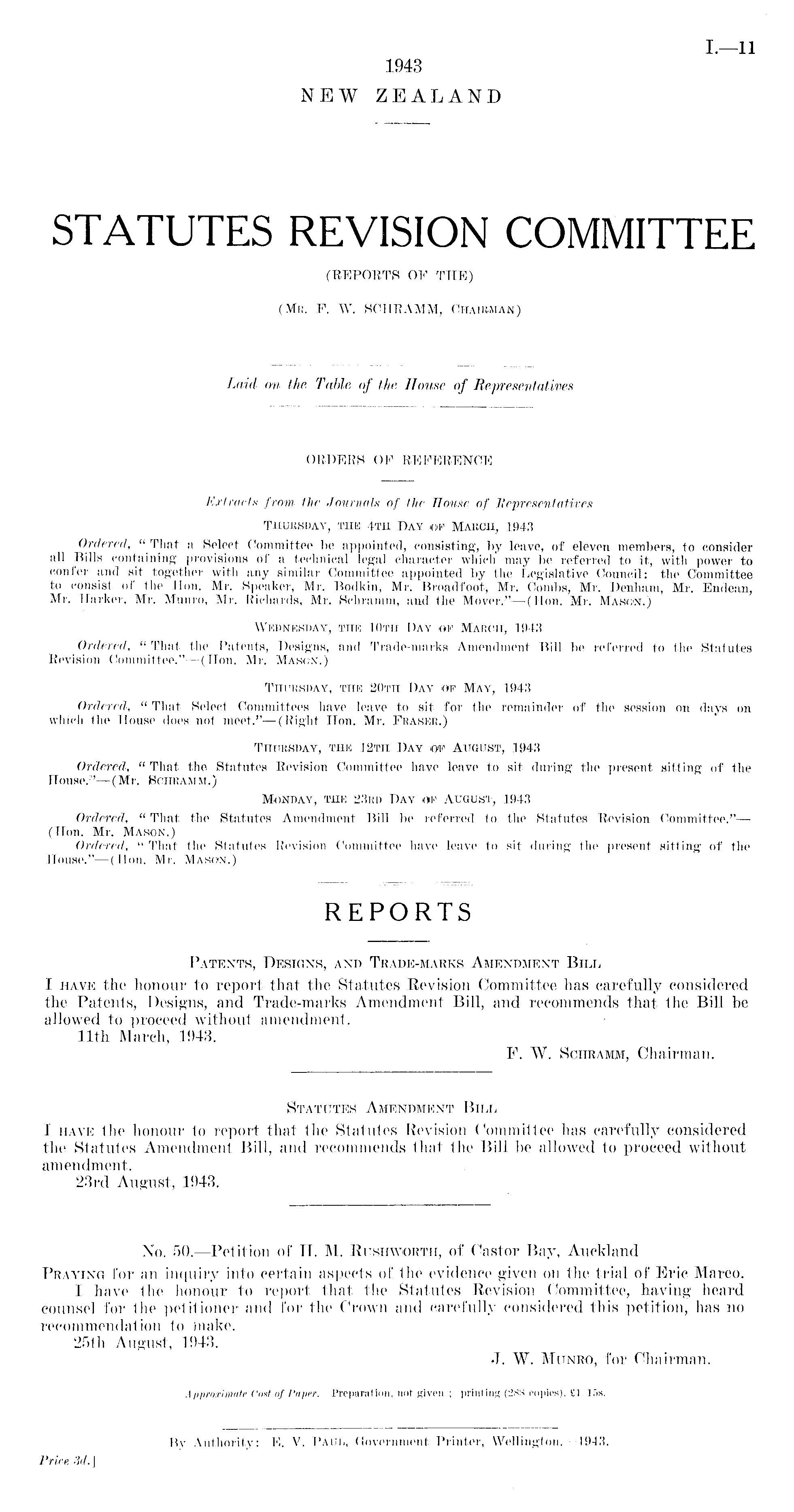 REPORTS Patents, Designs, and Trade-marks Amendment Bill I have the honour to report that the Statutes Revision Committee has carefully considered the Patents, Designs, and Trade-marks Amendment Bill, and recommends that the Bill be allowed to proceed without amendment. 11th March, 1943. F. W. Schramm, Chairman.