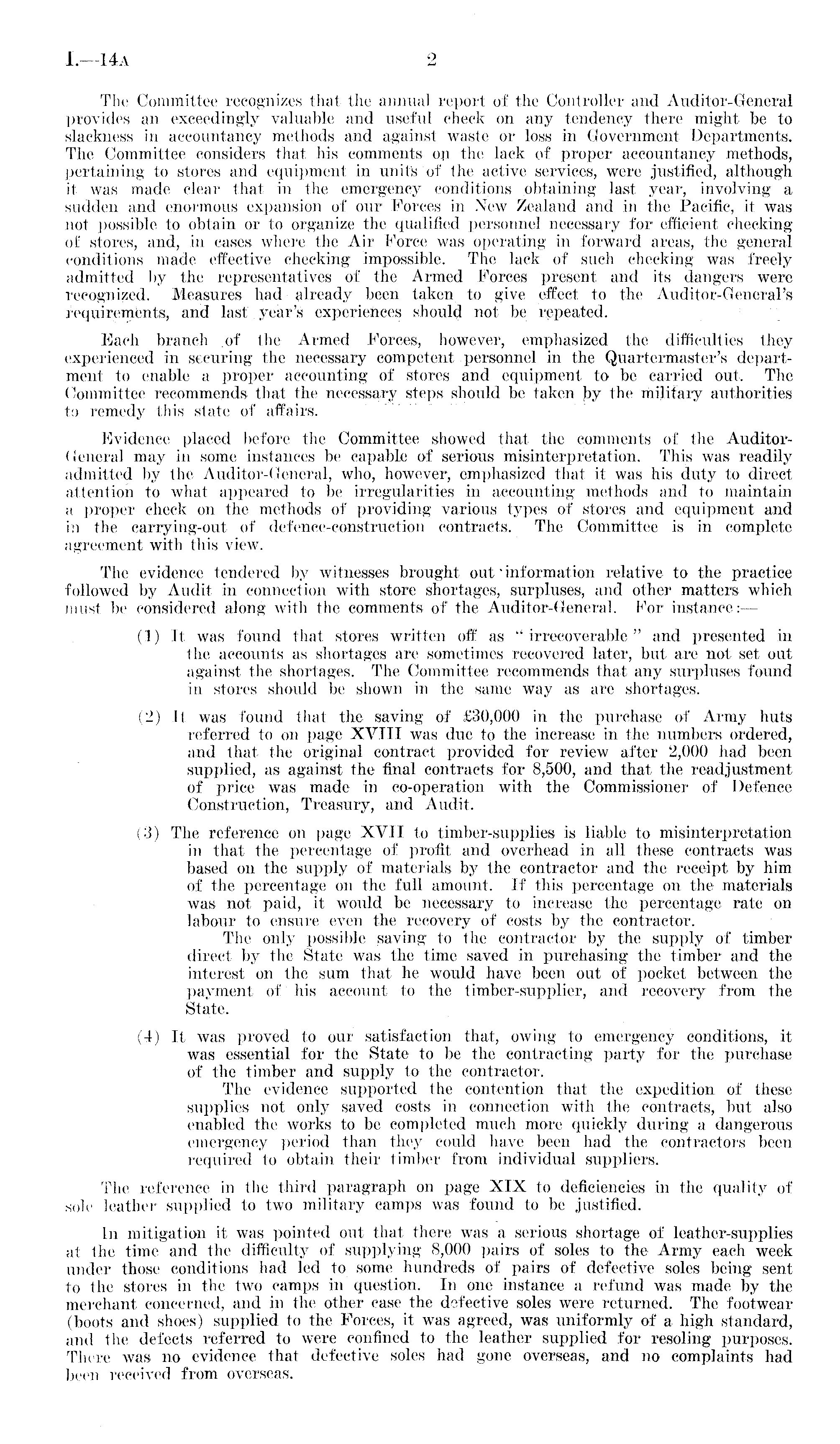 The Committee recognizes that the annual report of the Controller and Auditor-General provides an exceedingly valuable and useful check on any tendency there might be to slackness in accountancy methods and against waste or loss in Government Departments. The Committee considers that his comments on the lack of proper accountancy methods, pertaining to stores and equipment in units of the active services, were justified, although it was made clear that in the emergency conditions obtaining last year, involving a sudden and enormous expansion of our Forces in New Zealand and in the Pacific, it was not possible to obtain or to organize the qualified personnel necessary for efficient checking of stores, and, in cases where the Air Force was operating in forward areas, the general conditions made effective checking impossible. The lack of such checking was freely admitted by the representatives of the Armed Forces present and its dangers were recognized. Measures had already been taken to give effect to the Auditor-General's requirements, and last year's experiences should not be repeated. Each branch .of the Armed Forces, however, emphasized the difficulties they experienced in securing the necessary competent personnel in the Quartermaster's department to enable a proper accounting of stores and equipment to be carried out. The Committee recommends that the necessary steps should be taken by the military authorities to remedy this state of affairs. Evidence placed before the Committee showed that the comments of the AuditorGeneral may in some instances be capable of serious misinterpretation. This was readily admitted by the Auditor-General, who, however, emphasized that it was his duty to direct attention to what appeared to be irregularities in accounting methods and to maintain a proper check on the methods of providing various types of stores and equipment and in the carrying-out of defence-construction contracts. The Committee is in complete agreement with this view. The evidence tendered by witnesses brought out "information relative to the practice followed by Audit in connection with store shortages, surpluses, and other matters which must be considered along with the comments of the Auditor-General. For instance:— (1) It was found that stores written off as "irrecoverable" and presented in the accounts as shortages are sometimes recovered later, but are not set out against the shortages. The Committee recommends that any surpluses found in stores should be shown in the same way as are shortages. (2) It was found that the saving of £30,000 in the purchase of Army huts referred to on page XVIII was due to the increase in the numbers ordered, and that the original contract provided for review after 2,000 had been supplied, as against the final contracts for 8,500, and that the readjustment of price was made in co-operation with the Commissioner of Defence Construction, Treasury, and Audit. (3) The reference on page XVII to timber-supplies is liable to misinterpretation in that the percentage of profit and overhead in all these contracts was based on the supply of materials by the contractor and the receipt by him of the percentage on the full amount. If this percentage on the materials was not paid, it would be necessary to increase the percentage rate on labour to ensure even the recovery of costs by the contractor. The only possible saving to the contractor by the supply of timber direct by the State was the time saved in purchasing the timber and the interest on the sum that he would have been out of pocket between the payment of his account to the timber-supplier, and recovery from the State. (4) It was proved to our satisfaction that, owing to emergency conditions, it was essential for the State to be the contracting party for the purchase of the timber and supply to the contractor. The evidence supported the contention that the expedition of these supplies not only saved costs in connection with the contracts, but also enabled the works to be completed much more quickly during a dangerous emergency period than they could have been had the contractors been required to obtain their timber from individual suppliers. The reference in the third paragraph on page XIX to deficiencies in the quality of sole leather supplied to two military camps was found to be justified. In mitigation it was pointed out that there was a serious shortage of leather-supplies at the time and the difficulty of supplying 8,000 pairs of soles to the Army each week under those conditions had led to some hundreds of pairs of defective soles being sent to the stores in the two camps in question. In one instance a refund was made by the merchant concerned, and in the other case the defective soles were returned. The footwear (boots and shoes) supplied to the Forces, it was agreed, was uniformly of a high standard, and the defects referred to were confined to the leather supplied for resoling purposes. There was no evidence that defective soles had gone overseas, and no complaints had been received from overseas.