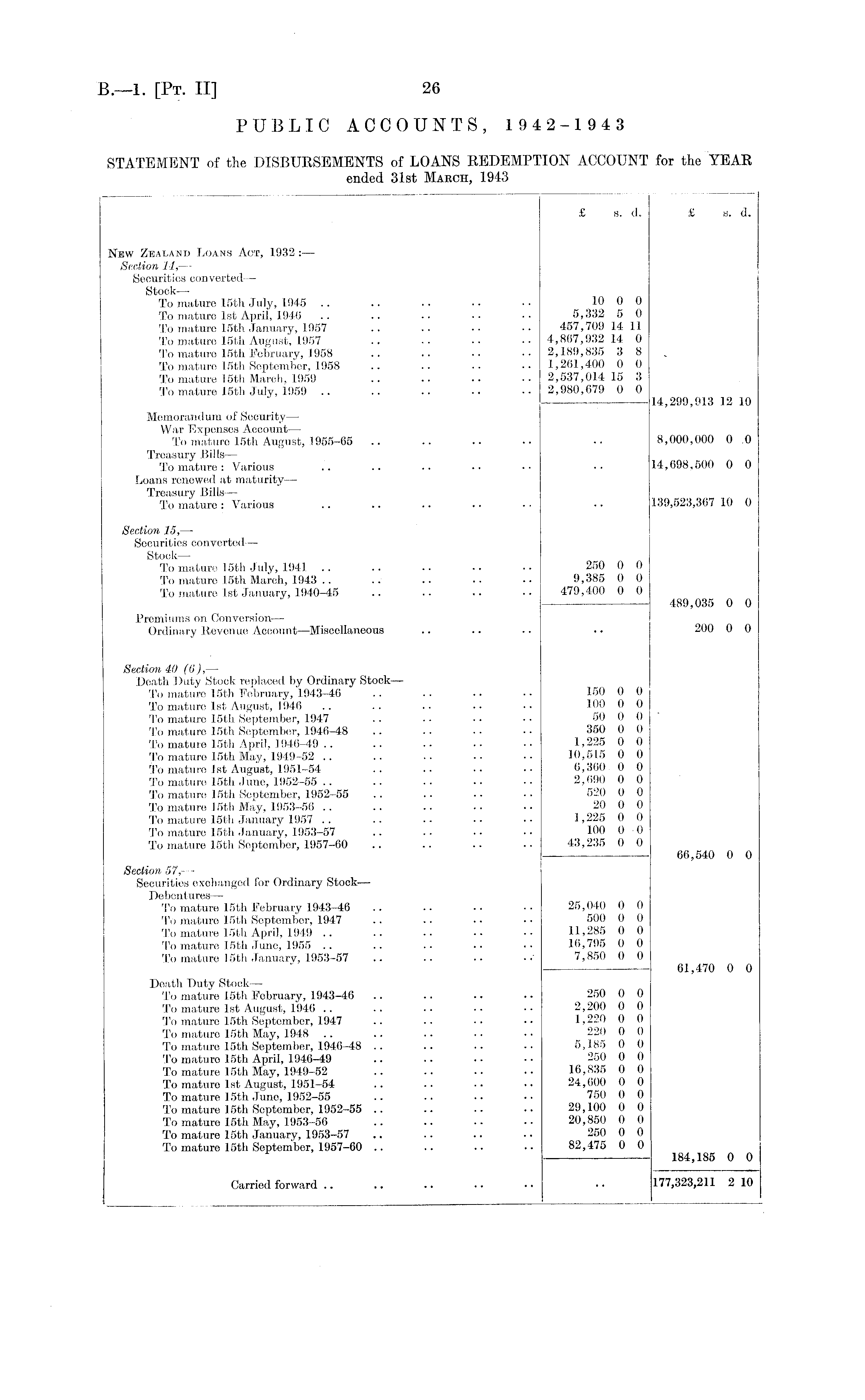 £ s. d. £ s. d. Nbw Zealand Loans Act, 1932 Section 14, — Securities converted — Stock — To mature 15th July, 1945 .. .. .. ■ • • • 10 0 0 To mature 1st April, 1946 .. .. .. •• 5,332 5 0 To mature 15th January, 1957 .. .. •• 457,709 14 11 To mature 15th August, 1957 .. .. •• 4,867,932 14 0 To mature 15th February, 1958 .. .. .. •• 2,189,835 3 8 To mature 15th September, 1958 .. ■■ •• 1,261,400 0 0 To mature 15th March, 1959 .. .. .. •• 2,537,014 15 3 To mature 15th July, 1959 .. .. .. .. •• 2,980,679 0 0 14,299,913 12 10 Memorandum of Security— War Expenses Account — To mature 15th August, 1955-65 .. .. .. •• 8,000,000 0 ,0 Treasury Bills— To mature: Various .. .. .. •• 14,698,500 0 0 Loans renewed at maturity— Treasury Bills— To mature: Various .. .. .. • ■ ■ • • • 139,523,367 10 0 Section 15, — Securities converted—■ Stock — To mature 15th July, 1941 .. .. .. .. •• 250 0 0 To mature 15th March, 1943 .. .. .. •• 9,385 0 0 To mature 1st January, 1940-45 .. .. .. •• 479,400 0 0 489,035 0 0 Premiums on Conversion— Ordinary Revenue Account—Miscellaneous .. .. •. • • 200 0 0 Section 40 (6),— Death Duty Stock replaced by Ordinary Stock — To mature 15th February, 1943-46 .. .. • • • • 150 0 0 To mature 1st August, 1946 .. .. • • • • • • 100 0 0 To mature 15th September, 1947 .. •. ■ • • • 50 0 0 To mature 15th September, 1946-48 .. . • .. • • 350 0 0 To mature 15th April, 1946-49 .. .. • • • • • • 1,225 0 0 To mature 15th May, 1949-52 .. .. .. .. 10,515 0 0 To mature 1st August, 1951-54 .. .. 6,360 0 0 To mature 15th June, 1952-55 .. .. .. •• •• 2,690 0 0 To mature 15th September, 1952-55 .. .. . • • • 520 0 0 To mature 15th May, 1953-56 .. .. . • • • • • 20 0 0 To mature 15th January 1957 .. .. •• 1,225 0 0 To mature 15th January, 1953-57 .. . • • • • • 100 0 0 To mature 15th September, 1957-60 .. . • .. •• 43,235 0 0 66,540 0 0 Section 57, — Securities exchanged for Ordinary Stock — Debentures — To mature 15th February 1943-46 .. .. •• •• 25,040 0 0 To mature 15th September, 1947 .. ■ • • ■ • • 500 0 0 To mature 15th April, 1949 .. .. •• •• 11,285 0 0 To mature 15th June, 1955 .. .. .. .. .. 16,795 0 0 To mature 15th January, 1953-57 .. •• • 7,850 0 0 61,470 0 0 Death Duty Stock — To mature 15th February, 1943-46 .. .. .. •• 250 0 0 To mature 1st August, 1946 .. .. .. •• •• 2,200 0 0 To mature 15th September, 1947 .. .. •• •• 1,220 0 0 To mature 15th May, 1948 .. .. . ■ • • • • 220 0 0 To mature 15th September, 1946-48 .. .. .. 5,185 0 0 To mature 15th April, 1946-49 .. . • • • • • 250 0 0 To mature 15th May, 1949-52 .. •• •• 16,835 0 0 To mature 1st August, 1951-54 .. .. •• 24,600 0 0 To mature 15th June, 1952-55 .. ■. • • • • 750 0 0 To mature 15th September, 1952-55 .. •• 29,100 0 0 To mature 15th May, 1953-56 .. .. •• •• 20,850 0 0 To mature 15th January, 1953-57 .. .. .. .. 250 0 0 To mature 15th September, 1957-60 .. .. .. •• 82,475 0 0 184,185 0 0 Carried forward .. .. . ■ •. • • • • 177,323,211 2 10