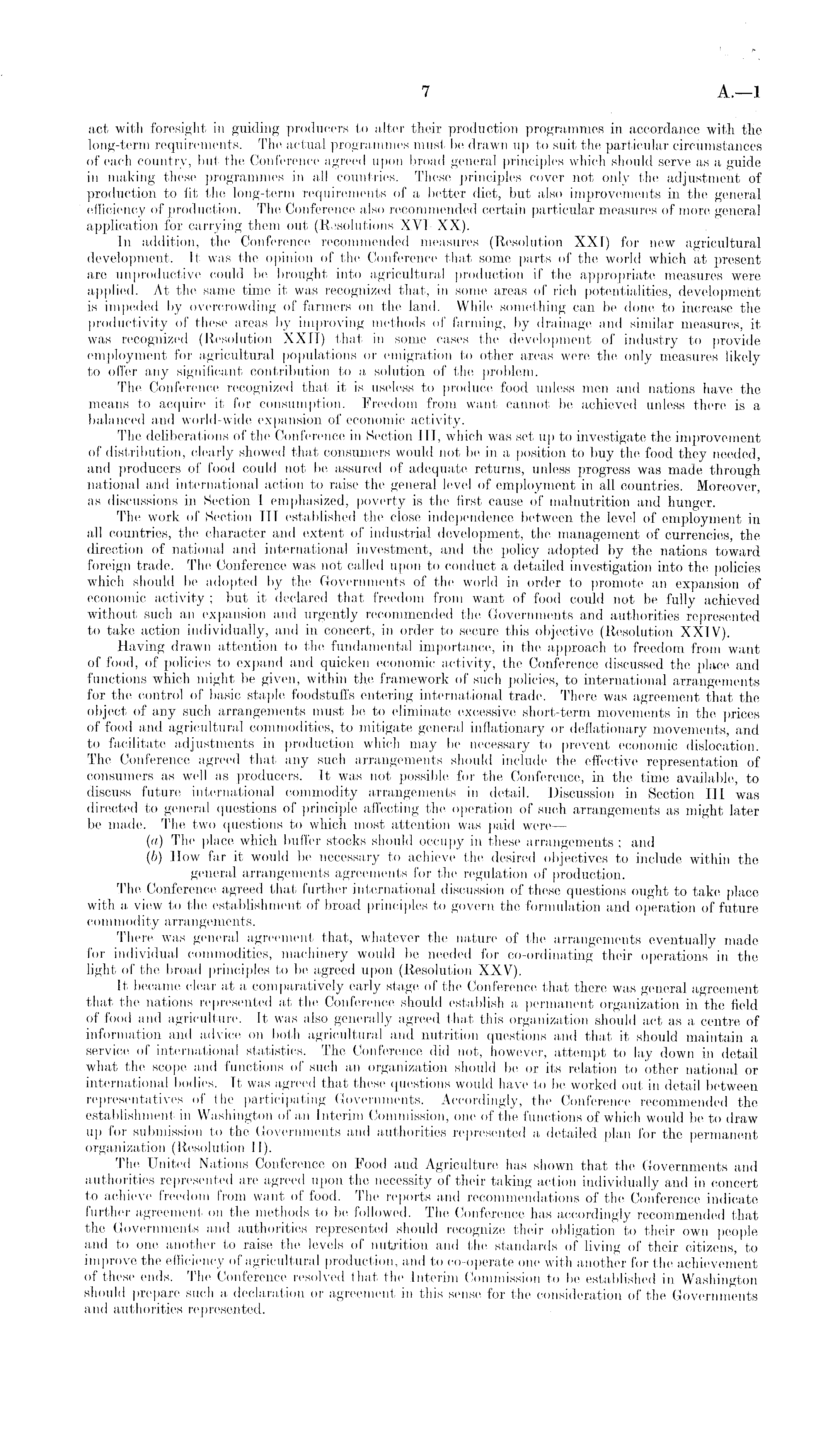 act with foresight in guiding producers to alter their production programmes in accordance with the long-term requirements. The actual programmes must be drawn up to suit the particular circumstances of each country, but the Conference agreed upon broad general principles which should serve as a guide in making these programmes in all countries. These principles cover not only the adjustment of production to fit the long-term requirements of a better diet, but also improvements in the general efficiency of production. The Conference also recommended certain particular measures of more general application for carrying them out (Resolutions XYI-XX). In addition, the Conference recommended measures (Resolution XXI) for new agricultural development. It was the opinion of the Conference that some parts of the world which at present are unproductive could be brought into agricultural production if the appropriate measures were applied. At the same time it was recognized that, in some areas of rich potentialities, development is impeded by overcrowding of farmers on the land. While something can be done to increase the productivity of these areas by improving methods of farming, by drainage and similar measures, it was recognized (Resolution XXII) that in some cases the development of industry to provide employment for agricultural populations or emigration to other areas were the only measures likely to offer any significant contribution to a solution of the problem. The Conference recognized that it is useless to produce food unless men and nations have the means to acquire it for consumption. Freedom from want cannot be achieved unless there is a balanced and world-wide expansion of economic activity. The deliberations of the Conference in Section 111, which was set up to investigate the improvement of distribution, clearly showed that consumers would not be in a position to buy the food they needed, and producers of food could not be assured of adequate returns, unless progress was made through national and international action to raise the general level of employment in all countries. Moreover, as discussions in Section I emphasized, poverty is the first cause of malnutrition and hunger. The work of Section 111 established the close independence between the level of employment in all countries, the character and extent of industrial development, the management of currencies, the direction of national and international investment, and the policy adopted by the nations toward foreign trade. The Conference was not called upon to conduct a detailed investigation into the policies which should be adopted by the Governments of the world in order to promote an expansion of economic activity ; but it declared that freedom from want of food could not be fully achieved without such an expansion and urgently recommended the Governments and authorities represented to take action individually, and in concert, in order to secure this objective (Resolution XXIV). Having drawn attention to the fundamental importance, in the approach to freedom from want of food, of policies to expand and quicken economic activity, the Conference discussed the place and functions which might be given, within the framework of such policies, to international arrangements for the control of basic staple foodstuffs entering international trade. There was agreement that the object of any such arrangements must be to eliminate excessive short-term movements in the prices of food and agricultural commodities, to mitigate general inflationary or deflationary movements, and to facilitate adjustments in production which may be necessary to prevent economic dislocation. The Conference agreed that any such arrangements should include the effective representation of consumers as well as producers. It was not possible for the Conference, in the time available, to discuss future international commodity arrangements in detail. Discussion in Section 111 was directed to general questions of principle affecting the operation of such arrangements as might later be made. The two questions to which most attention was paid were — («) The place which buffer stocks should occupy in these arrangements ; and (6) How far it would be necessary to achieve the desired objectives to include within the general arrangements agreements for the regulation of production. The Conference agreed that further international discussion of these questions ought to take place with a view to the establishment of broad principles to govern the formulation and operation of future commodity arrangements. There was general agreement that, whatever the nature of the arrangements eventually made for individual commodities, machinery would be needed for co-ordinating their operations in the light of the broad principles to be agreed upon (Resolution XXV). It became clear at a comparatively early stage of the Conference that there was general agreement that the nations represented at the Conference should establish a permanent organization in the field of food and agriculture. It was also generally agreed that this organization should act as a centre of information and advice on both agricultural and nutrition questions and that it should maintain a service of international statistics. The Conference did not, however, attempt to lay down in detail what the scope and functions of such an organization should bo or its relation to other national or international bodies. It was agreed that these questions would have to bo worked out in detail between representatives of the participating Governments. Accordingly, the Conference recommended the establishment in Washington of an Interim Commission, one of the functions of which would be to draw up for submission to the Governments and authorities represented a detailed plan for the permanent organization (Resolution II). The United Nations Conference on Food and Agriculture has shown that the Governments and authorities represent