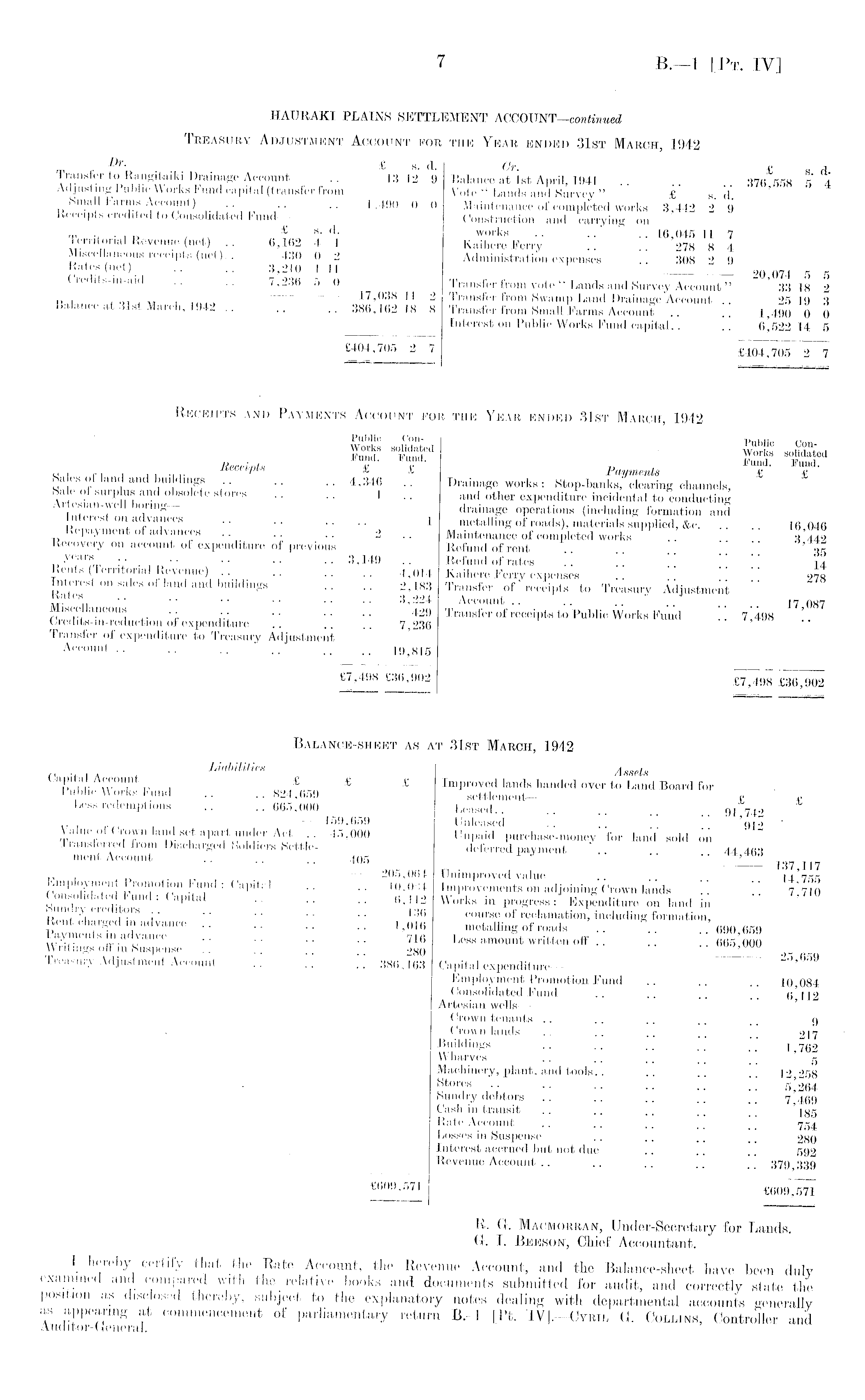 HAURAKI PLAINS SETTLEMENT ACCOUNT—continued Treasury Adjustment Account for the Year ended 31st March, 1942 Dr. £ s. d. Cr £ Transfer to Rangitaiki Drainage Account .. 13 12 9 Balance at ist April, 1941 .. .. T7fi fifiß * i Adjusting lublic Works Fund capital (transfer from Vote " Lands and Survey£ s . d. ' »ma < arms Account) • •• .. 1,490 0 0 Maintenance of completed works 3,442 2 9 Receipts credited to Consolidated Fund— Construction and carrying on rr ■ • , £ s. d. works .. .. J6 045 1] 7 Territorial Revenue (net) .. 6,162 4 I Kaihere Perry .. .. '278 8 4 Miscellaneous receipts (net).. 430 0 2 Administration expenses .. 308 2 9 Rates (net) .. .. 3,210 111 * 20 074 - . Credits-in-aid .. .. 7,236 5 0 Transfer from vote" Lands and Survey Account" '3318 2 17,038 11 2 Transfer from Swamp Land Drainage Account .. 25 19 3 Balance at 31st March, 1942 .. 386,162 18 8 Transfer from Small Parms Account .. .. 1,490 0 0 Interest on Public Works Fund capital.. .. 14 5 £404,705 2 £404,705 2 7 Receipts and Payments Account for the Year ended ,31st March, 1942 Public Con- r Piihlir fnn Funf Xt d Receive 4? / u , Eund - Fund, a 1 j I, -receipts i i Payments £ £ "i g + + '" •' •• 4,346 .. Drainage works: Stop-banks, clearing channels, eof surplus and obsolete stores .. .. 1 .. and other expenditure incidental to conducting ' !3~ drainage operations (including formation and Interest on advances .. .. .... 1 metalling of roads), materials supplied, &c. .. 16 046 Repayment of advances 2 .. Maintenance of completed works 3440 Recovery on account of expenditure of previous Refund of rent .. .. qr •• •• ..3,149 .. Refund of rates ~ .. .. 14 cnts ( erritorial Revenue) .. .. .. .. 4,014 Kaihere Ferry expenses .. 278 Interest on sales of land and buildings .. .. 2,183 Transfer of receipts to Treasury Adjustment " S ates „ 3,224 Account.. .. .. .. . 17 087 iscellaneous .. ~ ~ 429 Transfer of receipts to Public Works Fund .7 498 Credits-m-reduction of expenditure .. .... 7,236 ' " Transfer of expenditure to Treasury Adjustment Account.. .. .. .. 19,815 £7 ' 498 £36 ' 902 £7,498 £36,902 Balance-sheet as at 31st March, 1942 Liabilities Assets Capital Account— £ £ £ Improved lands handed over to Land Board for Public Works Fund .. ..824,659 settlement— £ f Less redemptions .. .. 665,000 Leased 91 749 , J " 159,659 Unleased " " 910 ' 45 ' 000 Un P aid P urc ' laso -money for land sold on Transferred from Discharged Soldiers Settle- deferred payment 44 463 ment, Account .. .. .. 405 l J 137 117 u ■ , , r , , „ — 205,064 Unimproved value .. .. '14'7^ Employment Promotion Fund: Capital .. .. 10,084 Improvements on adjoining Crown lands " 7710 Consolidated Fund: Capital 0,112 Works in progress: Expenditure on land in " ' Iw'rV™ 1 S I'' " " " ■' 136 course of reclamation, including formation, Rent charged m advance 1,016 metalling of roads .. 690 659 Payments in advance 716 Less amount written off .. .. '■665 000 Writings oft m Suspense .. .. .. ..280 ' u rt Treasury Adjustment Account 386,163 Capital expenditure— ' Employment Promotion Fund .. ~ .. 10,084 Consolidated Fund .. .. 6112 Artesian wells— Crown tenants .. \. .. ~ 9 Crown lands .. .. .. .. _, 217 Buildings . . 1 7«n Wharves .. .. " 5 Machinery, plant, and tools.. .. .. ... ]2 258 Stores .. .. .. _ 5'264 Sundry debtors .. .. .. 7 469 Cash in transit .. .. .. .. ' jgg Rate Account .. .. ~ ~ 7,54 Losses in Suspense .. .. .. _ _ 280 Interest accrued but not due .. .. .. 592 Revenue Account .. ~ .. .. 379 33!) £(ioi) ' 571 M R. G. Macmorran, Under-Secretary for Lands. G. I. Beeson, Chief Accountant. I hereby certify that the Rate Account, the Revenue Account, and the Balance-sheet have been duly examined and compared with the relative books and documents submitted for audit, and correctly state the position as disclosed thereby, subject to the explanatory notes dealing with departmental accounts generally AudEGenLf CommenoCment of Parliamentary return 8.-l [Pt. G. Collins, Controller and