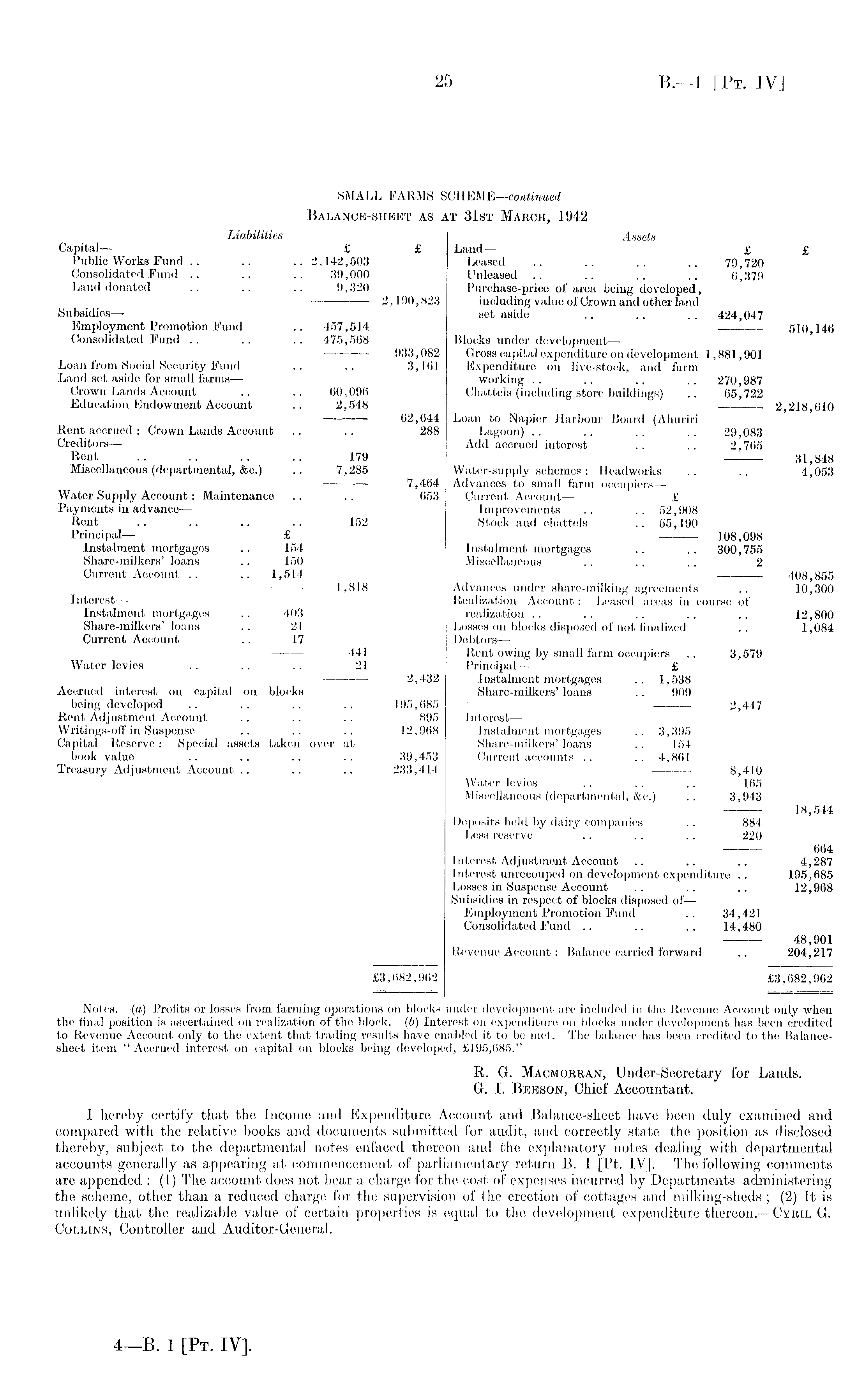 SMALL FARMS SCHEME—continued Balance-sheet as at 31st March, 1942 Liabilities Assets Capital— £ £ Land— £ £ Public Works Fund .. .. .. 2,142,503 Leased .. .. .. .. 79,720 Consolidated Fund .. .. .. 39,000 Unleased .. .. .. .. 6,379 Land donated .. .. .. 9,320 Purchase-price of area being developed, 2,190,823 including value of Crown and other land Subsidies— • set aside .. .. .. 424,047 Employment Promotion Fund .. 457,514 510,146 Consolidated Fund .. .. .. 475,568 Blocks under development—■ 933,082 Gross capital expenditure on development 1,881,901 Loan from Social Security Fund .. .. 3,161 Expenditure on live-stock, and farm Land set aside for small farms — working .. .. .. .. 270,987 Crown Lands Account .. .. 60,096 Chattels (including store buildings) .. 65,722 Education Endowment Account .. 2,548 2,218,610 62,644 Loan to Napier Harbour Board (Ahuriri Rent accrued: Crown Lands Account .. .. 288 Lagoon) .. .. .. .. 29,083 Creditors— Add accrued interest .. .. 2,765 Rent .. .. .. .. 179 31,848 Miscellaneous (departmental, &c.) .. 7,285 Water-supply schemes: Headworks .. .. 4,053 7,464 Advances to small farm occupiers— Water Supply Account: Maintenance .. .. 653 Current Account— £ Payments in advance— Improvements .. .. 52,908 Rent .. .. .. .. 152 Stock and chattels .. 55,190 Principal— £ 108,098 Instalment mortgages .. 154 Instalment mortgages .. .. 300,755 Share-milkers' loans .. 150 Miscellaneous .. .. . . 2 Current Account .. .. 1,514 408,855 1,818 Advances under share-milking agreements .. 10,300 Interest— Realization Account: Leased areas in course of Instalment mortgages .. 403 realization .. .. .. .. .. 12,800 Share-milkers' loans .. 21 Losses on blocks disposed of not finalized .. 1,084 Current Account .. 17 Debtors— 441 Rent owing by small farm occupiers .. 3,579 Water levies .. .. .. 21 Principal— £ 2,432 Instalment mortgages .. 1,538 Accrued interest on capital on blocks Share-milkers' loans .. 909 being developed .. .. .. .. 195,685 2,447 Rent Adjustment Account .. .. .. 895 Interest— Writings-off in Suspense .. .. .. 12,968 Instalment mortgages .. 3,395 Capital Reserve: Special assets taken over at Share-milkers' loans .. 154 book value .. .. .. .. 39,453 Current accounts .. .. 4,861 Treasury Adjustment Account .. .. .. 233,414 8,410 Water levies .. .. .. 165 Miscellaneous (departmental, &c.) .. 3,943 ■ 18,544 Deposits held by dairy companies .. 884 Less reserve .. .. .. 220 664 Interest Adjustment Account .. .. .. 4,287 Interest unrecouped on development expenditure .. 195,685 Losses in Suspense Account .. .. .. 12,968 Subsidies in respect of blocks disposed of— Employment Promotion Fund .. 34,421 Consolidated Fund .. .. .. 14,480 48,901 Revenue Account: Balance carried forward .. 204,217 £3,682,962 £3,682,962 Notes.—(a) Profits or losses from farming operations on blocks under development are included in the Revenue Account only when the final position is ascertained on realization of the block, (b) Interest on expenditure on blocks under development has been credited to Revenue Account only to the extent that trading results have enabled it to be met. The balance has been credited to the Balancesheet item " Accrued interest on capital on blocks being developed, £195,685." R. G. Macmorran, Under-Secretary for Lands. G. I. Beeson, Chief Accountant. I hereby certify that the Income and Expenditure Account and Balance-sheet have been duly examined and compared with the relative books and documents submitted for audit, and correctly state the position as disclosed thereby, subject to the departmental notes enfaced thereon and the explanatory notes dealing with departmental accounts generally as appearing at commencement of parliamentary return B. 1 [Pt. IV]. The following comments are appended : (1) The account does not bear a charge for the cost of expenses incurred by Departments administering the scheme, other than a reduced charge for the supervision of the erection of cottages and milking-sheds; (2) It is unlikely that the realizable value of certain properties is equal to the development expenditure thereon. —Cyril G. Collins, Controller and Auditor-General.