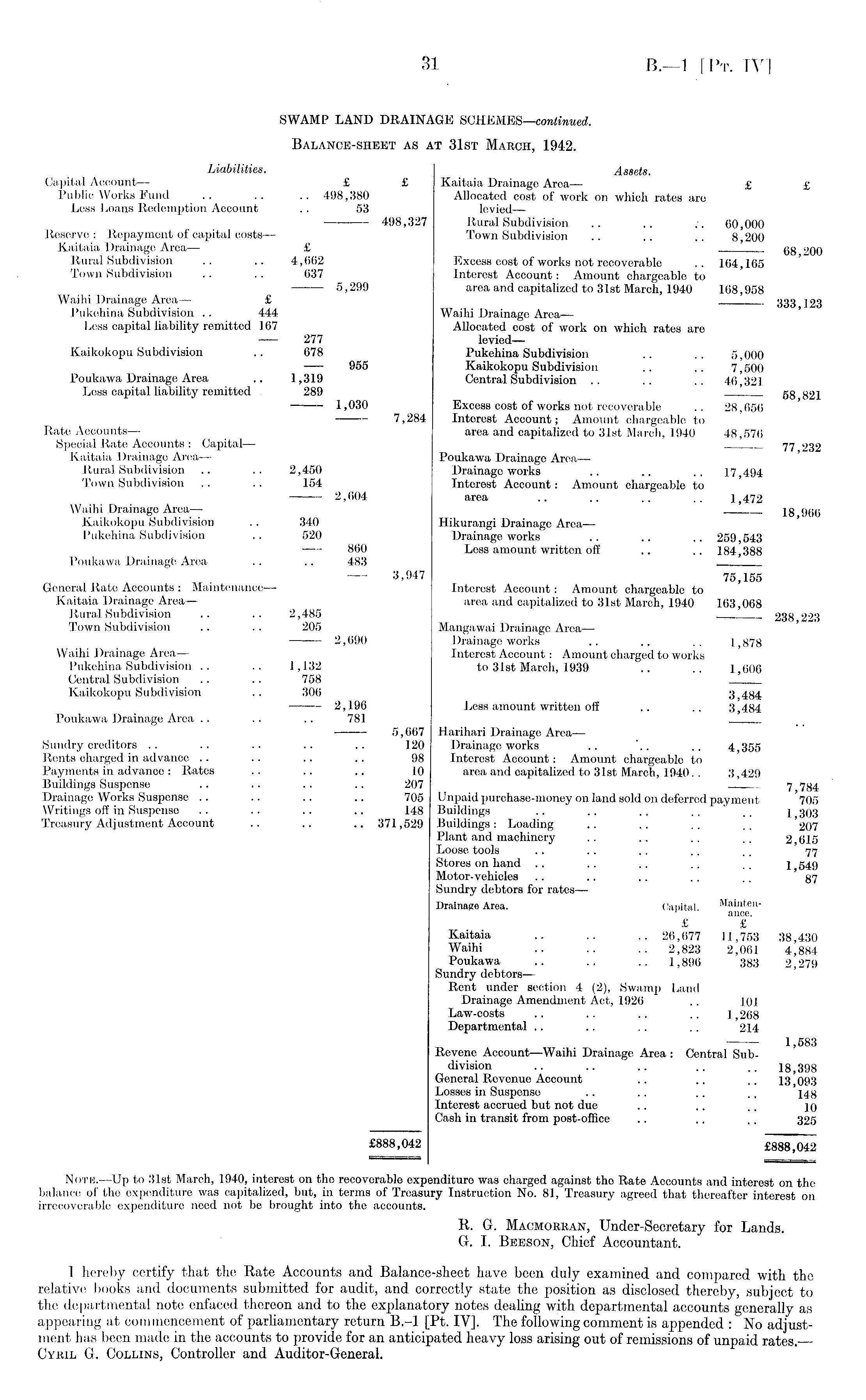 SWAMP LAND DRAINAGE SCHEMES—continued. Balance-sheet as at 31st March, 1942. Liabilities. Assets. Capital Account— £ £ Kaitaia Drainage Area — £ £ Public Works Fund .. .. .. 498,380 Allocated cost of work on which rates are Less Loans Redemption Account .. 53 levied— 498,327 Rural Subdivision .. .. CO,OOO Reserve: Repaymont of capital costs— Town Subdivision .. .. .. 8,200 Kaitaia Drainage Area— £ gg 200 Rural Subdivision .. .. 4,662 Excess cost of works not recoverable .. 164,165 Town Subdivision .. .. 637 Interest Account: Amount chargeable to 5,299 area and capitalized to 31st March, 1940 108,958 Waihi Drainage Area— £ 333 J23 Pukchina Subdivision .. 444 Waihi Drainage Area— Less capital liability remitted 167 Allocated cost of work 011 which rates are 277 levied— Kaikokopu Subdivision .. 678 Pukehina Subdivision .. .. 5,000 955 Kaikokopu Subdivision .. .. 7,500 Poukawa Drainage Area .. 1,319 Central Subdivision .. .. .. 46,321 Less capital liability remitted 289 L. gg §21 1,030 Excess cost of works not recoverable .. 28,656 7,284 Interest Account; Amount chargeable to Rate Accounts'— area and capitalized to 31st March, 1940 48,576 Special Rate Accounts : Capital— 77 232 Kaitaia Drainage Area— Poukawa Drainage Area— Rural Subdivision .. .. 2,450 Drainage works .. .. .. 17,494 Town Subdivision .. .. 154 Interest Account: Amount chargeable to 2,604 area .. .. .. .. 1,472 Waihi Drainage Area — jg ggg Kaikokopu Subdivision .. 340 Hikurangi Drainage Area — Pukehina Subdivision .. 520 Drainage works .. .. 259,543 860 Less amount written off .. .. 184,388 Poukawa Drainagb Area .. .. 483 3,947 75,155 General Rate Accounts : Maintenance— Interest Account: Amount chargeable to Kaitaia Drainage Area— area and capitalized to 31st March, 1940 163,068 Rural Subdivision .. .. 2,485 238 223 Town Subdivision .. . . 205 Mangawai Drainage Area — 2,690 Drainage works .. .. .. 1,878 Waihi Drainage Area — Interest Account: Amount charged to works Pukehina Subdivision .. .. 1,132 to 31st March, 1939 .. .. 1,606 Central Subdivision .. .. 758 Kaikokopu Subdivision .. 306 3,484 2,196 Less amount written off .. 3,484 Poukawa Drainage Area .. .. .. 781 5,667 Harihari Drainage Area — Sundry creditors . . .. .. .. .. 120 Drainage works .. '.. .. 4,355 Rents charged in advance .. .. .. .. 98 Interest Account: Amount chargeable to Payments in advance : Rates .. .. .. 1.0 area and capitalized to 31st March, 1940.. 3,429 Buildings Suspense .. .. .. .. 207 7 7g4 Drainage Works Suspense .. .. .. .. 705 Unpaid purchase-money on land sold on deferred payment 705 Writings off in Suspense .. .. .. .. 148 Buildings .. .. .. .. .. 1 303 Treasury Adjustment Account .. .. .. 371,529 Buildings: Loading .. .. .. .. '207 Plant and machinery .. .. .. .. 2,615 Loose tools .. .. .. .. .. 77 Stores on hand .. . . .. .. , . 1 549 Motor-vehicles .. .. .. .. .. g7 Sundry debtors for rates— Drainage Area. Capital Maintenanee. £ £ Kaitaia .. .. .. 26,677 11,753 38,430 Waihi .. .. .. 2,823 2,061 4,884 Poukawa .. .. .. 1,896 383 2,279 Sundry debtors— Rent under section 4 (2), Swamp Land Drainage Amendment Act, 1926 .. 101 Law-costs .. .. .. .. 1,268 Departmental .. .. .. .. 214 1,583 Revene Account—Waihi Drainage Area : Central Subdivision .. .. .. .. .. 18,398 General Revenue Account .. .. .. 13,093 Losses in Suspense .. .. .. ~ 14g Interest accrued but not due .. .. .. 10 Cash in transit from post-office .. .. .. 325 £888,042 £888,042 Note. —Up to 31st March, 1940, interest on the recoverable expenditure was charged against the Rate Accounts and interest on the balance of the expenditure was capitalized, but, in terms of Treasury Instruction No. 81, Treasury agreed that thereafter interest 011 irrecoverable expenditure need not be brought into the accounts. R. G. Macmorran, Under-Secretary for Lands. G. I. Beeson, Chief Accountant. I hereby certify that the Rate Accounts and Balance-sheet have been duly examined and compared with the relative books and documents submitted for audit, and correctly state the position as disclosed thereby, subject to the departmental note enfaced thereon and to the explanatory notes dealing with departmental accounts generally as appearing at commencement of parliamentary return 8.-l [Pt. IV], The following comment is appended : No adjustment has been made in the accounts to provide for an anticipated heavy loss arising out of remissions of unpaid rates. Cyril G. Collins, Controller and Auditor-General.