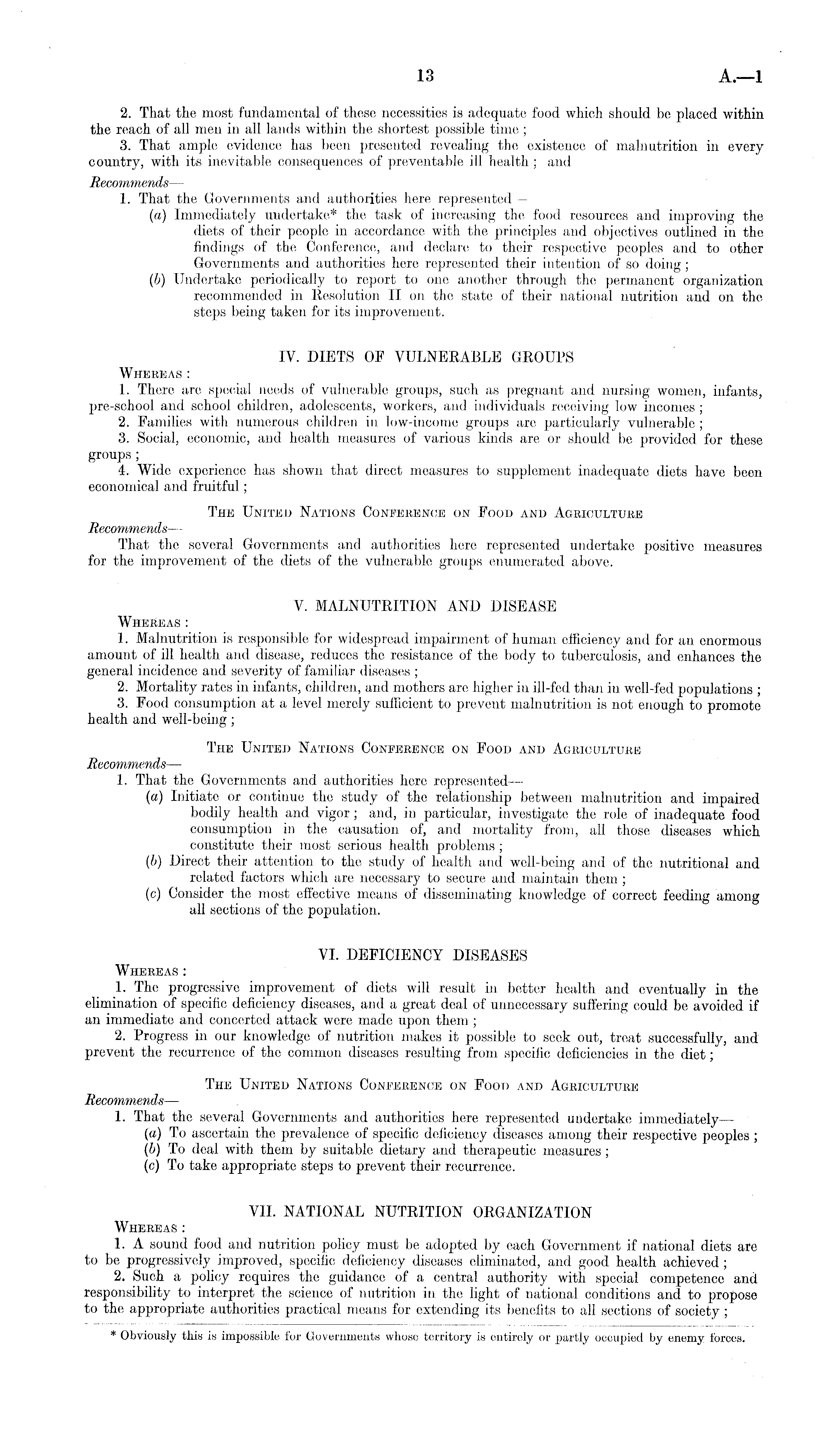 2. That the most fundamental of these necessities is adequate food which should be placed within the reach of all men in all lands within the shortest possible time ; 3. That ample evidence has been presented revealing the existence of malnutrition in every country, with its inevitable consequences of preventable ill health ; and Recommends— 1. That the Governments and authorities here represented — (a) Immediately undertake* the task of increasing the food resources and improving the diets of their people in accordance with the principles and objectives outlined in the findings of the Conference, and declare to their respective peoples and to other Governments and authorities here represented their intention of so doing ; (b) Undertake periodically to report to one another through the permanent organization recommended in Resolution II on the state of their national nutrition and on the steps being taken for its improvement. IV. DIETS OF VULNERABLE GROUPS Whereas : 1. There are special needs of vulnerable groups, such as pregnant and nursing women, infants, pre-school and school children, adolescents, workers, and individuals receiving low incomes ; 2. Families with numerous children in low-income groups are particularly vulnerable ; 3. Social, economic, and health measures of various kinds are or should be provided for these groups; 4. Wide experience has shown that direct measures to supplement inadequate diets have been economical and fruitful; The United Nations Conference on Food and Agriculture Recommends — That the several Governments and authorities here represented undertake positive measures for the improvement of the diets of the vulnerable groups enumerated above. V. MALNUTRITION AND DISEASE Whereas : 1. Malnutrition is responsible for widespread impairment of human efficiency and for ati enormous amount of ill health and disease, reduces the resistance of the body to tuberculosis, and enhances the general incidence and severity of familiar diseases ; 2. Mortality rates in infants, children, and mothers are higher in ill-fed than in well-fed populations ; 3. Food consumption at a level merely sufficient to prevent malnutrition is not enough to promote health and well-being ; The United Nations Conference on Food and Agriculture Recommends —• 1. That the Governments and authorities here represented— (a) Initiate or continue the study of the relationship between malnutrition and impaired bodily health and vigor; and, in particular, investigate the role of inadequate food consumption in the causation of, and mortality from, all those diseases which constitute their most serious health problems ; (b) Direct their attention to the study of health and well-being and of the nutritional and related factors which are necessary to secure and maintain them; (c) Consider the most effective means of disseminating knowledge of correct feeding among all sections of the population. VI. DEFICIENCY DISEASES Whereas : 1. The progressive improvement of diets will result in better health and eventually in the elimination of specific deficiency diseases, and a great deal of unnecessary suffering could be avoided if an immediate and concerted attack were made upon them ; 2. Progress in our knowledge of nutrition makes it possible to seek out, treat successfully, and prevent the recurrence of the common diseases resulting from specific deficiencies in the diet; The United Nations Conference on Food and Agriculture Recommends — 1. That the several Governments and authorities here represented undertake immediately— (a) To ascertain the prevalence of specific deficiency diseases among their respective peoples ; (b) To deal with them by suitable dietary and therapeutic measures; (c) To take appropriate steps to prevent their recurrence. VII. NATIONAL NUTRITION ORGANIZATION Whereas : 1. A sound food and nutrition policy must be adopted by each Government if national diets are to be progressively improved, specific deficiency diseases eliminated, and good health achieved ; 2. Such a policy requires the guidance of a central authority with special competence and responsibility to interpret the science of nutrition in the light of national conditions and to propose to the appropriate authorities practical means for extending its benefits to all sections of society ;