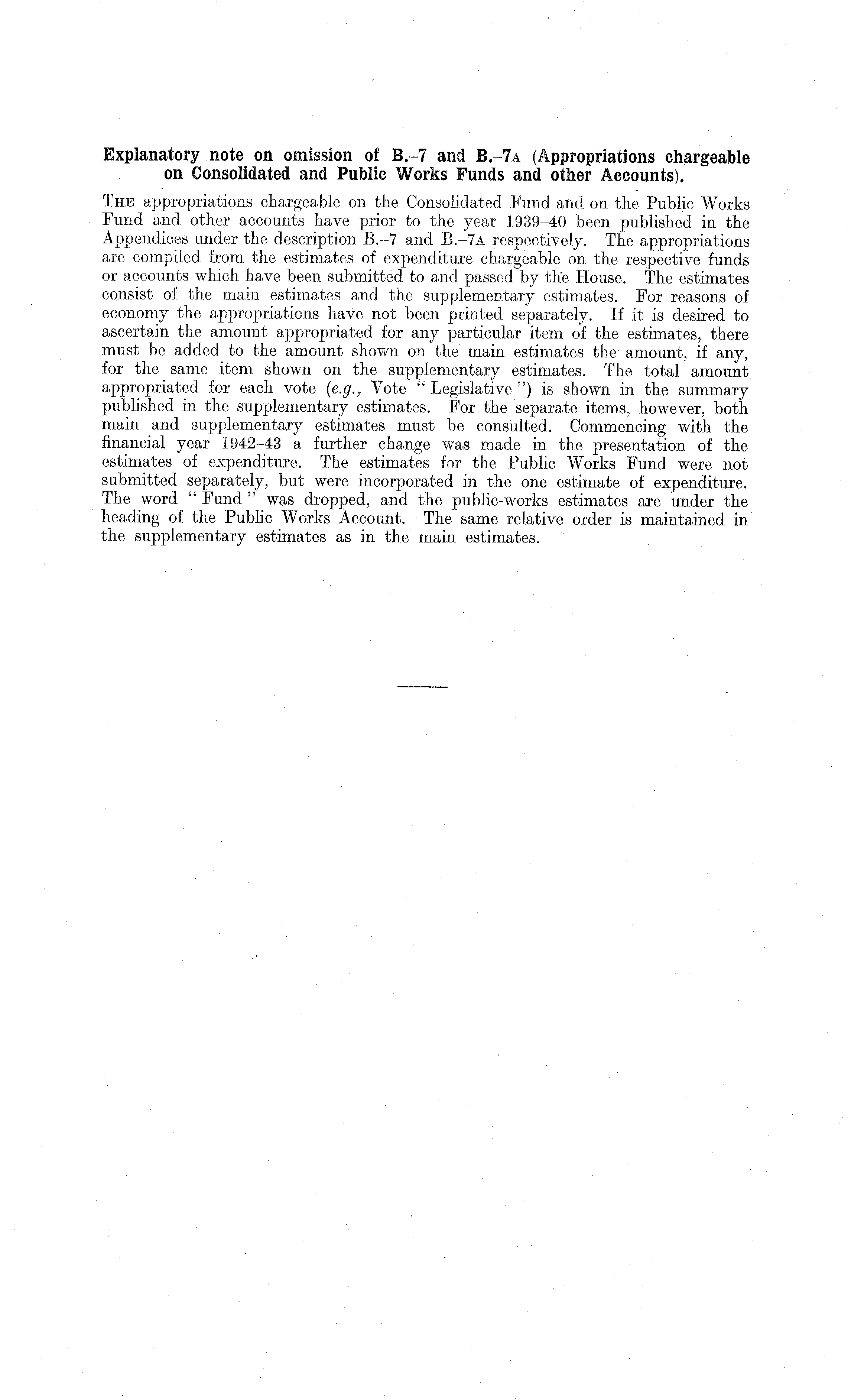 Explanatory note on omission of B. -7 and 8.-7 a (Appropriations chargeable on Consolidated and Public Works Funds and other Accounts). The appropriations chargeable on the Consolidated Fund and on the Public Works Fund and other accounts have prior to the year 1939-40 been published in the Appendices under the description B. 7 and B. 7a respectively. The appropriations are compiled from the estimates of expenditure chargeable on the respective funds or accounts which have been submitted to and passed by the House. The estimates consist of the main estimates and the supplementary estimates. For reasons of economy the appropriations have not been printed separately. If it is desired to ascertain the amount appropriated for any particular item of the estimates, there must be added to the amount shown on the main estimates the amount, if any, for the same item shown on the supplementary estimates. The total amount appropriated for each vote (e.g.,. Vote " Legislative ") is shown in the summary published in the supplementary estimates. For the separate items, however, both main and supplementary estimates must be consulted. Commencing with the financial year 1942-43 a further change was made in the presentation of the estimates of expenditure. The estimates for the Public Works Fund were not submitted separately, but were incorporated in the one estimate of expenditure. The word " Fund " was dropped, and the pub lie-works estimates are under the heading of the Public Works Account. The same relative order is maintained in the supplementary estimates as in the main estimates.