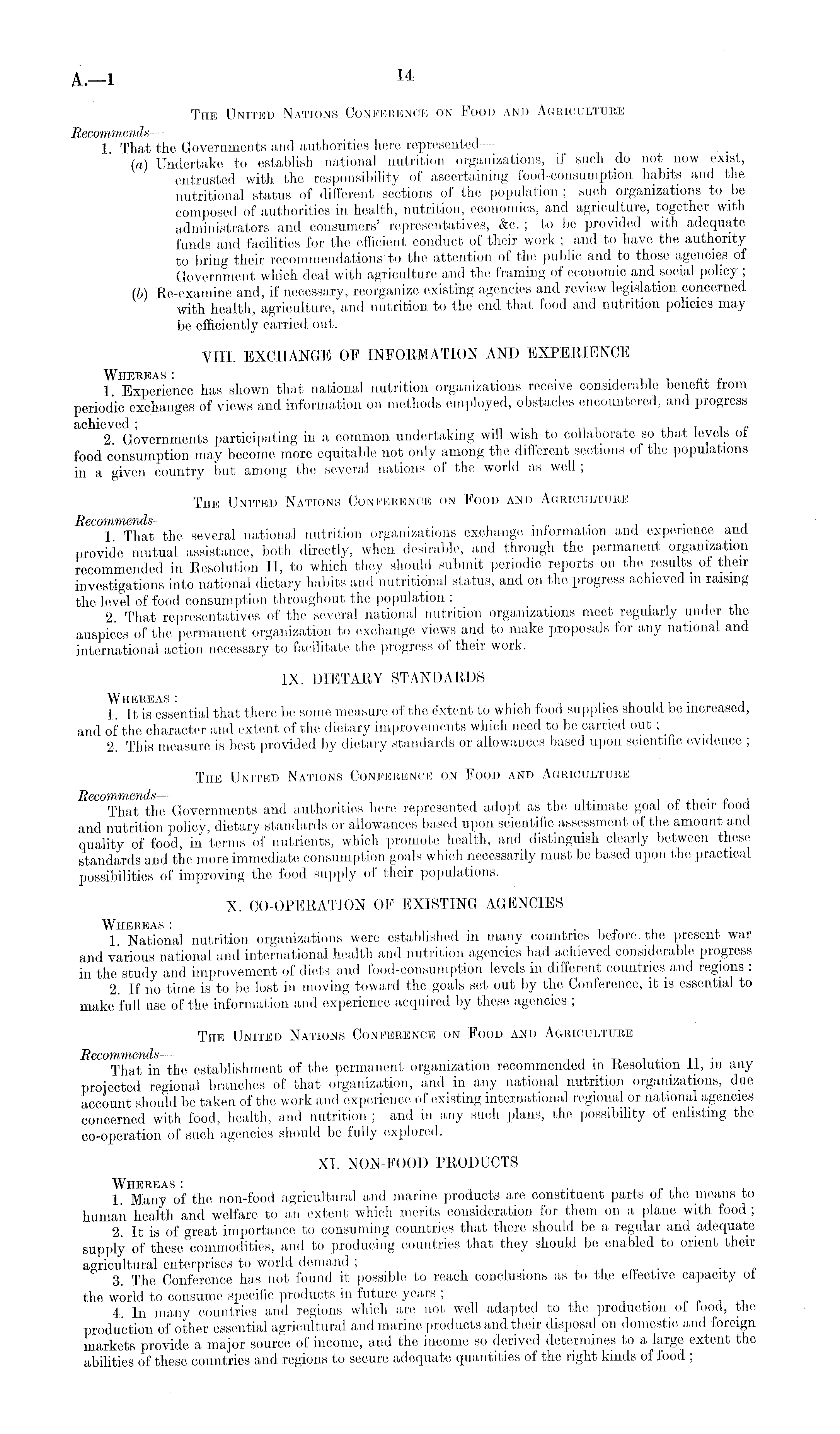 The United Nations Conference on Food and Agriculture 1. That the Governments and authorities here represented— (а) Undertake to establish national nutrition organizations, if such do not now exist, entrusted with the responsibility of ascertaining food-consumption habits and the nutritional status of different sections of the population ; such organizations to be composed of authorities in health, nutrition, economics, and agriculture, together with administrators and consumers' representatives, &c. ; to be provided with adequate funds and facilities for the efficient conduct of their work ; and to have the authority to bring their recommendations to the attention of the public and to those agencies of Government which deal with agriculture and the framing of economic and social policy , (б) Re-examine and, if necessary, reorganize existing agencies and review legislation concerned with health, agriculture, and nutrition to the end that food and nutrition policies may be efficiently carried out. VIII. EXCHANGE OF INFORMATION AND EXPERIENCE Whereas : . . , „ „ 1. Experience has shown that national nutrition organizations receive considerable benefit trom periodic exchanges of views and information on methods employed, obstacles encountered, and progress achieved * 2. Governments participating in a common undertaking will wish to collaborate so that levels of food consumption may become more equitable not only among the different sections of the populations in a given country but among the several nations of the world as well, The United Nations Conference on Food and Agriculture RccovYivYicYids — 1. That the several national nutrition organizations exchange information and experience and provide mutual assistance, both directly, when desirable, and through the permanent organization recommended in Resolution 11, to which they should submit periodic reports on the results of their investigations into national dietary habits and nutritional status, and on the progress achieved m raising the level of food consumption throughout the population ;■ 2. That representatives of the several national nutrition organizations meet regularly under the auspices of the permanent organization to exchange views and to make proposals for any national and international action necessary to facilitate the progress of their work. IX. DIETARY STANDARDS 1. essential that there be some measure of the extent to which food supplies should be increased, and of the character and extent of the dietary improvements which need to be carried out; _ 2. This measure is best provided by dietary standards or allowances based upon scientific evidence ; The United Nations Conference on Food and Agriculture RccoTyi^yicYtds— That the Governments and authorities here represented adopt as the ultimate goal of their food and nutrition policy, dietary standards or allowances based upon scientific assessment of the amount and quality of food, in terms of nutrients, which promote health, and distinguish clearly between these standards and the more immediate consumption goals which necessarily must be based upon the practical possibilities of improving the food supply of their populations. X. CO-OPERATION OF EXISTING AGENCIES Whereas i 1. National nutrition organizations were established in many countries before, the present war and various national and international health and nutrition agencies had achieved considerable progress in the study and improvement of diets and food-consumption levels in different countries and regions : 2. If no time is to be lost in moving toward the goals set out by the Conference, it is essential to make full use of the information and experience acquired by these agencies ; The United Nations Conference on Food and Agriculture That in the establishment of the permanent organization recommended in Resolution 11, in any projected regional branches of that organization, and in any national nutrition organizations, due account should be taken of the work and experience of existing international regional or national agencies concerned with food, health, and nutrition ; and in any such plans, the possibility of enlisting the co-operation of such agencies should be fully explored. XI. NON-FOOD PRODUCTS Whereas : . 1. Many of the non-food agricultural and marine products are constituent parts of the means to human health and welfare to an extent which merits consideration for them on a plane with food ; 2. It is of great importance to consuming countries that there should be a regular and adequate supply of these commodities, and to producing" countries that they should be enabled to orient their agricultural enterprises to world demand ; _ _ 3. The Conference has not found it possible to reach conclusions as to the effective capacity ot the world to consume specific products in future years ; 4. In many countries and regions which are not well adapted to the production of food, the production of other essential agricultural and marine prod ucts and their disposal on domestic and foreign markets provide a major source of income, and the income so derived determines to a large extent the abilities of these countries and regions to secure adequate quantities of the right kinds of food ;