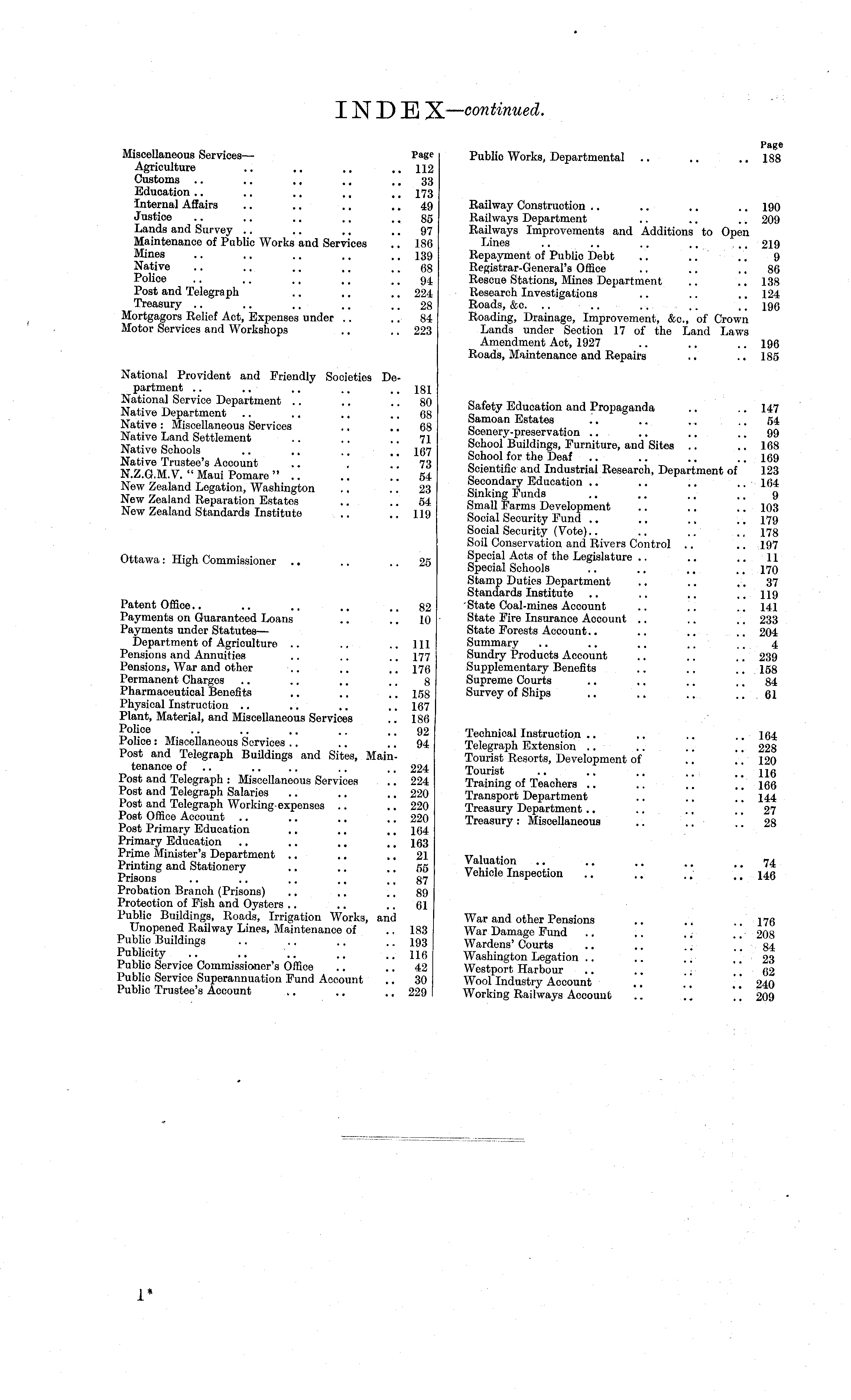 Page Public Works, Departmental .. .. 188 Railway Construction .. .. .. .. 190 Railways Department .. .. .. 209 Railways Improvements and Additions to Open Lines .. .. .. .. .. 219 Repaymont of Publio Debt .. .. .. 9 Registrar-General's Office .. .. .. 86 Rescue Stations, Mines Department .. .. 138 Research Investigations .. .. .. 124 Roads, &c. .. .. .. .. .. ]9Q Roading, Drainage, Improvement, &c., of Crown Lands under Section 17 of the Land Laws Amendment Act, 1927 .. .. .. 196 Roads, Maintenance and Repairs .. .. 185 Safety Education and Propaganda .. .. 147 Samoan Estates .. .. ~ .. 54 Scenery-preservation .. .. .. .. 99 School Buildings, Furniture, and Sites .. .. 168 School for the Deaf .. .. .. .. 169 Scientific and Industrial Research, Department of 123 Secondary Education .. .. .. 164 Sinking Funds .. .. ~ ~ 9 Small Farms Development .. .. .. 103 Social Security Fund ~ .. .. .. 179 Social Security (Vote).. .. .. ~ 178 Soil Conservation and Rivers Control .. .. 197 Special Acts of the Legislature .. .. .. 11 Special Schools .. .. .. .. 170 Stamp Duties Department .. .. .. 37 Standards Institute .. .. ..119 State Coal-mines Account .. .. .. 141 State Fire Insurance Account .. .. .. 233 State Forests Account.. .. .. .. 204 Summary .. .. .. .. ~ 4 Sundry Products Account .. .. .. 239 Supplementary Benefits .. .. .. 158 Supreme Courts .. .. .. .. 84 Survey of Ships .. .. .. .. 61 Technical Instruction .. .. .. .. 164 Telegraph Extension .. .. .. .. 228 Tourist Resorts, Development of .. .. 120 Tourist .. .. .. ..116 Training of Teachers .. .. .. .. 106 Transport Department .. .. .. 144 Treasury Department .. .. .. 27 Treasury: Miscellaneous .. .. 28 Valuation .. .. .. .. 74 Vehicle Inspection .. .. ~ .. 146 War and other Pensions .. ~ ~ 170 War Damage Fund .. ~ .. .. 208 Wardens' Courts .. .. .. .. 84 Washington Legation .. .. ~ .. 23 Westport Harbour .. .. .. .. 62 Wool Industry Account .. .. .. 240 Working Railways Account .. ~ .. 209