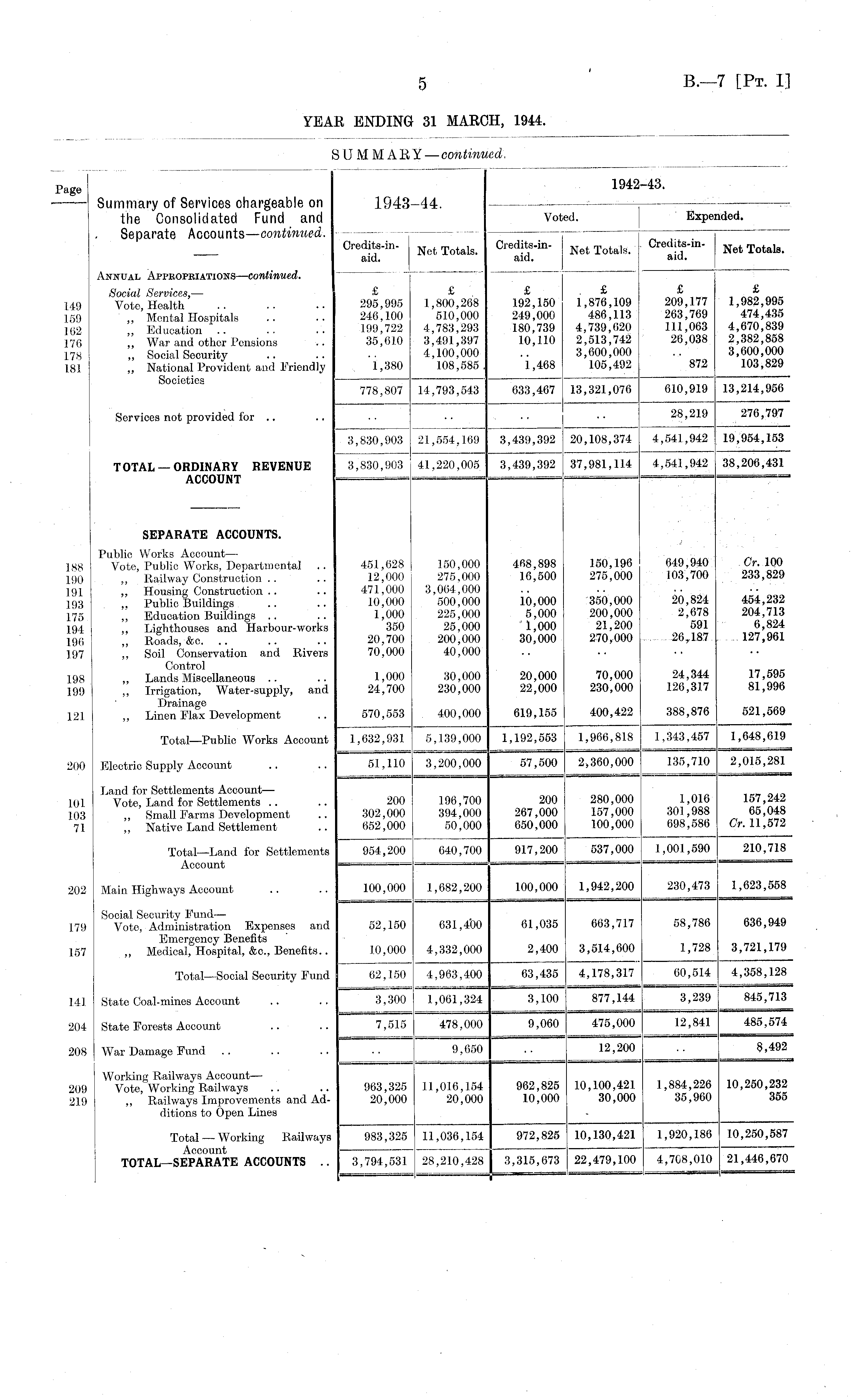 Page 1942-43. Summary of Services chargeable on 1943-44. the Consolidated Fund and Voted. Expended. Separate Accounts —continued. 0re aid" in " NefcTotals - Cre aid" in ' NetTotals - aid."" 1 ' Net Totals - Annual Appropbiations—continued. ~~ Social Services, —- £ £ £ . & . 149 Vote Health .. .. .. 295,995 1,800,268 192,150 1,876,109 209,177 1,982,995 159 „ 'Mental Hospitals .. .. 246,100 510,000 249,000 486,113 263,769 474,435 162 Education . .. .. 199,722 4,783,293 180,739 4,739,620 111,063 4,670,839 176 " War and other Pensions .. 35,610 3,491,397 10,110 2,513,742 26,038 2,382,858 178 „ Social Security 4,100,000 .. 3,600,000 .. 3,600,000 181 ,, National Provident and Friendly 1,380 108,585. 1,468 105,492 872 103,829 Societies * 778,807 14,793,543 633,467 13,321,076 610,919 13,214,956 Services not provided for .. .. .. •• •• 28,219 276,797 3,830,903 21,654,169 3,439,392 20,108,374 4,541,942 19,954,153 TOTAL — ORDINARY REVENUE 3,830,903 41,220,005 3,439,392 37,981,114 4,541,942 38,206,431 ACCOUNT — =^==1 SEPARATE ACCOUNTS. Public Works Account— ■ 1S8 Vote, Public Works, Departmental .. 451,628 150,000 468,898 150,196 649,940 Cr. 100 190 ,, Railway Construction .. .. 12,000 275,000 16,500 275,000 103,700 233,829 191 „ Housing Construction .. .. 471,000 3,064,000 .. •• 193 . Public Buildings .. .. 10,000 500,000 10,000 350,000 20,824 454,232 175 ,, Education Buildings .. .. 1,000 225,000 5,000 200,000 2,678 204,713 194 Lighthouses and Harbour-works 350 25,000 1,000 21,200 591 6,824 196 „ Roads, &c. .. .. .. 20,700 200,000 30,000 270,000 26,187 127,961 197 ,, Soil Conservation and Rivers 70,000 40,000 Control , _ 198 „ Lands Miscellaneous .. .. 1,000 30,000 20,000 70,000 24,344 17,595 199 ,, Irrigation, Water-supply, and 24,700 230,000 22,000 230,000 126,317 81,996 121 ,, Linen Max Development .. 570,553 400,000 619,155 400,422 388,876 521,569 Total —Public Works Account 1,632,931 5,139,000 1,192,553 1,966,818 1,343,457 1,648,619 200 Electric Supply Account .. 51,110 3,200,000 57,500 2,360,000 135,710 2,015,281 Land for Settlements Account — 101 Vote, Land for Settlements .. .. 200 196,700 200 280,000 1,016 157,242 103 Small Farms Development .. 302,000 394,000 267,000 157,000 301,988 65,048 71 ,, Native Land Settlement .. 652,000 50,000 650,000 100,000 698,586 Cr. 11,572 Total —Land for Settlements 954,200 640,700 917,200 537,000 1,001,590 210,718 Account — — 1 — 202 Main Highways Account .. .. 100,000 1,682,200 100,000 1,942,200 230,473 1,623,558 179 Vote, Administration Expenses and 52,150 63] ,4'00 61,035 663,717 58,786 636,949 Emergency Benefits 157 ,, Medical, Hospital, &c., Benefits.. 10,000 4,332,000 2,400 3,514,600 1,728 3,721,179 Total —Social Security Fund 62,150 4,963,400 63,435 4,178,317 60,514 4,358,128 141 State Coal-mines Account .. .. 3,300 1,061,324 3,100 877,144 3,239 845,713 204 State Forests Account .. .. 7,515 478,000 9,060 475,000 12,841 485,574 208 War Damage Fund .. .. .. .. 9,650 .. 12,200 .. 8,492 Working Railways Account— „ 209 Vote, Working Railways .. .. 963,325 11,016,154 962,825 10,100,421 1,884,226 10,250,232 219 ,, Railways Improvements and Ad- 20,000 20,000 10,000 30,000 35,960 355 ditions to Open Lines Total — Working Railways 983,325 11,036,154 972,825 10,130,421 1,920,186 10,250,587 Account —— TOTAL—SEPARATE ACCOUNTS .. 3,794,531 28,210,428 3,315,673 22,479,100 4,708,010 21,446,670 ~ 1"" ==S=