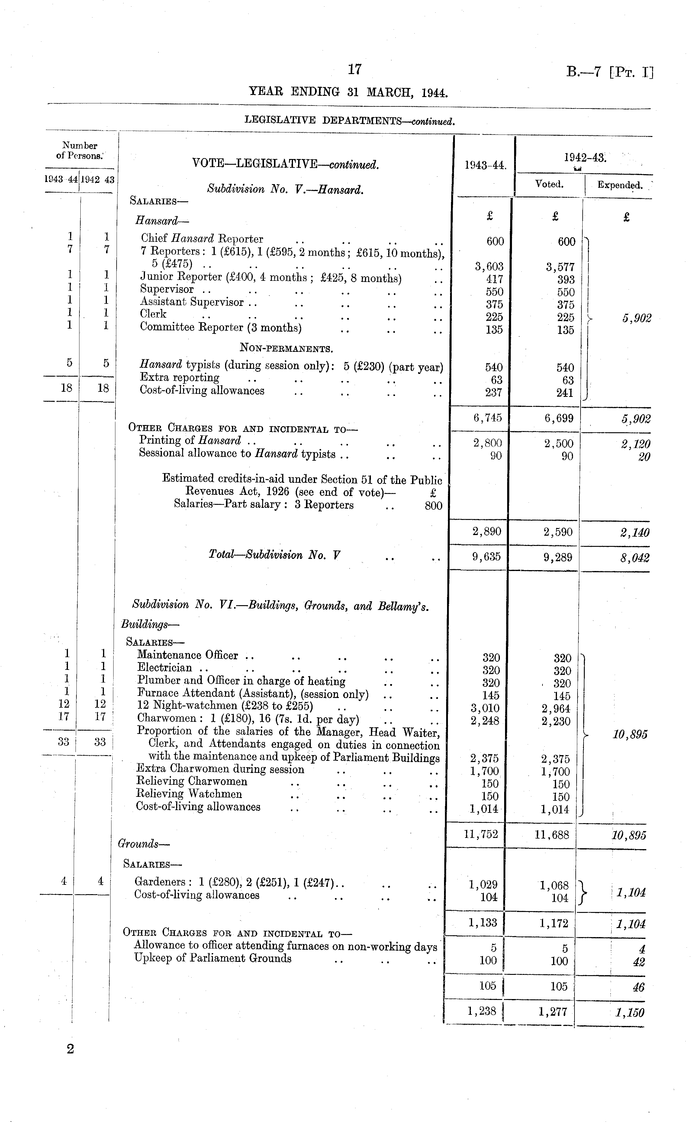 Num ber oflWns; VOTE—LEGISLATIVE—continued. 1943-44. 19 * 2 ~ 43 ' 1943 44] 1942 43 Subdivision No. V,—Hansard. Voted " | Ex P eilded - Salaries— " ~ Hansard— £ £ £ Chief Hansard Reporter .. .. .. .. 000 600 " 7 7 7 Reporters: 1 (£615), 1 (£595, 2 months; £615,10 months), 5 (£475) .. .. .. .. .. .. 3,603 3,577 1 Junior Reporter (£400, 4 months; £425,8 months) .. 417 393 Supervisor .. .. .. .. .. .. 550 550 Assistant Supervisor .. .. .. .. ., 375 375 £ lerk 225 225 [> 5,902 1 J- Committee Reporter (3 months) .. .. .. 135 135 Non-perm anents. 5 5 Hansard typists (during session only): 5 (£230) (part year) 540 540 Extra reporting .. .. .. .. _. 63 03 18 18 Cost-of-living allowances .. .. .. .. 237 241 6,745 6,699 5,902 Other Charges for and incidental to — Printing of Hansard .. .. .. .. .. 2,800 2,500 2,120 Sessional allowance to Hansard typists .. .. .. 90 90 20 Estimated credits-in-aid under Section 51 of the Public Revenues Act, 1926 (see end of vote)— £ Salaries —Part salary : 3 Reporters .. 800 2,890 2,590 2,140 Total—Subdivision No. V .. .. 9,635 9,289 8,042 Subdivision No. VI.—Buildings, Grounds, and Bellamy's. J Buildings— Salaries— 1 1 Maintenance Officer .. .. .. .. .. 320 320 "" 1 1 | Electrician .. .. .. .. ., .. 320 320 Plumber and Officer in charge of heating .. .. 320 , 320 1 I | Eurnace Attendant (Assistant), (session only) .. .. 145 145 12 12 12 Night-watchmen (£238 to £255) .. .. .. 3,010 2,964 17 17 Charwomen: 1 (£180), 16 (7s. Id. per day) .. .. 2,'248 2^230 _| Proportion of the salaries of the Manager, Head Waiter, ' y 10,895 33 | 33 | Clerk, and Attendants engaged on duties in connection "—r . with the maintenance and upkeep of Parliament Buildings 2,375 2,375 Extra Charwomen during session .. .. .. l ; 700 1 [ 700 Relieving Charwomen .. .. .. .. 150 150 Relieving Watchmen .. .. .. .. 150 150 Cost-of-living allowances .. .. .. .. 1,014 1,014 11,752 11,688 10,895 j wounds — j Salaries— 4 4 Gardeners: 1 (£280), 2 (£251), 1 (£247).. .. .. 1,029 1 068 1 Cost-of-living allowances .. .. .. .. 104 'l04 j 1,104 _ 1,133 1,172 1,104 Other Charges for and incidental to — ! Allowance to officer attending furnaces on non-working days 5 J 5 '4 Upkeep of Parliament Grounds .. .. .. 100 100 42 105 j 105 46 1,238 j 1,277 1,150 2