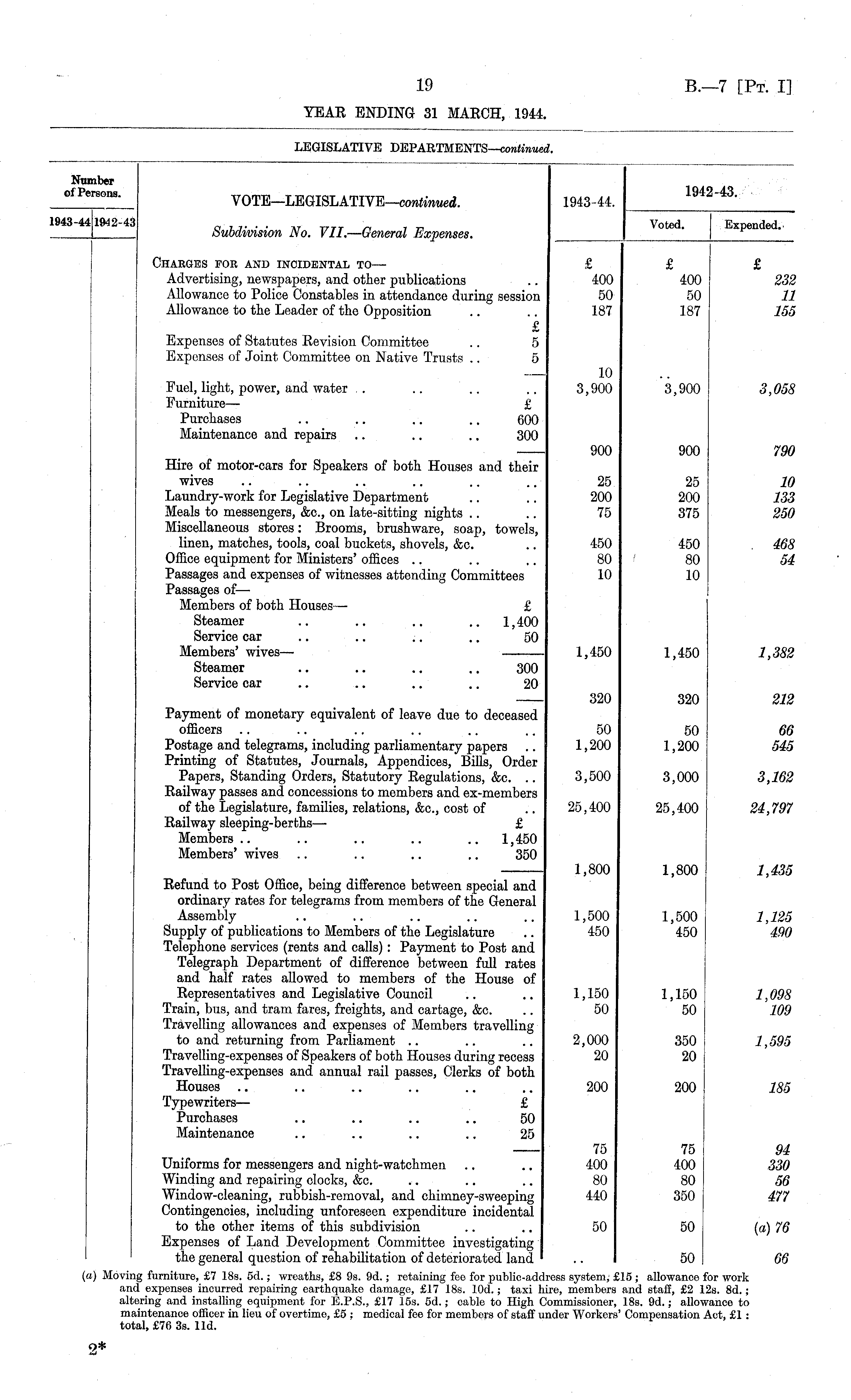 Number ofPersonB - VOTE—LEGISLATIVE—continued. 1943-44. 1942-43. 1943-441942-43 Subdivision No. VII.-General Expenses. Voted. | Expended. Charges for and incidental to — £ £ £ Advertising, newspapers, and other publications .. 400 400 232 Allowance to Police Constables in attendance during session 50 50 11 Allowance to the Leader of the Opposition .. .. 187 187 155 £ Expenses of Statutes Revision Committee .. 5 Expenses of Joint Committee on Native Trusts .. 5 — 10 Fuel, light, power, and water .. .. .. .. 3,900 3,900 3,058 Furniture— £ Purchases .. .. .. .. 600 Maintenance and repairs .. .. .. 300 900 900 790 Hire of motor-cars for Speakers of both Houses and their wives .. .. .. .. .. .. 25 25 10 Laundry-work for Legislative Department .. .. 200 200 133 Meals to messengers, &c., on late-sitting nights .. .. 75 375 250 Miscellaneous stores: Brooms, brushware, soap, towels, linen, matches, tools, coal buckets, shovels, &c. .. 450 450 468 Office equipment for Ministers' offices .. .. .. 80 80 54 Passages and expenses of witnesses attending Committees 10 10 Passages of— Members of both Houses— £ Steamer .. .. .. .. 1,400 Service car .. .. .. .. 50 Members' wives— 1,450 1,450 1,382 Steamer .. .. .. .. 300 Service car .. .. .. .. 20 320 320 212 Payment of monetary equivalent of leave due to deceased officers .. .. .. .. .. .. 50 50 66 Postage and telegrams, including parliamentary papers .. 1,200 1,200 545 Printing of Statutes, Journals, Appendices, Bills, Order Papers, Standing Orders, Statutory Regulations, &c. .. 3,500 3,000 3,162 Railway passes and concessions to members and ex-members of the Legislature, families, relations, &c., cost of .. 25,400 25,400 24,797 Railway sleeping-berths— £ Members .. .. .. .. .. 1,450 Members' wives .. .. .. .. 350 1,800 1,800 1,435 Refund to Post Office, being difference between special and ordinary rates for telegrams from members of the General Assembly .. .. .. .. .. 1,500 1,500 1,125 Supply of publications to Members of the Legislature .. 450 4-50 490 Telephone services (rents and calls): Payment to Post and Telegraph Department of difference between full rates and half rates allowed to members of the House of Representatives and Legislative Council .. .. 1,150 1,150 1,098 Train, bus, and tram fares, freights, and cartage, &c. .. 50 50 109 Travelling allowances and expenses of Members travelling to and returning from Parliament .. .. .. 2,000 350 1,595 Travelling-expenses of Speakers of both Houses during recess 20 20 Travelling-expenses and annual rail passes, Clerks of both Houses .. .. .. .. .. .. 200 200 185 Typewriters— £ Purchases .. .. .. .. 50 Maintenance .. .. .. .. 25 75 75 94 Uniforms for messengers and night-watchmen .. .. 400 400 330 Winding and repairing clocks, &c. .. .. .. 80 80 56 Window-cleaning, rubbish-removal, and chimney-sweeping 440 350 477 Contingencies, including unforeseen expenditure incidental to the other items of this subdivision .. .. 50 50 (a) 76 Expenses of Land Development Committee investigating ' the general question of rehabilitation of deteriorated land .. 50 66