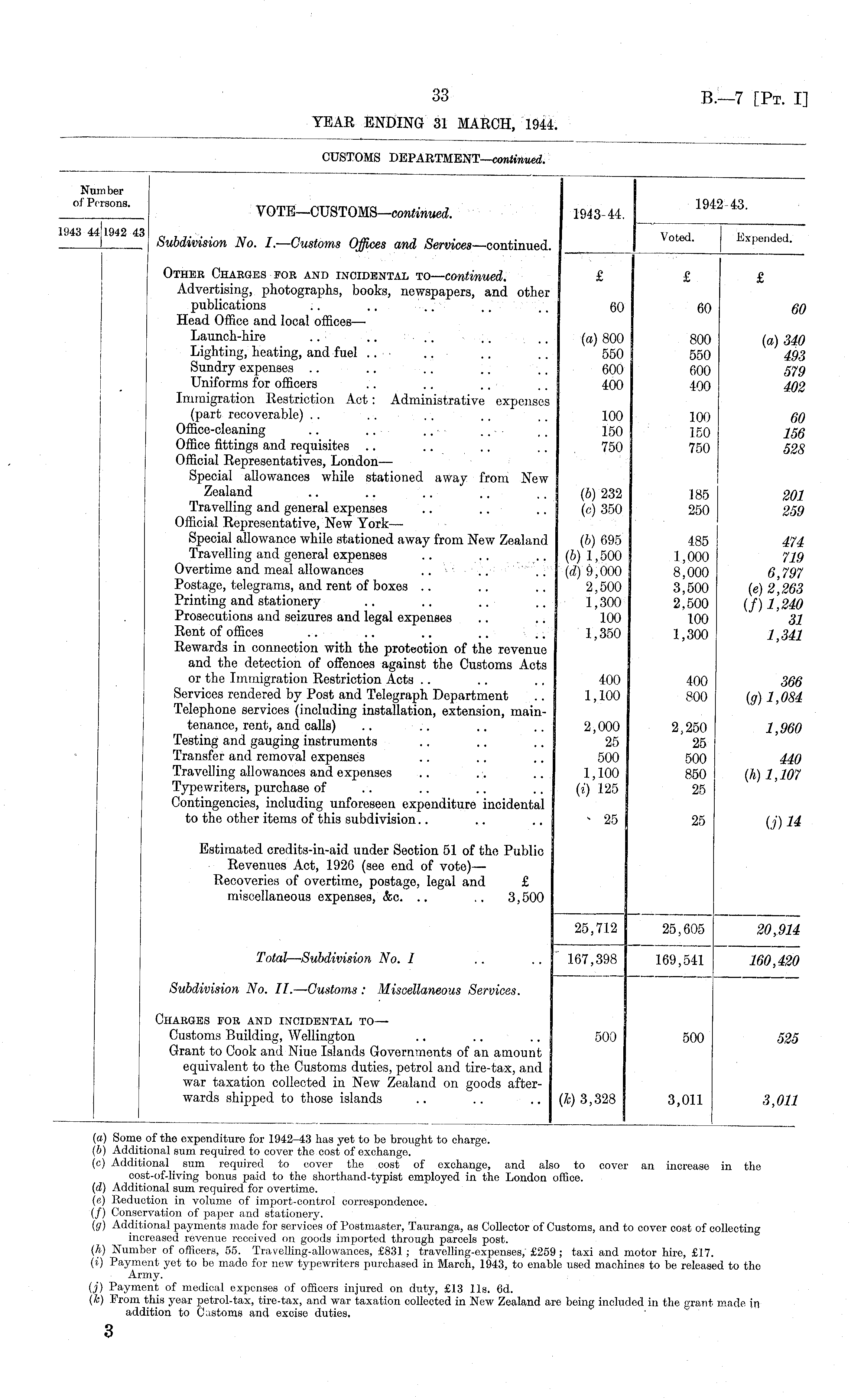 (a) Some of the expenditure for 1942-43 has yet to be brought to charge. (b) Additional sum required to cover the cost of exchange. (c) Additional sum required to cover the cost of exchange, and also to cover an increase in the cost-of-living bonus paid to the shorthand-typist employed in the London office. (d) Additional sum required for overtime. (e) Reduction in volume of import-control correspondence. (/) Conservation of paper and stationery. (g) Additional payments made for services of Postmaster, Tauranga, as Collector of Customs, and to cover cost of collecting increased revenue received on goods imported through parcels post. (h) Number of officers, 55. Travelling-allowances, £831 ; travelling-expenses, £259; taxi and motor hire, £17. (i) Payment yet to be made for new typewriters purchased in March, 1943, to enable used machines to be released to the Army. (j) Payment of medical expenses of officers injured on duty, £13 lis. 6d. (k) Prom this year petrol-tax, tire-tax, and war taxation collected in New Zealand are being included in the grant made in addition to Castoms and exoise duties,