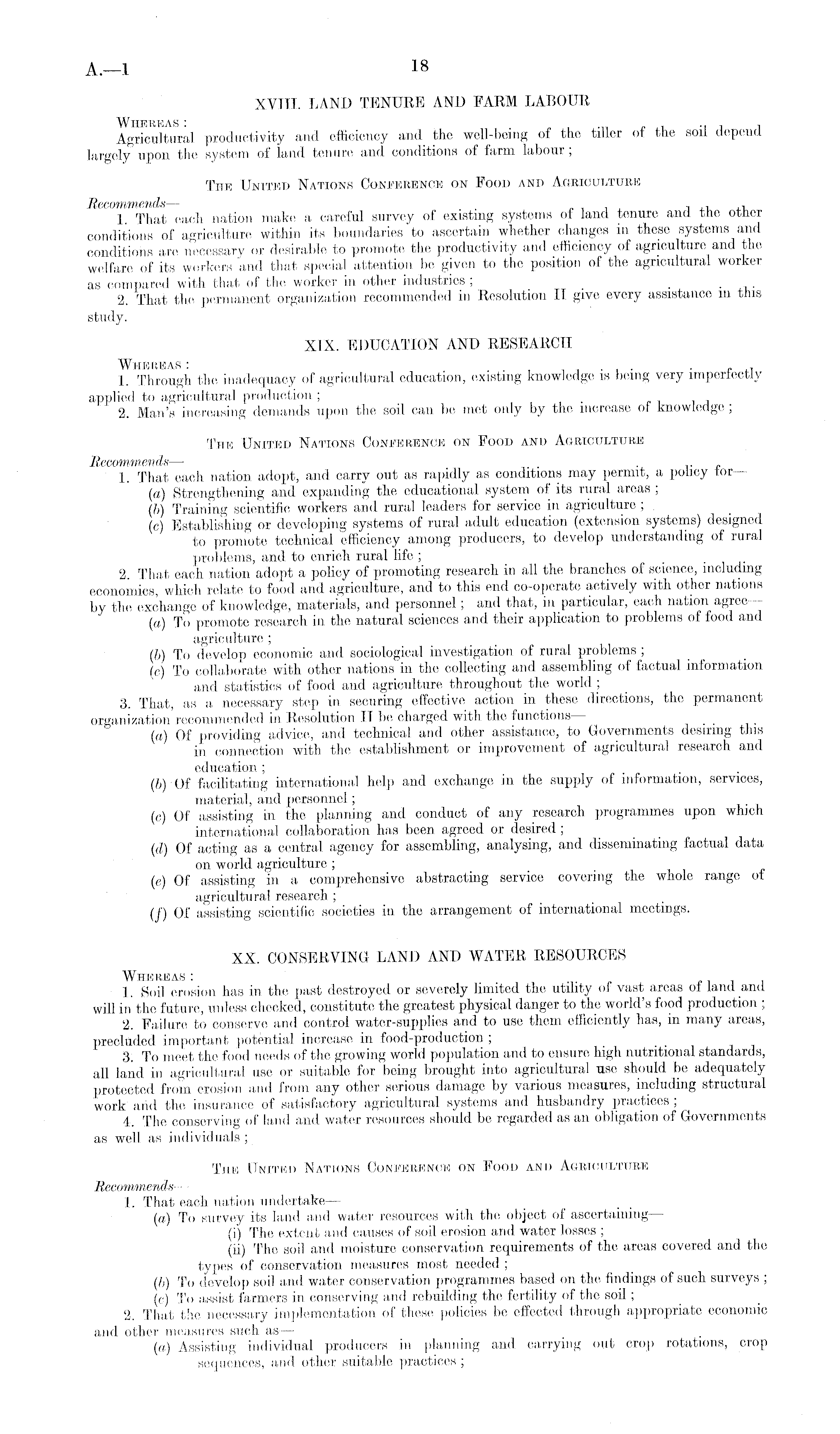 XVIII. LAND TENURE AND FARM LABOUR Whereas * Agricultural productivity and efficiency and the well-being of the tiller of the soil depend largely upon the system of land tenure and conditions of farm labour ; The United Nations Conference on Food and Agriculture RcCOTTITYICTId/S — 1. That each nation make a careful survey of existing systems of land tenure and the other conditions of agriculture within its boundaries to ascertain whether changes in these systems and conditions are necessary or desirable to promote the productivity and efficiency of agriculture and the welfare of its workers and that special attention be given to the position of the agricultural worker as compared with that of the worker in other industries; _ . , 2. That the permanent organization recommended in Resolution. II give every assistance m this study. XIX. EDUCATION AND RESEARCH Whereas : , ~ 1. Through the inadequacy of agricultural education, existing knowledge is being very imperfectly applied to agricultural production ; 2. Man's increasing demands upon the soil can be met only by the increase of knowledge ; The United Nations Conference on Food and Agriculture jHcCOTYIVYICTIds—■ 1. That each nation adopt, and carry out as rapidly as conditions may permit, a policy for—(a) Strengthening and expanding the educational system of its rural areas ; (b) Training scientific workers and rural leaders for service in agriculture ; . (c) Establishing or developing systems of rural adult education (extension systems) designed to promote technical efficiency among producers, to develop understanding of rural problems, and to enrich rural life ; 2. That each nation adopt a policy of promoting research in all the branches of science, including economics, which relate to food and agriculture, and to this end co-operate actively with other nations by the exchange of knowledge, materials, and personnel; and that, in particular, each nation agree— (a) To promote research in the natural sciences and their application to problems of food and agriculture ; (b) To develop economic and sociological investigation of rural problems ; (c) To collaborate with other nations in the collecting and assembling of factual information and statistics of food and agriculture throughout the world ; 3. That, as a necessary step in securing effective action in these directions, the permanent organization recommended in Resolution II be charged with the functions , . (a) Of providing advice, and technical and other assistance, to Governments desiring this in connection with the establishment or improvement of agricultural research and education; ... (b) Of facilitating international help and exchange in the supply of information, services, material and personnel j (c) Of assisting in the planning and conduct of any research programmes upon which international collaboration has been agreed or desired; (d) Of acting as a central agency for assembling, analysing, and disseminating factual data on world agriculture ; (e) Of assisting in a comprehensive abstracting service covering the whole range of agricultural research ; (/) Of assisting scientific societies in the arrangement of international meetings. XX. CONSERVING LAND AND WATER RESOURCES Whereas i 1. Soil erosion has in the past destroyed or severely limited the utility of vast areas of land and will in the future, unless checked, constitute the greatest physical danger to the world's food production ; 2." Failure to conserve and control water-supplies and to use them efficiently has, in many areas, precluded important potential increase in food-production ; 3. To meet the food needs of the growing world population and to ensure high nutritional standards, all land in agricultural use or suitable for being brought into agricultural use should be adequately protected from erosion and from any other serious damage by various measures, including structural work and the insurance of satisfactory agricultural systems and husbandry practices ; 4. The conserving of land and water resources should be regarded as an obligation of Governments as well as individuals ; The United Nations Conference on Food and Agriculture Recommends — 1. That each nation undertake— _■ , (а) To survey its land and water resources with the object of ascertaining — (i) The extent and causes of soil erosion and water losses ; (ii) The soil and moisture conservation requirements of the areas covered and the types of conservation measures most needed ; (б) To develop soil and water conservation programmes based on the findings of such surveys ; (c) To assist farmers in conserving and rebuilding the fertility of the soil; 2. That the necessary implementation of these policies be effected through appropriate economic and other measures such as — (a) Assisting individual producers in planning and carrying out crop rotations, crop sequences, and other suitable practices ;