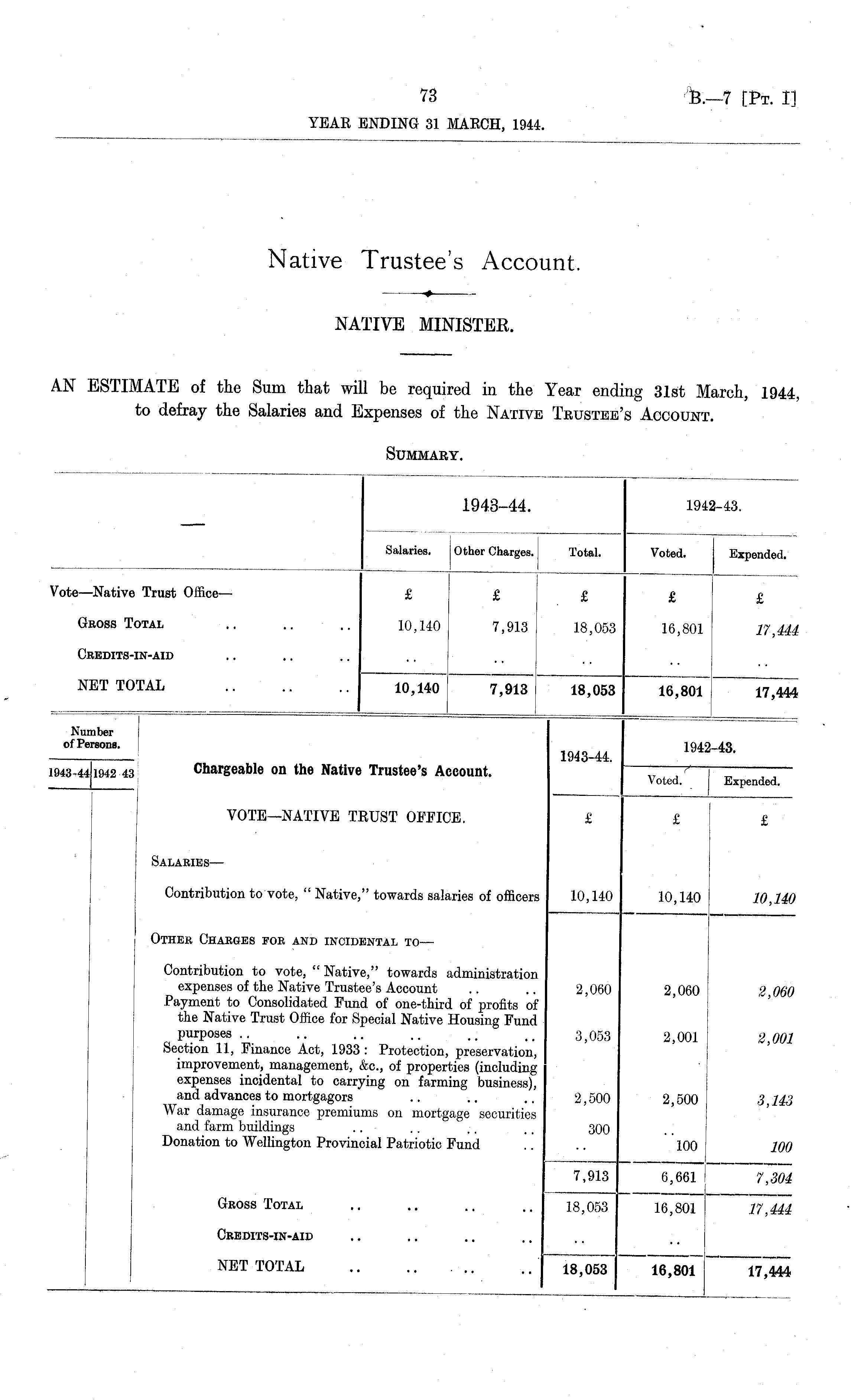 AN ESTIMATE of the Sum that will be required in the Year ending 31st March, 1944, to defray the Salaries and Expenses of the Native Trustee's Account. Summary.