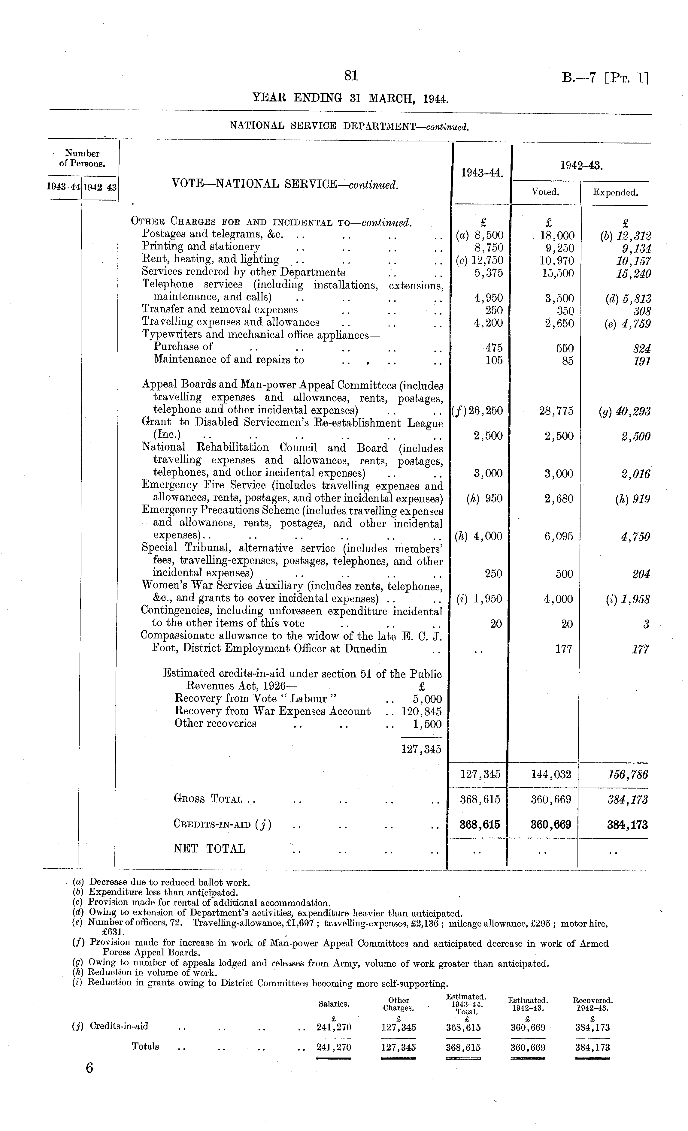 Number of Persons. 1942-43 - 1943-44. 1943 44194243 VOTE—NATIONAL SERVICE—continued. Voted. lixpended. Other Charges for and incidental to—continued. £ £ £ Postages and telegrams, &c. .. .. .. .. (a) 8,500 18,000 (b) 12,312 Printing and stationery .. .. .. .. 8,750 9,250 9,134 Rent, heating, and lighting .. .. .. .. (c) 12,750 10,970 10,157 Services rendered by other Departments . . .. 5,375 15,500 15,240 Telephone services (including installations, extensions, maintenance, and calls) .. .. .. .. 4,950 3,500 (d) 5,813 Transfer and removal expenses .. .. .. 250 350 308 Travelling expenses and allowances .. .. .. 4,200 2,650 (e) 4,759 Typewriters and mechanical office appliances— Purchase of .. .. .. .. .. 475 550 824 Maintenance of and repairs to ..... .. 105 85 191 Appeal Boards and Man-power Appeal Committees (includes travelling expenses and allowances, rents, postages, telephone and other incidental expenses) .. .. (/)26,250 28,775 (g) 40,293 Grant to Disabled Servicemen's Re-establishment League (Inc.) .. .. .. .. .. .. 2,500 2,500 2,500 National Rehabilitation Council and Board (includes travelling expenses and allowances, rents, postages, telephones, and other incidental expenses) .. .. 3,000 3,000 2,016 Emergency Fire Service (includes travelling expenses and allowances, rents, postages, and other incidental expenses) (h) 950 2,680 (h) 919 Emergency Precautions Scheme (includes travelling expenses and allowances, rents, postages, and other incidental expenses).. .. .. .. .. .. (h) 4,000 6,095 4,750 Special Tribunal, alternative service (includes members' fees, travelling-expenses, postages, telephones, and other incidental expenses) .. .. .. .. 250 500 204 Women's War Service Auxiliary (includes rents, telephones, &c., and grants to cover incidental expenses) .. .. (i) 1,950 4,000 (i) 1,958 Contingencies, including unforeseen expenditure incidental to the other items of this vote .. .. .. 20 20 3 Compassionate allowance to the widow of the late E. C. J. Foot, District Employment Officer at Dunedin .. .. 177 177 Estimated credits-in-aid under section 51 of the Public Revenues Act, 1926 — £ Recovery from Vote " Labour " .. 5,000 Recovery from. War Expenses Account .. 120,845 Other recoveries .. .. .. 1,500 127,345 127,345 144,032 156,786 Gross Total.. .. .. .. .. 368,615 360,669 384,173 Credits-in-aid (j) 368,615 360,669 384,173 NET TOTAL j