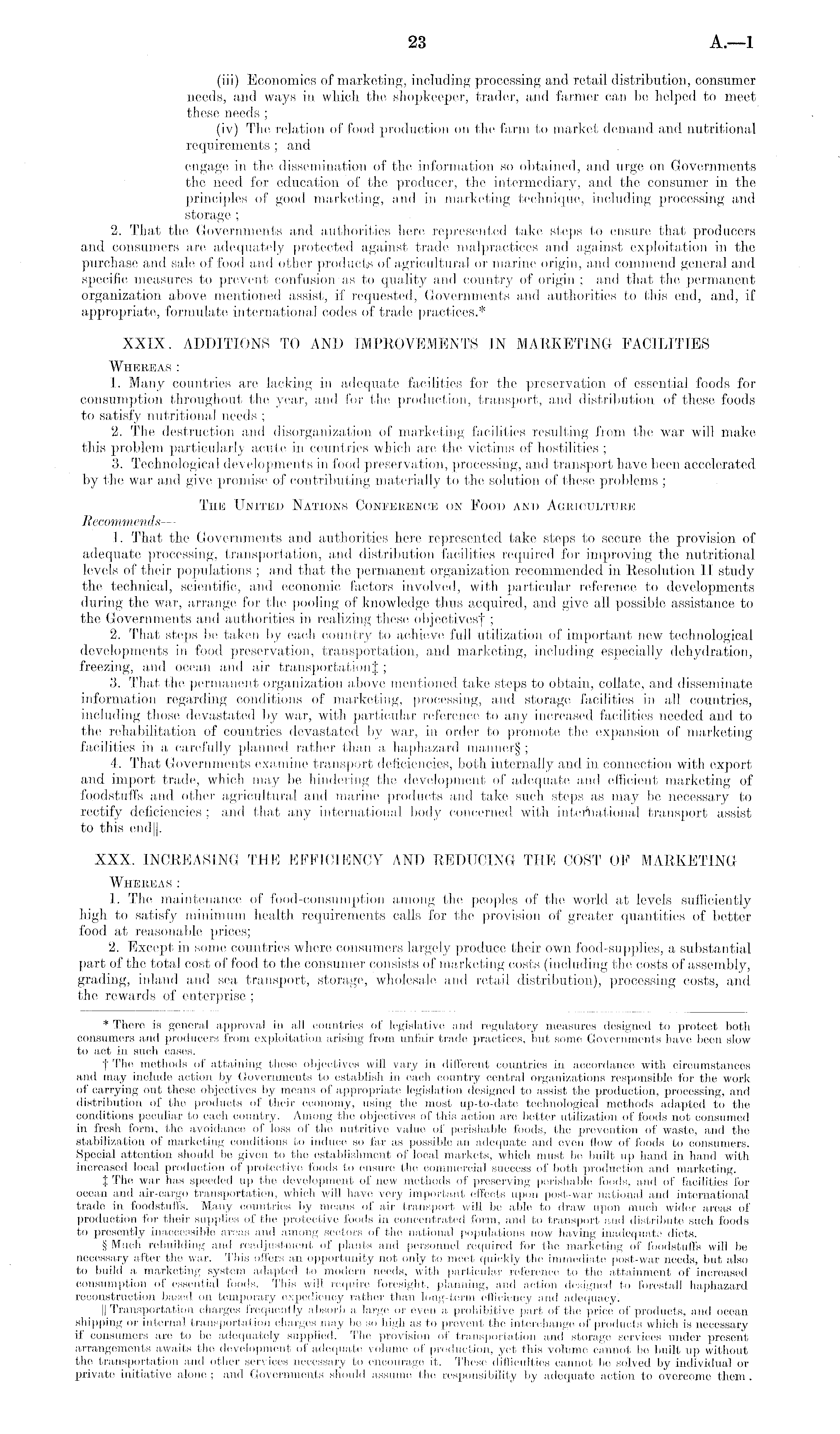 (iii) Economics of marketing, including processing and retail distribution, consumer needs, and ways in which the shopkeeper, trader, and farmer can be helped to meet these needs ; (iv) The relation of food production on the farm to market demand and nutritional requirements ; and engage in the dissemination of the information so obtained, and urge on Governments the need for education of the producer, the intermediary, and the consumer in the principles of good marketing, and in marketing technique, including processing and storage ; 2. That the Governments and authorities here represented take steps to ensure that producers and consumers are adequately protected against trade malpractices and against exploitation in the purchase and sale of food and other products of agricultural or marine origin, and commend general and specific measures to prevent confusion as to quality and country of origin ; and that the permanent organization above mentioned assist, if requested, Governments and authorities to this end, and, if appropriate, formulate international codes of trade practices.* XXIX. ADDITIONS TO AND IMPROVEMENTS IN MARKETING FACILITIES Whereas : 1. Many countries are lacking in adequate facilities for the preservation of essential foods for consumption throughout the year, and for the production, transport, and distribution of these foods to satisfy nutritional needs ; 2. The destruction and disorganization of marketing facilities resulting from the war will make this problem particularly acute in countries which are the victims of hostilities ; 3. Technological developments in food preservation, processing, and transport have been accelerated by the war and give promise of contributing materially to the solution of these problems ; The United Nations Conference on Food and Agriculture Recommends — 1. That the Governments and authorities here represented take steps to secure the provision of adequate processing, transportation, and distribution facilities required for improving the nutritional levels of their populations ; and that the permanent organization recommended in Resolution II study the technical, scientific, and economic factors involved, with particular reference to developments during the war, arrange for the pooling of knowledge thus acquired, and give all possible assistance to the Governments and authorities in realizing these objectives! ; 2. That steps be taken by each country to achieve full utilization of important new technological developments in food preservation, transportation, and marketing, including -especially dehydration, freezing, and ocean and air transportation J ; 3. That the permanent organization above mentioned take steps to obtain, collate, and disseminate information regarding conditions of marketing, processing, and storage facilities in all countries, including those devastated by war, with particular reference to any increased facilities needed and to the rehabilitation of countries devastated by war, in order to promote the expansion of marketing facilities in a carefully planned rather than a haphazard manner§; 4. That Governments examine transport deficiencies, both internally and in connection with export and import trade, which may be hindering the development of adequate and efficient marketing of foodstuffs and other agricultural and marine products and take such steps as may be necessary to rectify deficiencies ; and that any international body concerned with international transport assist to this endjf, XXX. INCREASING THE EFFICIENCY AND REDUCING THE COST OF MARKETING Whereas : 1. The maintenance of food-consumption among the peoples of the world at levels sufficiently high to satisfy minimum health requirements calls for the provision of greater quantities of better food at reasonable prices; 2. Except in some countries where consumers largely produce their own food-supplies, a substantial part of the total cost of food to the consumer consists of marketing costs (including the costs of assembly, grading, inland and sea transport, storage, wholesale and retail distribution), processing costs, and the rewards of enterprise ;