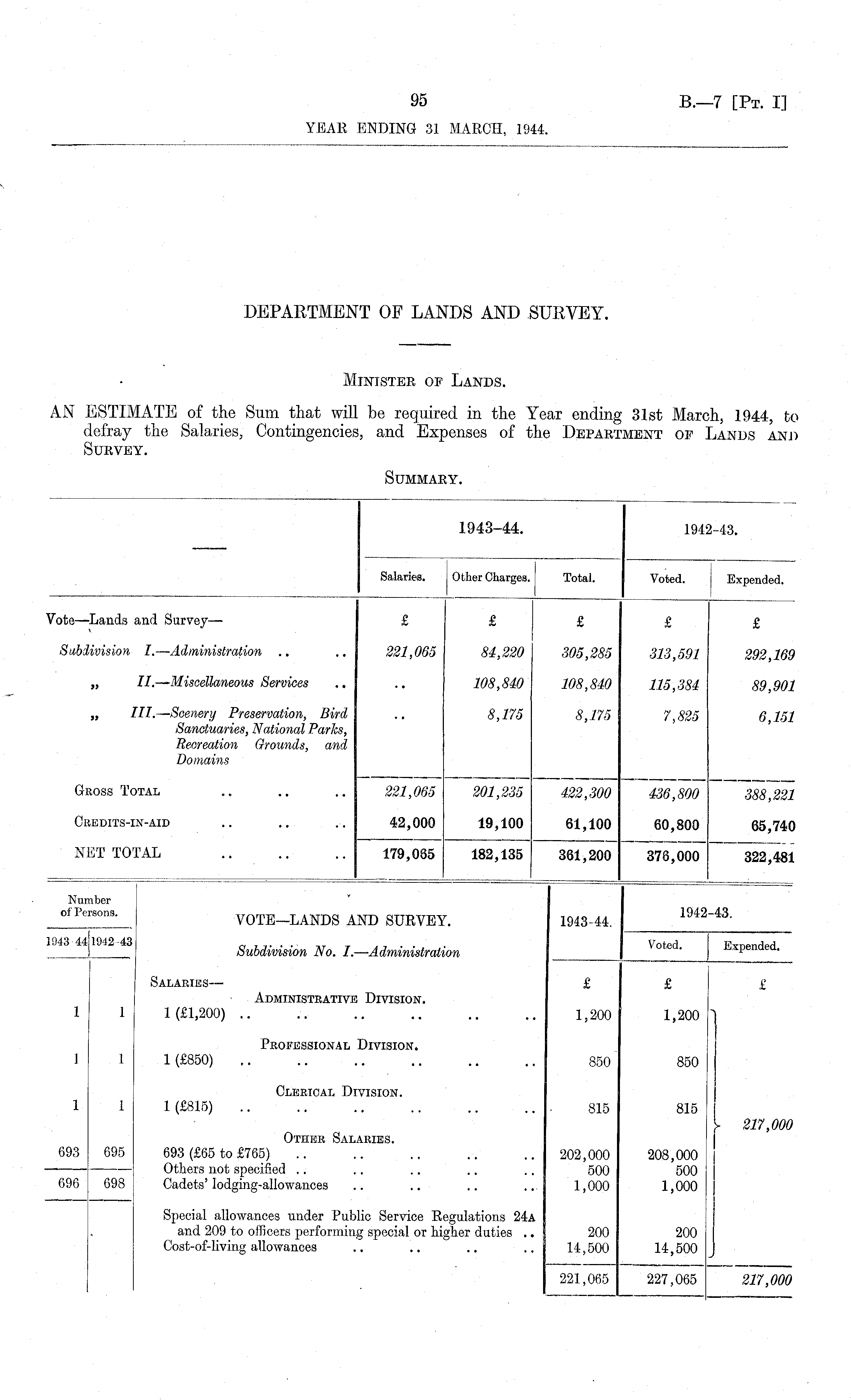 Minister of Lands. AN ESTIMATE of the Sum that will be required in the Year ending 31st March, 1944, to defray the Salaries, Contingencies, and Expenses of the Department of Lands and Survey. Summary.