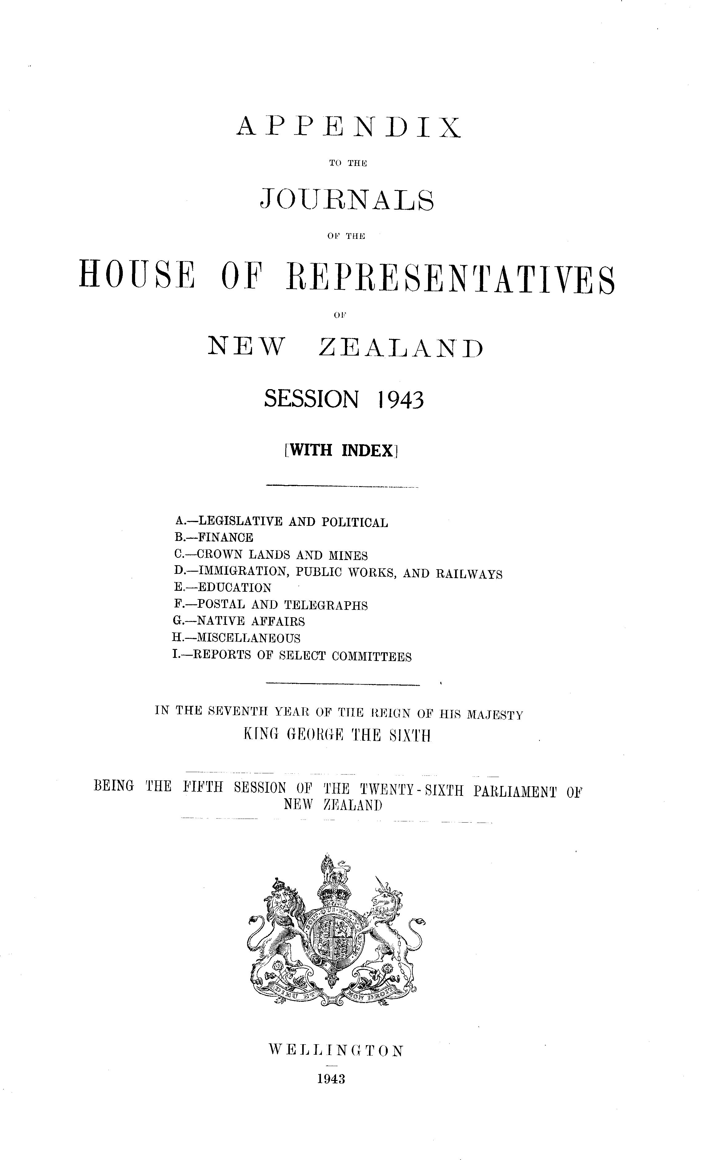 APPENDIX TO THE JOURNALS OF THE HOUSE OF REPRESENTATIVES OF NEW ZEALAND SESSION 1943 [WITH INDEX]