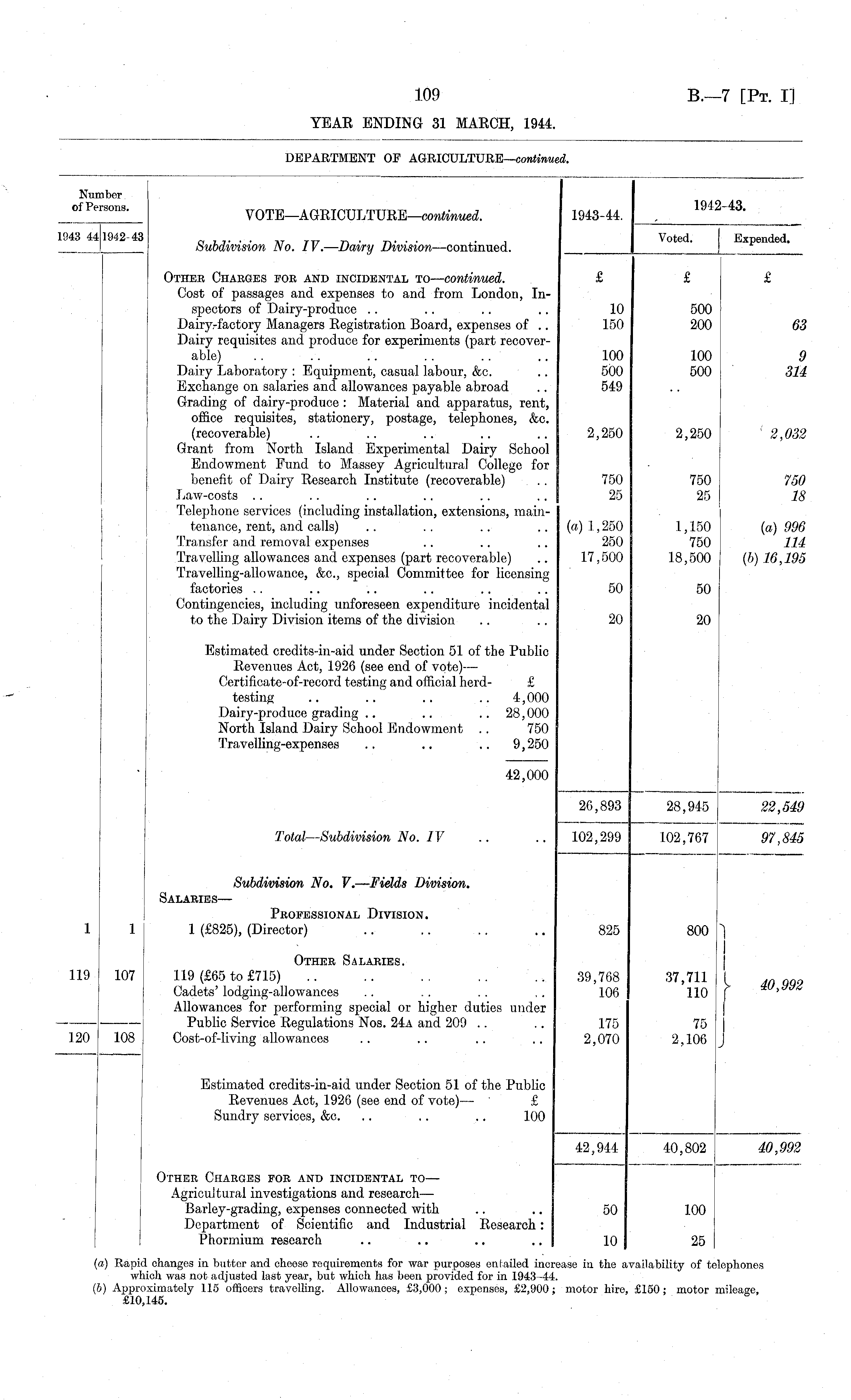 (a) Rapid changes in butter and cheese requirements for war purposes entailed increase in the availability of telephones which was not adjusted last year, but which has been provided for in 1943-44. (b) Approximately 115 officers travelling. Allowances, £3,000; expenses, £2,900; motor hire, £150; motor mileage, £10,145.