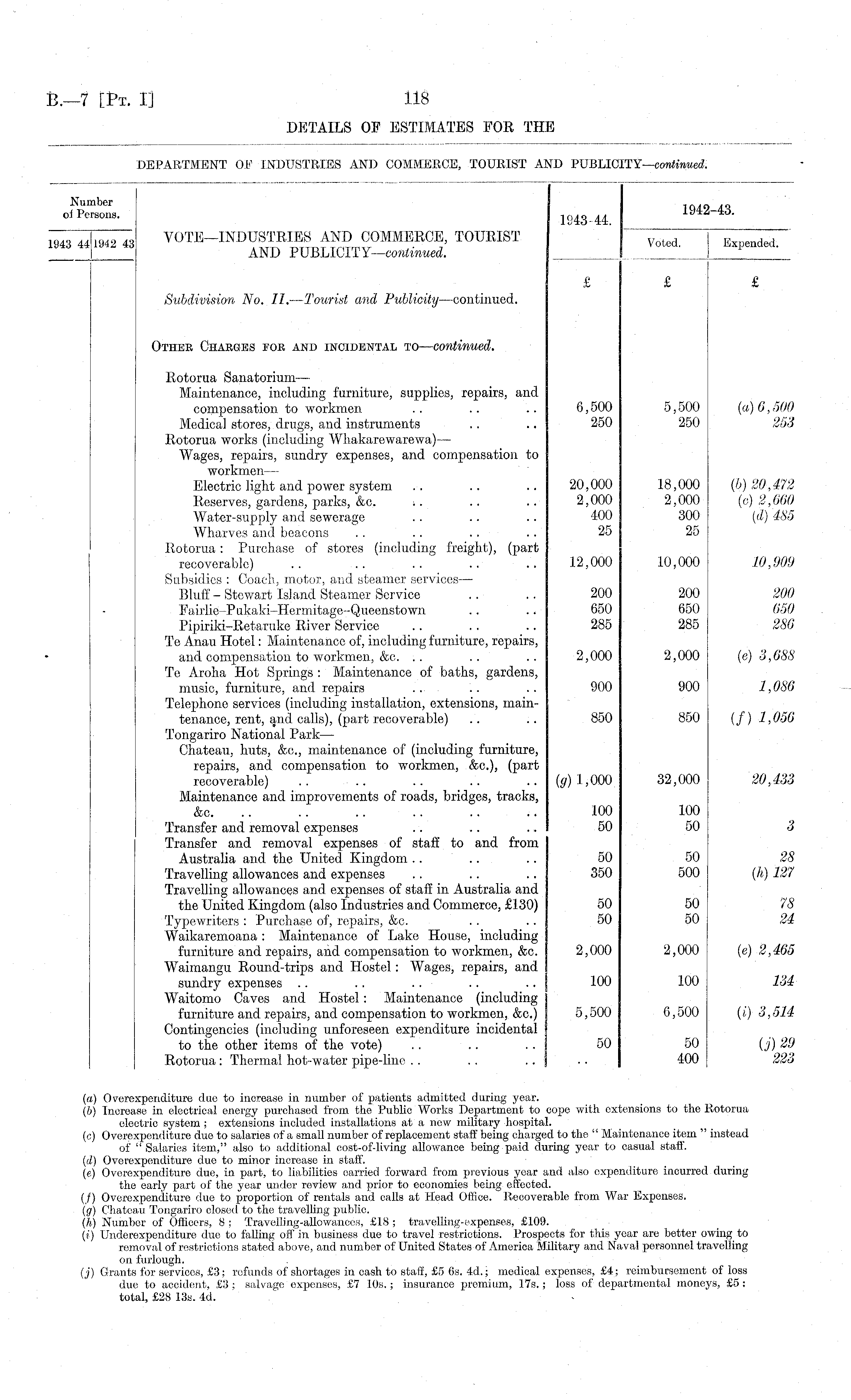 (а) Overexpenditure due to increase in number of patients admitted during year. (б) Increase in electrical energy purchased from the Public Works Department to cope with extensions to the Kotorua electric system ; extensions included installations at a new military hospital. (c) Overexpenditure due to salaries of a small number of replacement staff being charged to the " Maintenance item " instead of " Salaries item," also to additional cost-of-living allowance being paid during year to casual staff. (d) Overexpenditure due to minor increase in staff. (e) Overexpenditure due, in part, to liabilities carried forward from previous year and also expenditure incurred during the early part of the year under review and prior to economies being effected. (/) Overexpenditure due to proportion of rentals and calls at Head Office. Recoverable from War Expenses. (g) Chateau Tongariro closed to the travelling public. (h) Number of Officers, 8 ; Travelling-allowances, £18 ; travelling*expenses, £109. (») Underexpenditure due to falling off in business due to travel restrictions. L'rospeets for this year are better owing to removal of restrictions stated above, and number of United States of America Military and Naval personnel travelling on furlough. (j) Grants for services, £3; refunds of shortages in cash to staff, £5 6s. 4d.; medical expenses, £4; reimbursement of loss due to accident, £3 ; salvage expenses, £7 10s.; insurance premium, 175.; loss of departmental moneys, £5: total, £28 13s. 4d.