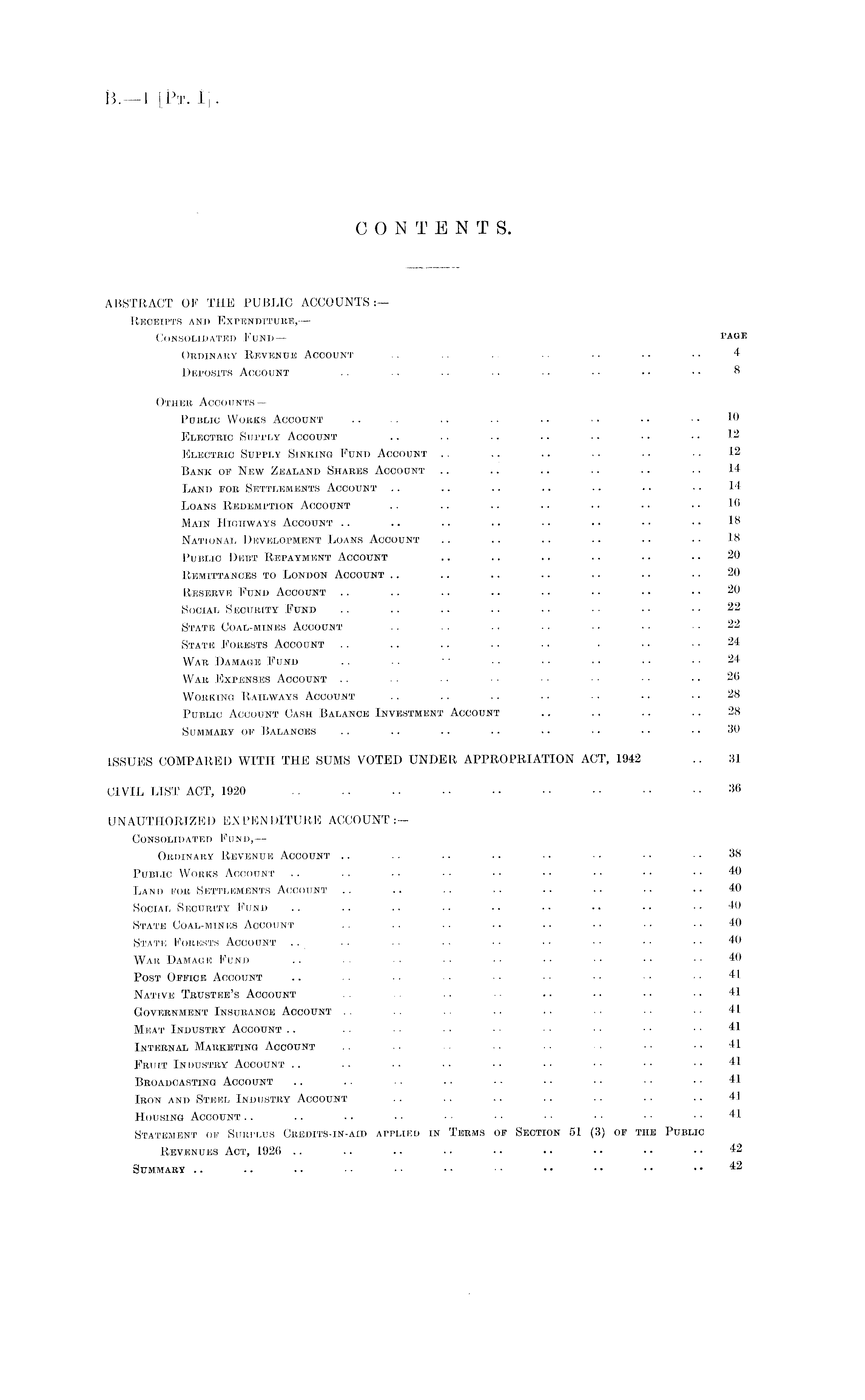 ABSTRACT OF THE PUBLIC ACCOUNTS:— Receipts and Expenditure,— Consolidated Fund — page Ordinary Revenue Account .. .. .. ■. - - • • 4 Deposits Account .. .. .. .. •. • • • • • • 8 Other Accounts — Public Works Account .. .. .. .. .. .. . • • • 10 Electric Supply Account .. .. .. .. ■. • • • • 12 Electric Supply Sinking Fund Account .. .. .. .. .. • • 12 Bank of New Zealand Shaees Account .. .. .. .. • • • • 14 Land eoe Settlements Account .. .. .. .. .. .. ■ ■ 14 Loans Redemption Account .. .. .. .. .. . • • • 16 Main Highways Account .. .. .. .. • • • • • • ■ ■ I 8 National Development Loans Account .. .. .. •. .. ■ • 18 Public Debt Repayment Account .. .. .. .. .. •• 20 Remittances to London Account .. .. .. .. .. ■ • • • 20 Reserve Fund Account .. .. .. .. .. .. • • • • 20 Social Security Fund .. .. .. .. • ■ • • • • ■ • 22 State Coal-mines Account .. .. .. •. ■ • ■ ■ ■ • 22 State Forests Account .. .. .. .. ■. • •• • • 24 War Damage Fund .. .. ■ ■ • • ■ • • • • • • • 24 War Expenses Account .. .. .. ■ • • • • ■ • • • • 26 Working Railways Account .. .. .. . • ■ • • • • • 28 Public Account Cash Balance Investment Account .. .. .. .. 28 Summary of Balances .. .. .. .. • • • • • • • • 30 ISSUES COMPARED WITH THE SUMS VOTED UNDER APPROPRIATION ACT, 1942 .. 31 CIVIL LIST ACT, 1920 .. .. .. • • • • • • • ■ • • • • UNAUTHORIZED EXPENDITURE ACCOUNT :— Consolidated Fund, — Ordinary Revenue Account .. .. .. .. ■ • ■ • ■ • ■ ■ 38 Public Works Account .. .. •. • • • • • • • • • • • • 40 Land for Settlements Account .. .. .. .. • • • • •• • • 40 Social Security Fund .. .. .. .. .. • • • ■ • • • • 40 State Coal-mines Account .. .. .. • • • • • • .... 40 State Forests Account .. .. . • . ■ ■ • • • ■ ■ • • • • 40 War Damage Fund .. . . . . • ■ ■ ■ • • • • • • • • 40 Post Office Account .. ■. • ■ • ■ ■ ■ ■ - • • • 41 Native Trustee's Account .. - • • • • • • ■ • 41 Government Insurance Account .. .. .. .. . ■ ■ ■ ■ ■ •• 41 Meat Industry Account .. .. • • • • ■ ■ ■ • • ■ • • • ■ 41 Internal Marketing Account .. .. .. ■ • ■ • ■ • • • 41 Fruit Industry Account .. .. .. • • • • • • • • • • • • 41 Broadcasting Account .. .. • ■ • • • • ■ • • • ■ ■ • ■ 41 Iron and Steel Industry Account .. .. • • ■ • ■ • • • • • 41 Housing Account .. .. .. • • • • • ■ • • • ■ • • ■ ■ 41 Statement of Surplus Credits-in-aid applied in Terms of Section 51 (3) of the Public Revenues Act, 1926 .. .. .. . • • ■ • • • • • • • • 42 Summary .. .. .. ■ • ■ ■ • • • • • • • • • • • • 42