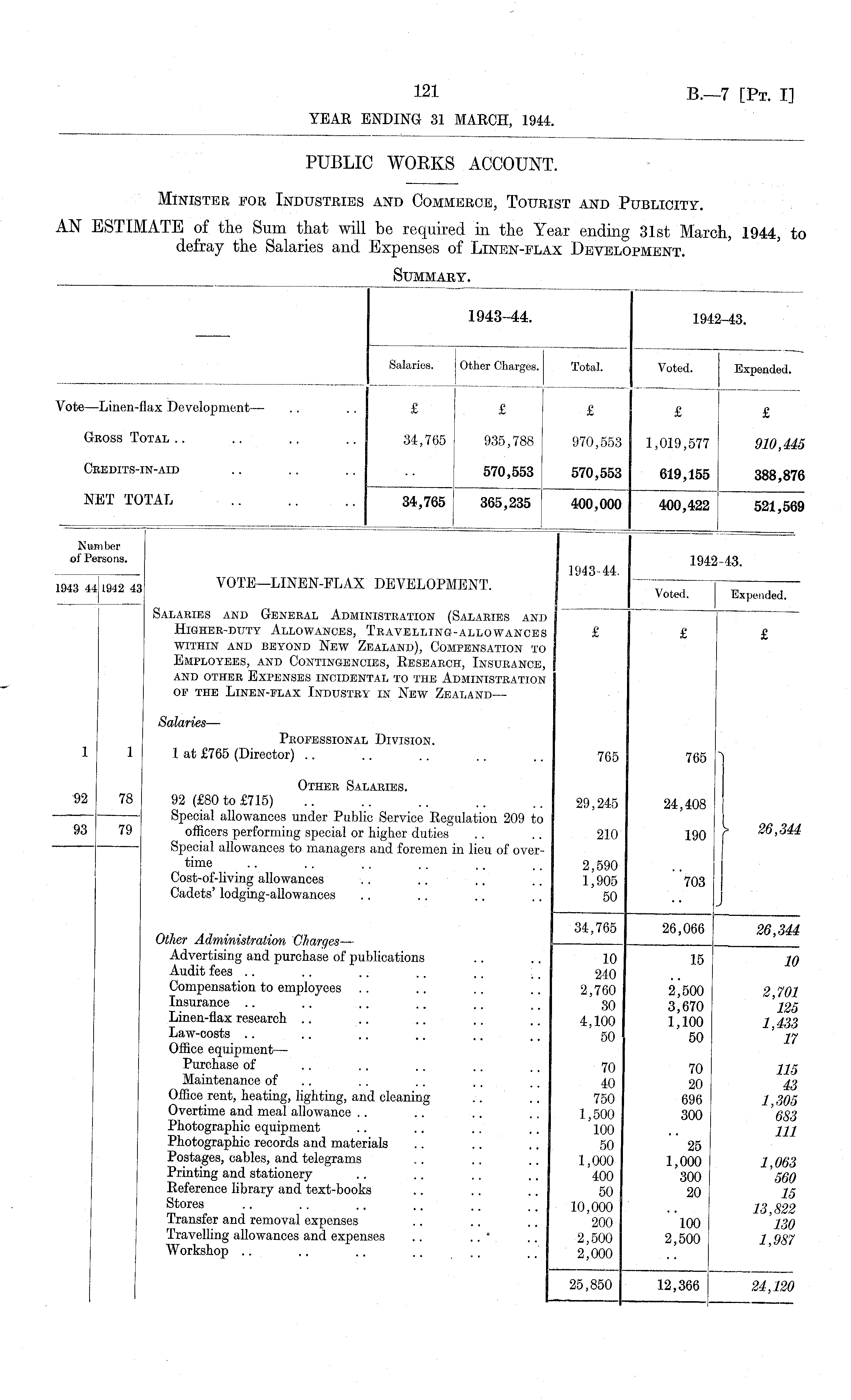 Minister for Industries and Commerce, Tourist and Publicity. AN ESTIMATE of the Sum that will be required in the Year ending 31st March, 1944, to defray the Salaries and Expenses of Linen-flax Development. Summary.