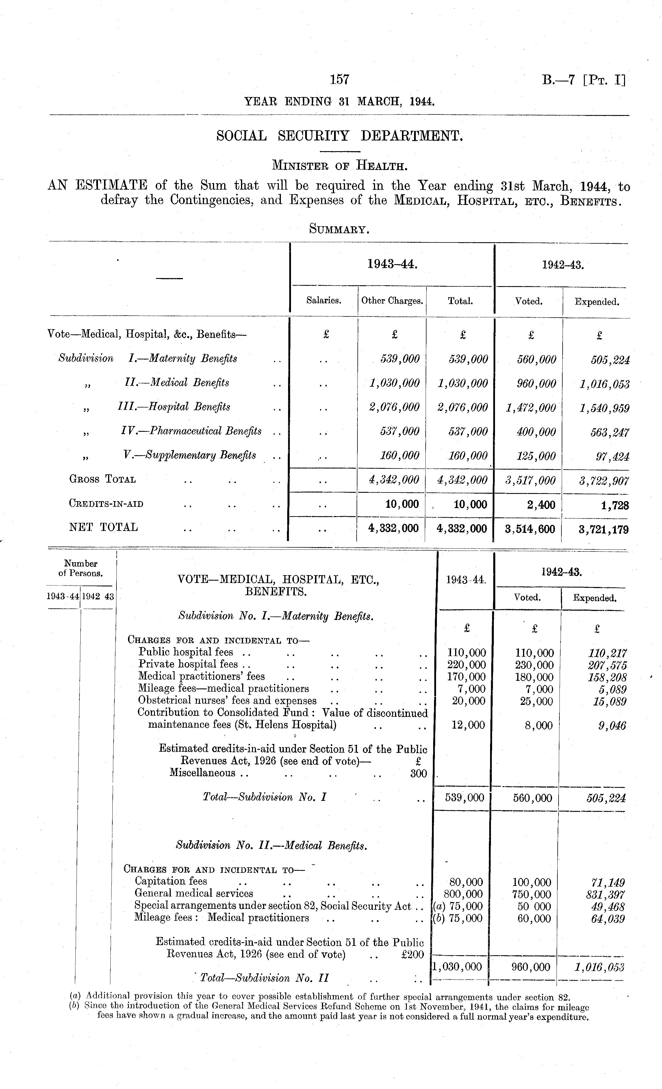 1943-44. 1942-43. Salaries. Other Charges. Total. Voted. Expended. Vote—Medical, Hospital, &c., Benefits— £ £ £ £ £ Subdivision I.—Maternity Benefits .. .. 539,000 539,000 560,000 505,224 „ II.—Medical Benefits .. .. 1,030,000 1,030,000 960,000 1,016,053 „ 111.—Hospital Benefits .. .. 2,076,000 2,076,000 1,472,000 1,540,959 „ IV. —Pharmaceutical Benefits .. .. 537,000 537,000 400,000 563,247 „ V. —Supplementary Benefits .. .. 160,000 160,000 125,000 97,424 GROSS Total .. .. .. .. 4,342,000 4,342,000 3,517,000 3,722,907 CREDITS-IN-AID .. .. .. .. 10,000 10,000 2,400 1,728 NET TOTAL .. 4,332,000 4,332,000 3,514,600 3,721,179 i rf? p Number Of VOTE-MEDICAL, HOSPITAL, ETC., 1943 44. 1942-43. 1943-44 1942 43 BENEFITS. Voted. Expended. Subdivision No. I .—Maternity Benefits. £ £ £ Charges for and incidental ToPublic hospital fees .. .. .. .. .. 110,000 110,000 110,217 Private hospital fees .. .. .. .. .. 220,000 230,000 207,575 Medical practitioners'fees .. .. .. .. 170,000 180,000 158,208 Mileage fees—medical practitioners .. .. .. 7,000 7,000 5,089 Obstetrical nurses'fees and expenses .. .. .. 20,000 25,000 15,089 Contribution to Consolidated Fund : Value of discontinued maintenance fees (St. Helens Hospital) .. .. 12,000 8,000 9,046 Estimated credits-in-aid under Section 51 of the Public Revenues Act, 1926 (see end of vote) — £ Miscellaneous .. .. .. .. 300 . Total-Subdivision No. I .. .. 539,000 560,000 505,224 Subdivision No. II. —Medical Benefits. Charges for and incidental to — Capitation fees .. .. .. .. .. 80,000 100,000 71,149 General medical services .. .. .. 800,000 750,000 831,397 Special arrangements under section 82, Social Security Act .. (a) 75,000 50 000 49,468 Mileage fees: Medical practitioners .. .. .. (6) 75,000 60,000 64,039 Estimated credits-in-aid under Section 51 of the Public Revenues Act, 1926 (see end of vote) .. £200 — 1,030,000 960,000 1,016,053 j | Total—Subdivision No. II .. - j — —